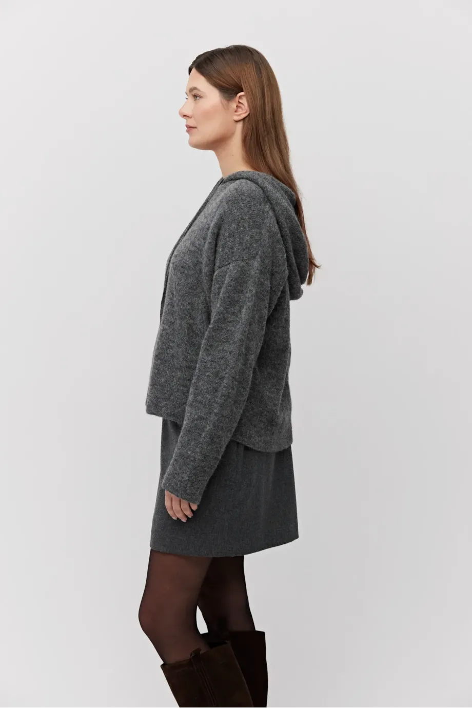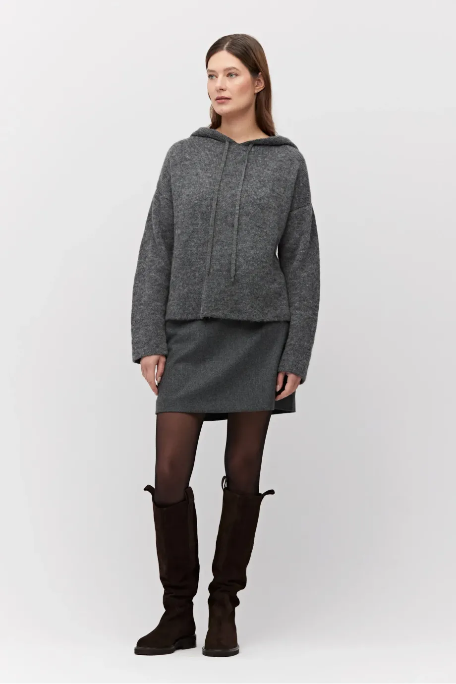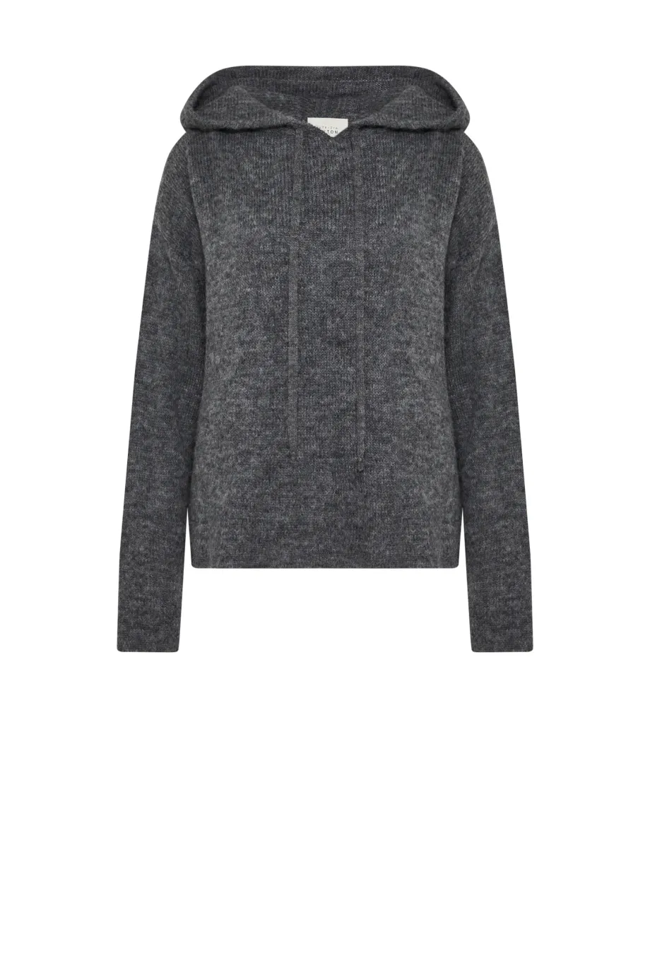 Mikina s kapucí z vlny baby alpaky. Masivní, teplá pletenina s volnou vazbou double sided knit, vyrobená na stroji s uiglením 5 GG. Jednoduchý střih, dlouhý rukáv, nastavitelná kapuce. Barva tmavě šedá.
