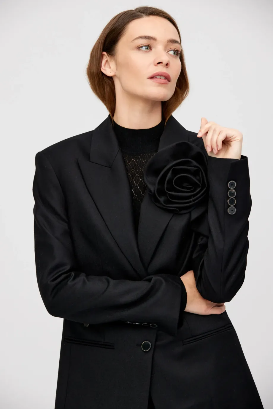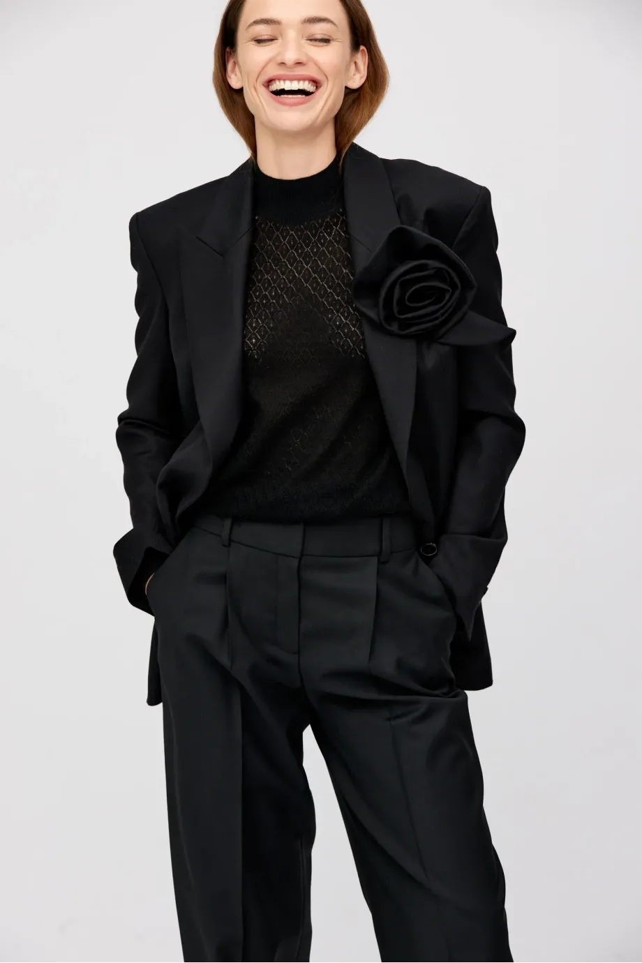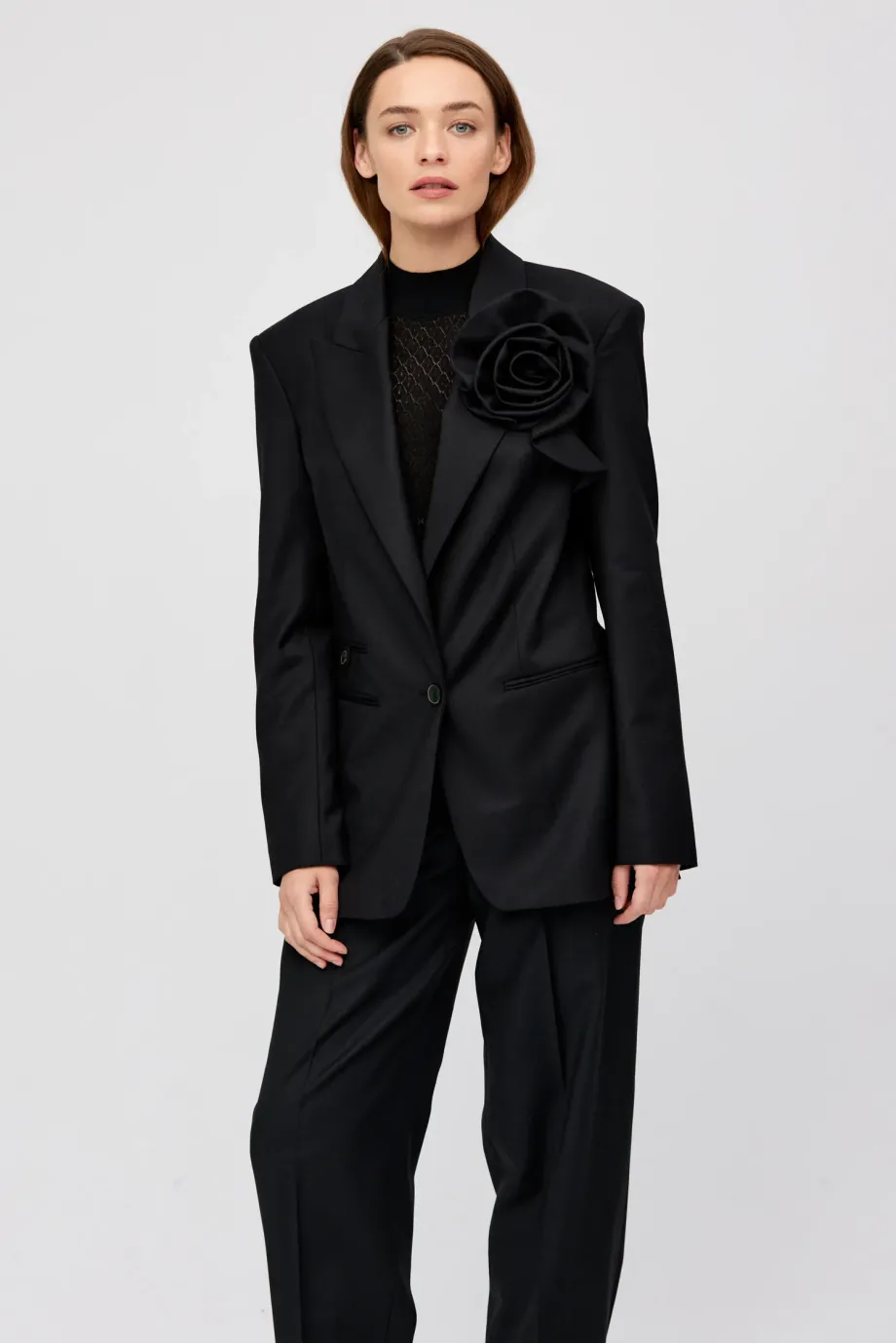 Sako k obleku z jehněčí vlny. Zapínání na knoflík, mírně zúžené, se zvýrazněnou linií ramen. Dlouhý rukáv. Model na podšívce, s ozdobným lemováním. Barva černá. V sadě odnímatelné květiny. K doplnění stylizace kalhoty ze stejné tkaniny.