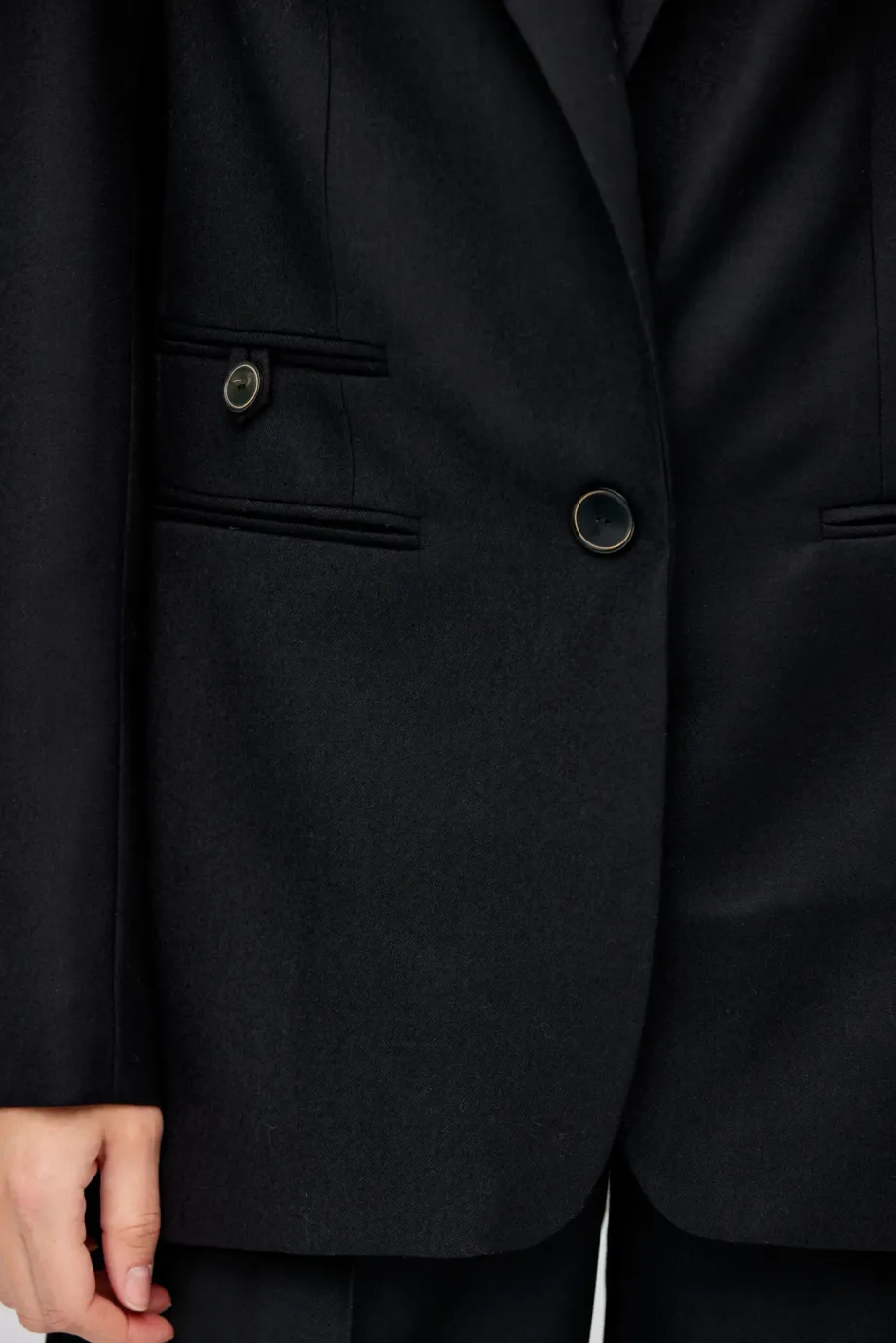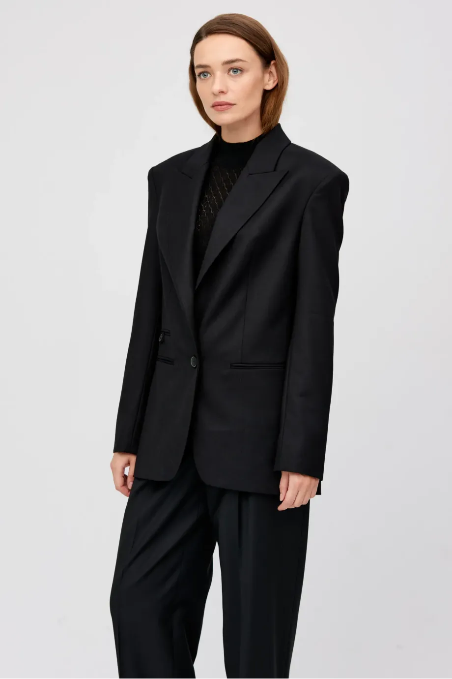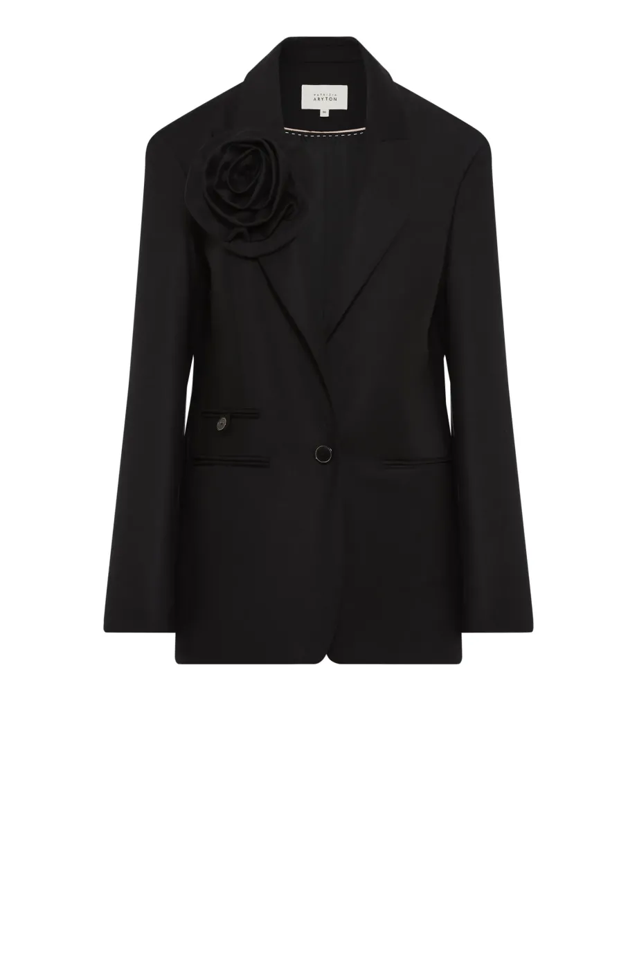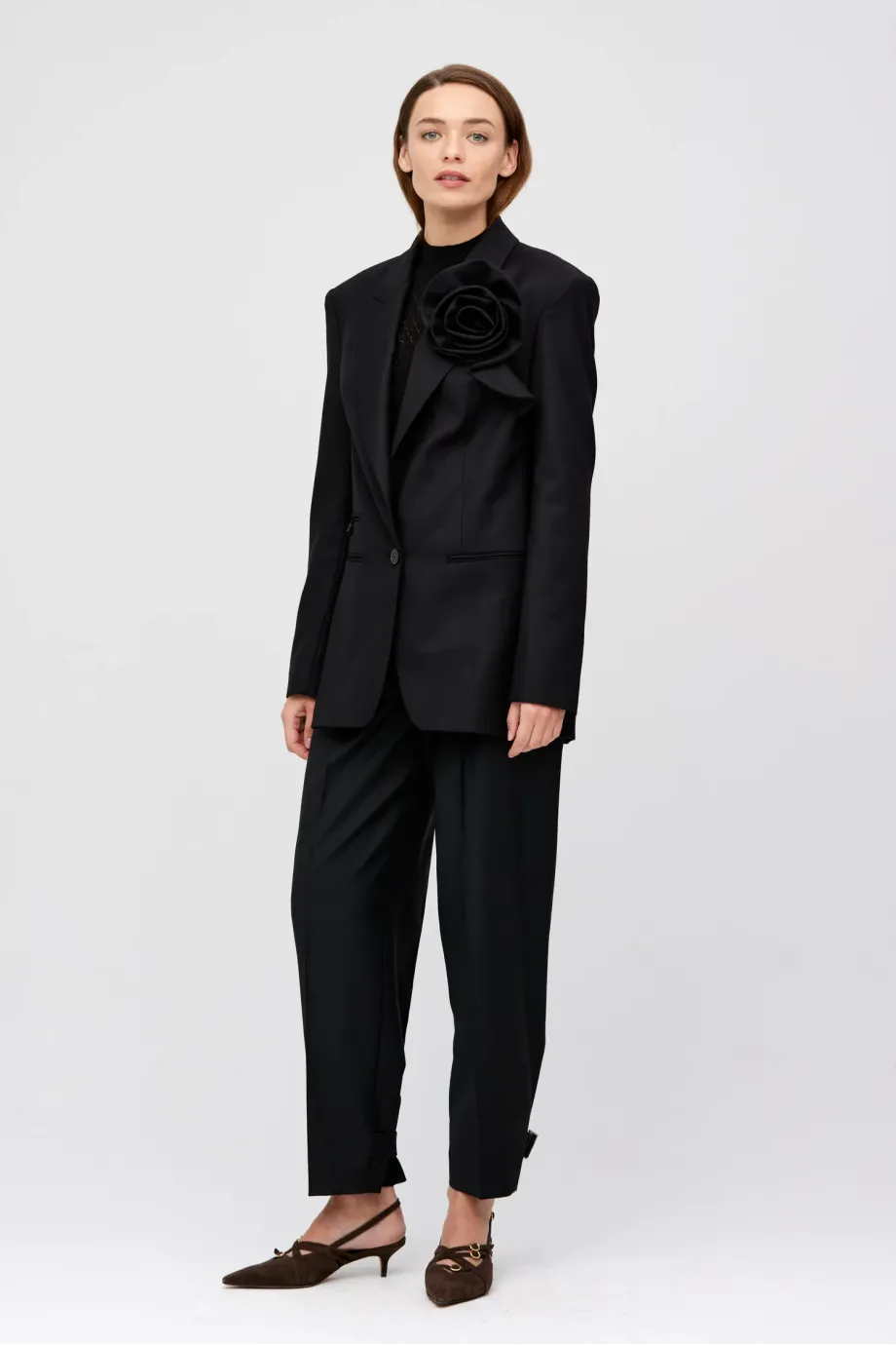 Sako k obleku z jehněčí vlny. Zapínání na knoflík, mírně zúžené, se zvýrazněnou linií ramen. Dlouhý rukáv. Model na podšívce, s ozdobným lemováním. Barva černá. V sadě odnímatelné květiny. K doplnění stylizace kalhoty ze stejné tkaniny.