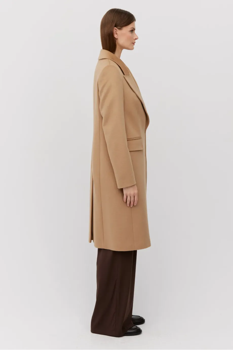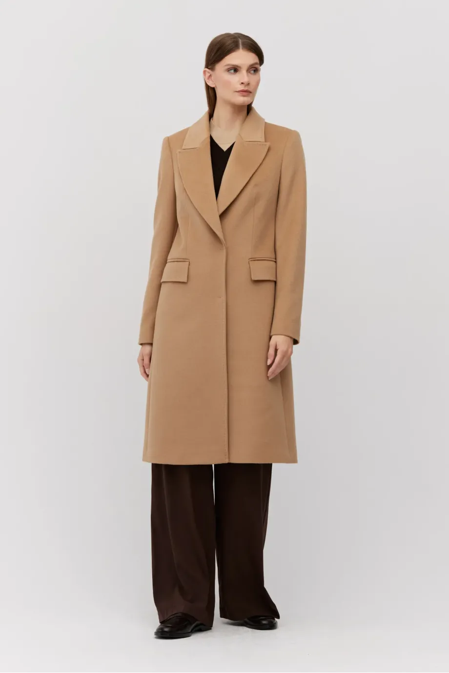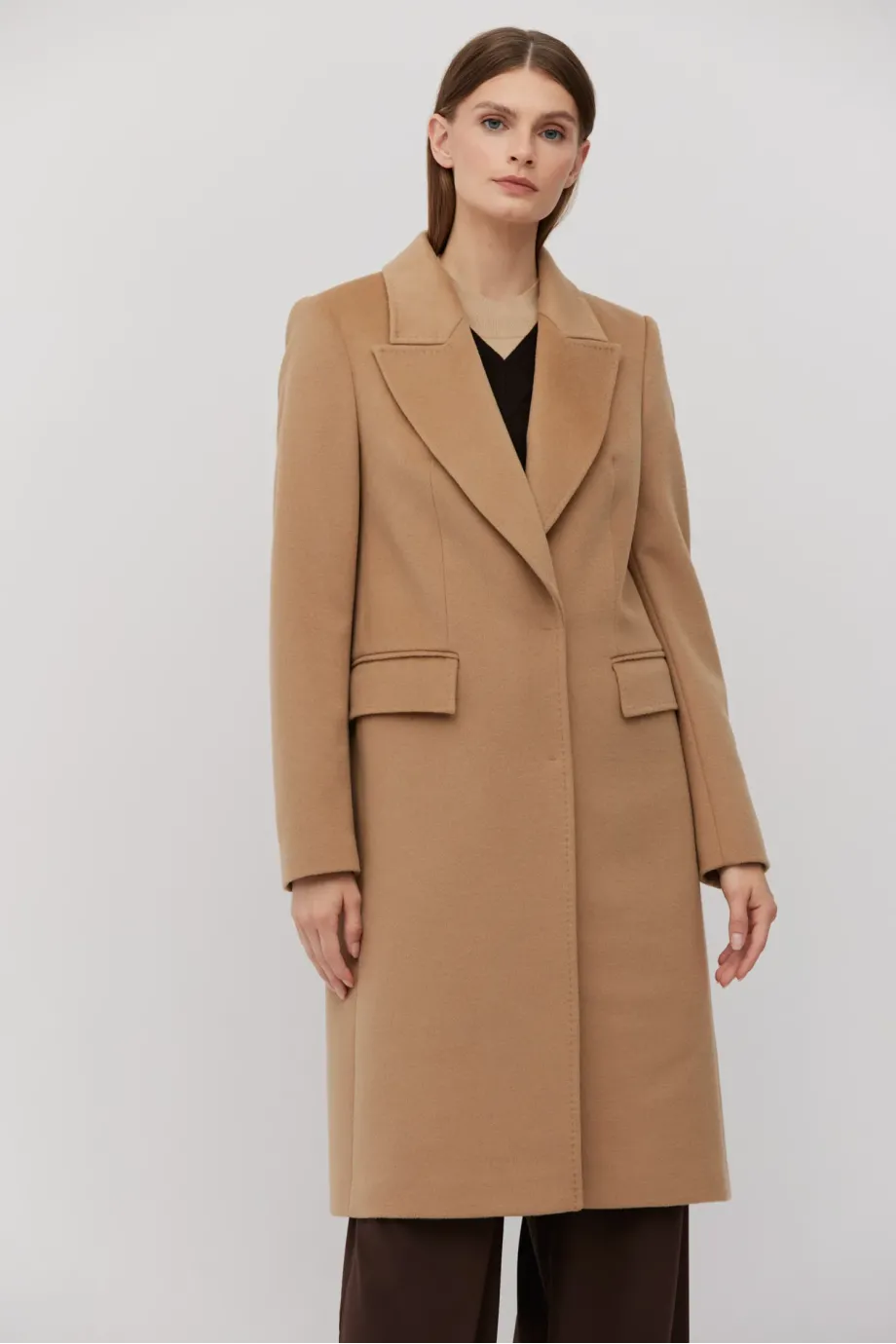 Kabát diplomatka v barvě camel, na podšívce, s těsnějším střihem. Jednoduchý, midi délky, s velkým límcem, kapsami a vsazeným rukávem. Vnitřek zdobený ozdobným páskem.