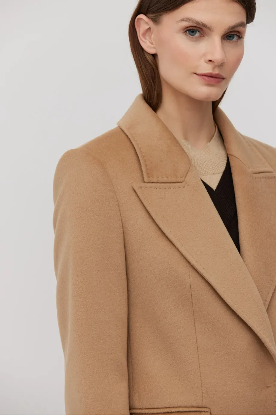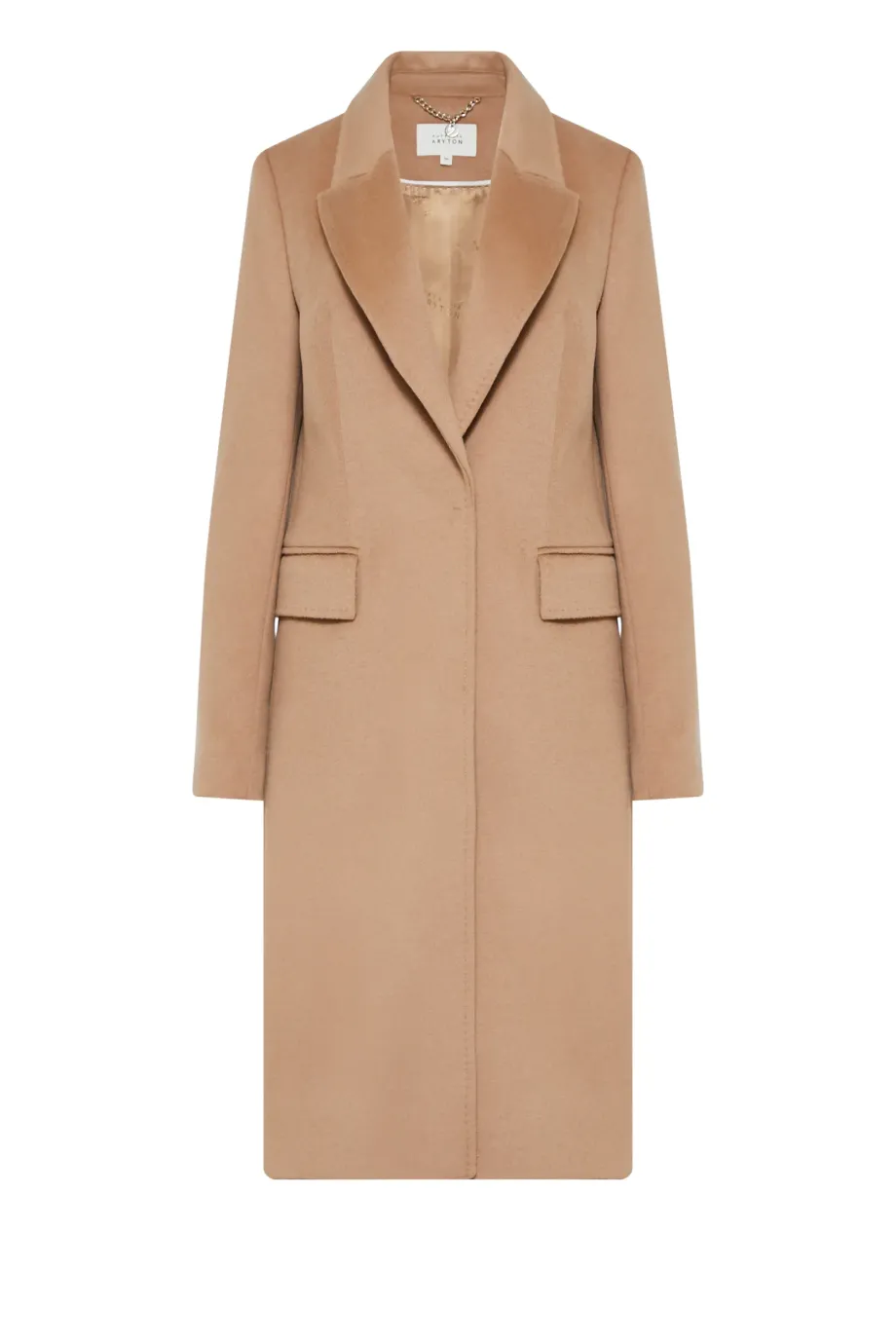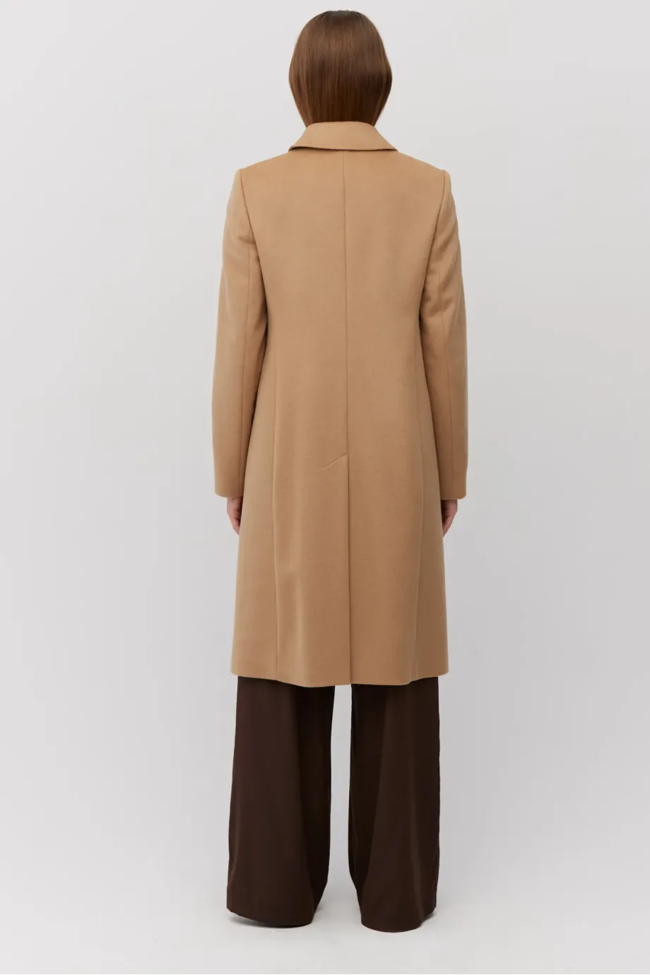 Kabát diplomatka v barvě camel, na podšívce, s těsnějším střihem. Jednoduchý, midi délky, s velkým límcem, kapsami a vsazeným rukávem. Vnitřek zdobený ozdobným páskem.