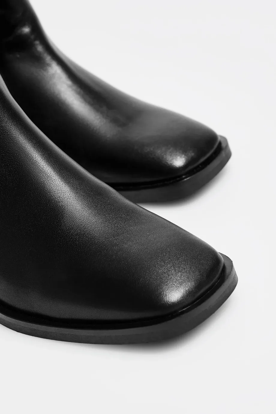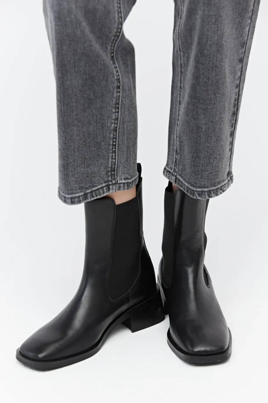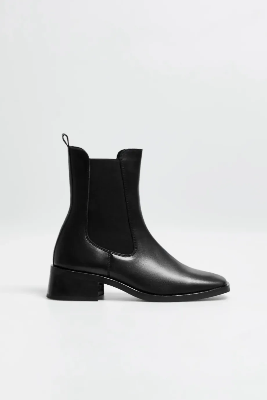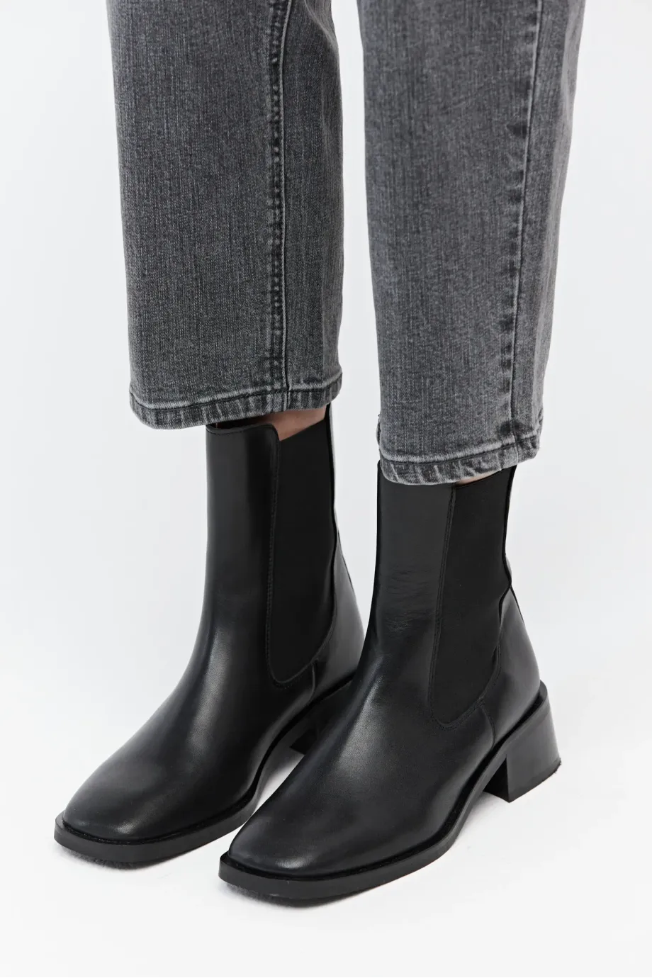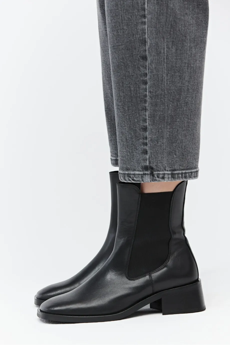 Černé boty s čtveratou špičkou. Vysoký svršek z hladké kůže, nízký podpatek. Po stranách elastická páska. Ručně šité v portugalské manufaktuře.