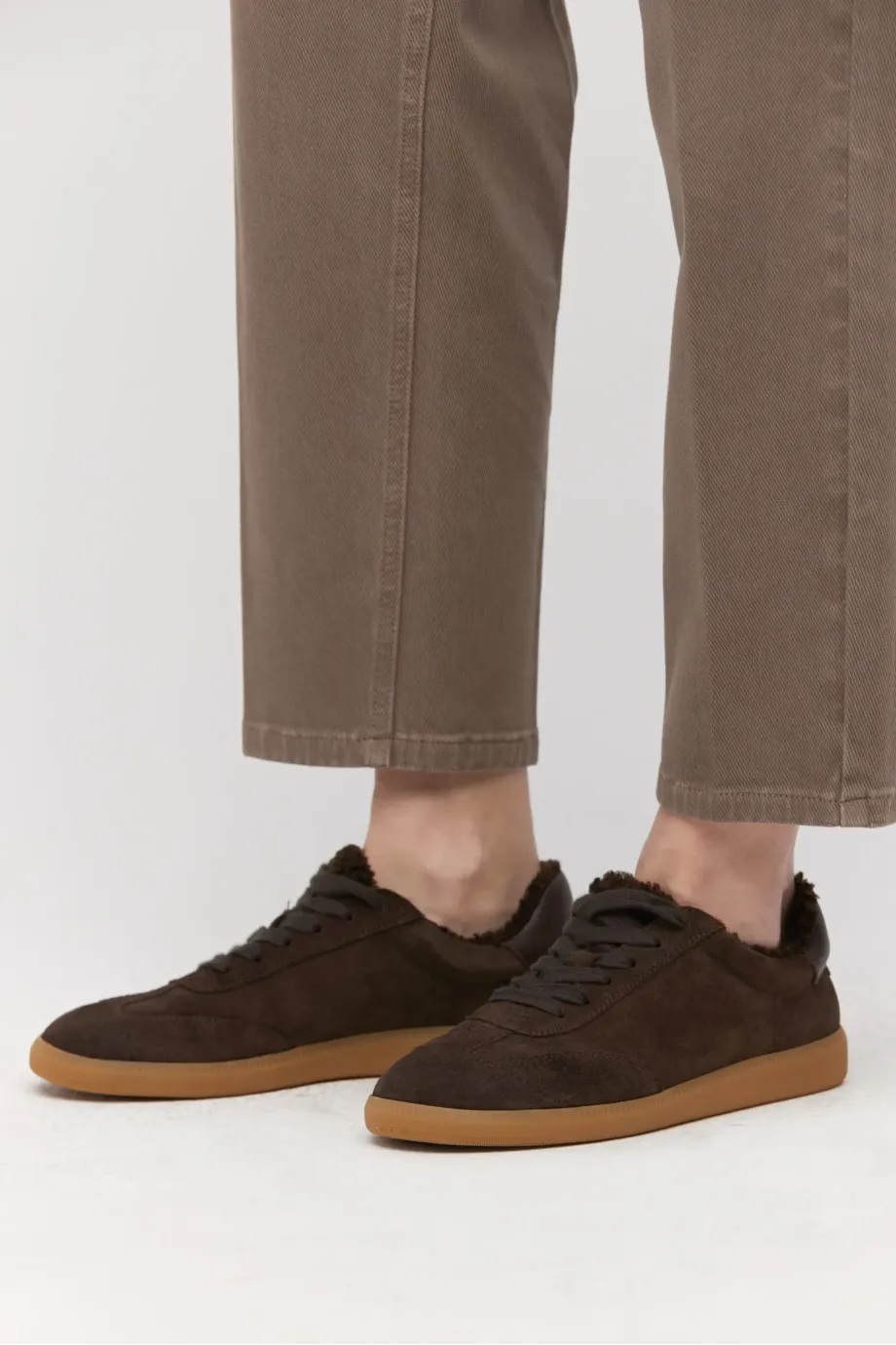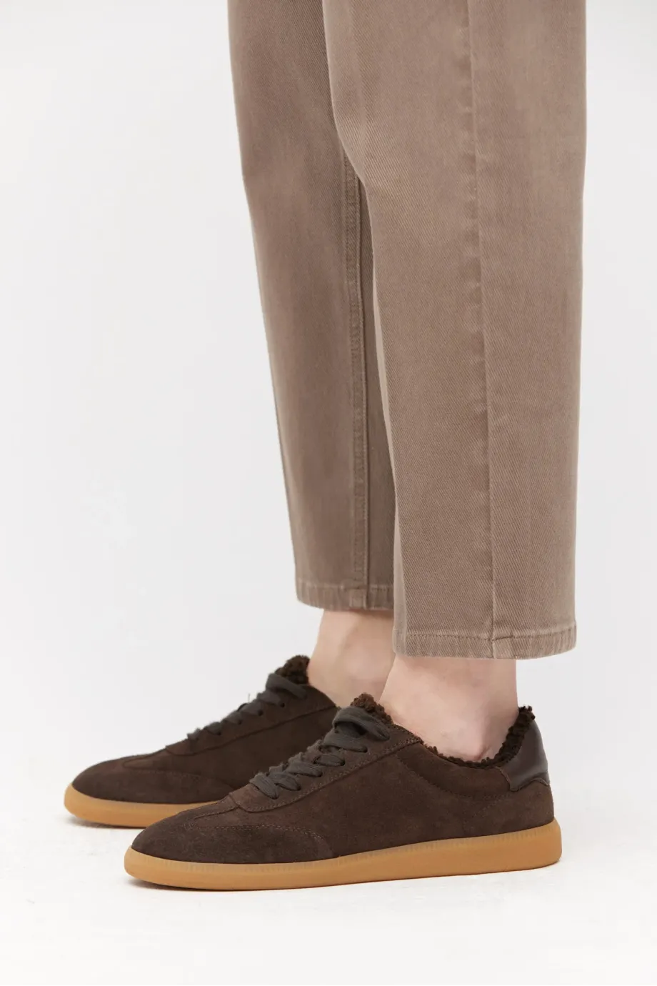 Semišové tenisky s teplou podšívkou z měkkého kožíšku, ručně vyrobené v portugalské manufaktuře z nejkvalitnější přírodní kůže. Klasické šněrování. Barva hnědá.