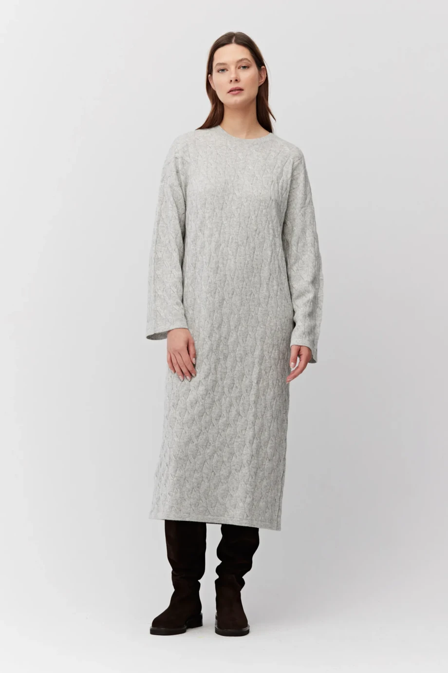 Šedé šaty z merino vlny a kašmíru. Dlouhý rukáv, kulatý výstřih. Midi délka. Měkká pletenina s jemným propletením cable knit, připravená na stroji s uiglením 12 GG.