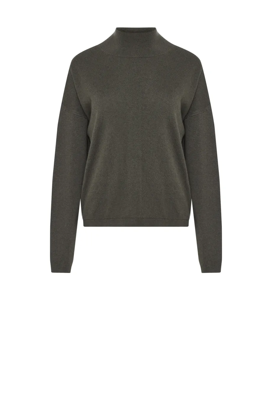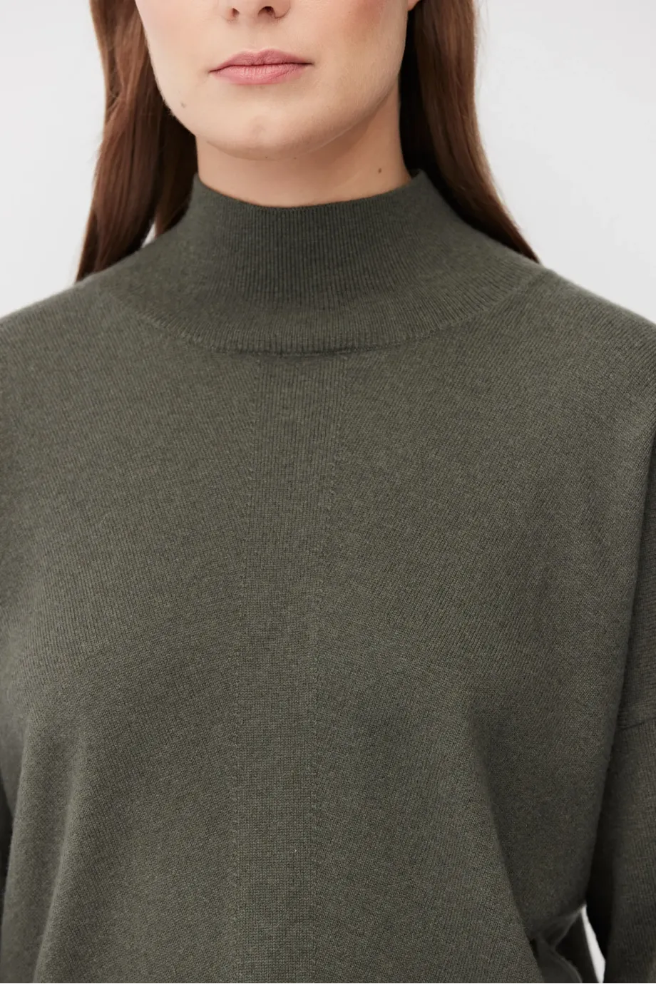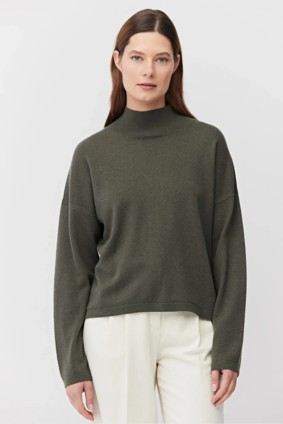 Zelený svetr s merinovými vlnami a kašmírem. Rolák, dlouhý rukáv, volný střih. Měkká pletenina s úpletem jersey knit, připravená na stroji s upletem 12 GG.