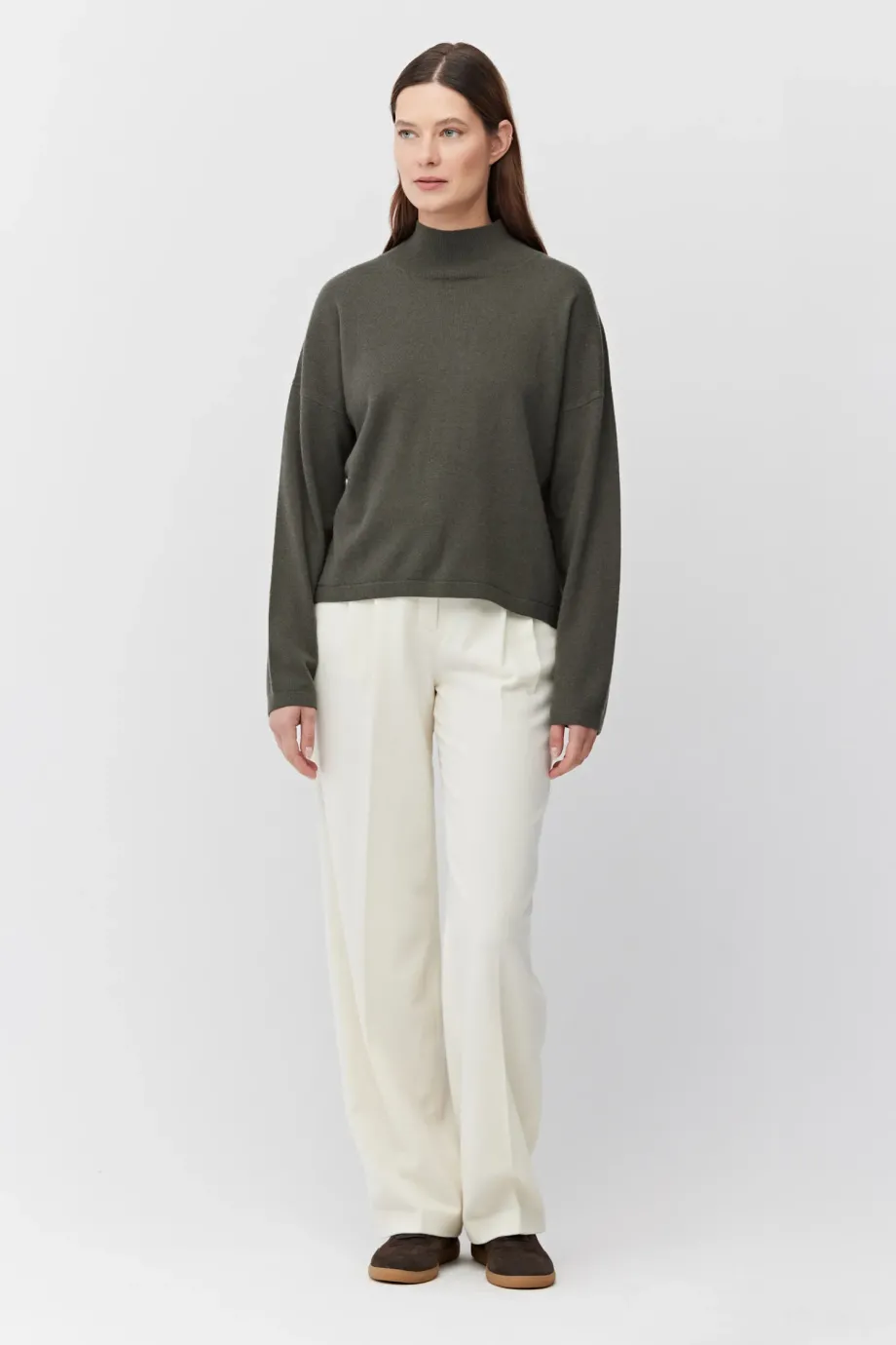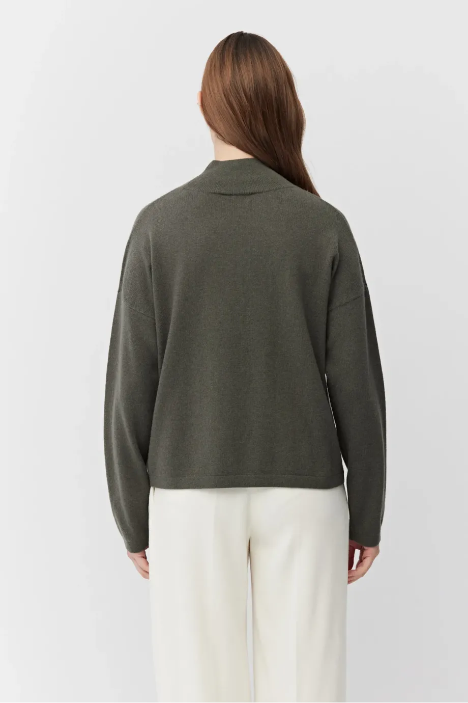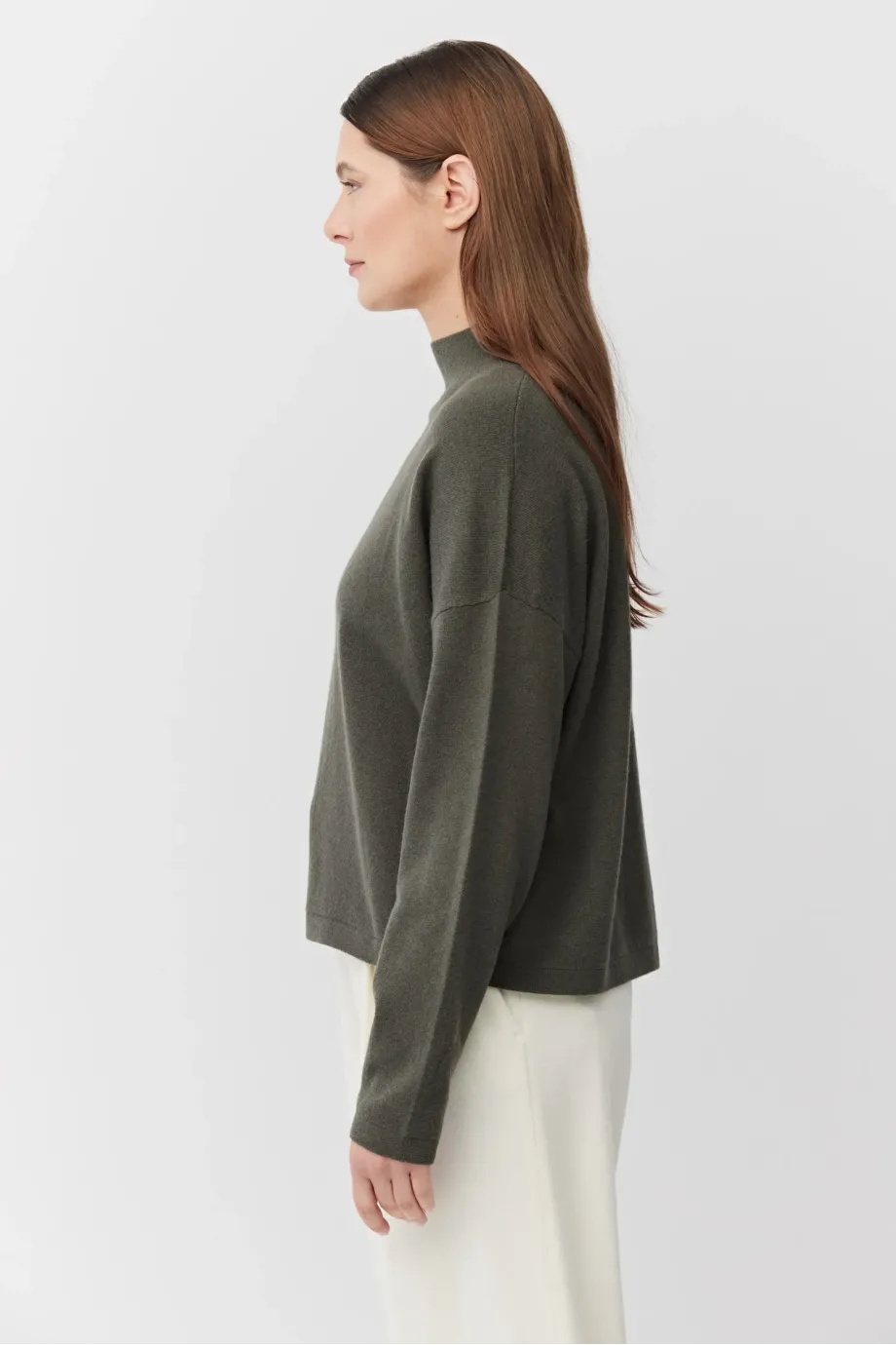 Zelený svetr s merinovými vlnami a kašmírem. Rolák, dlouhý rukáv, volný střih. Měkká pletenina s úpletem jersey knit, připravená na stroji s upletem 12 GG.