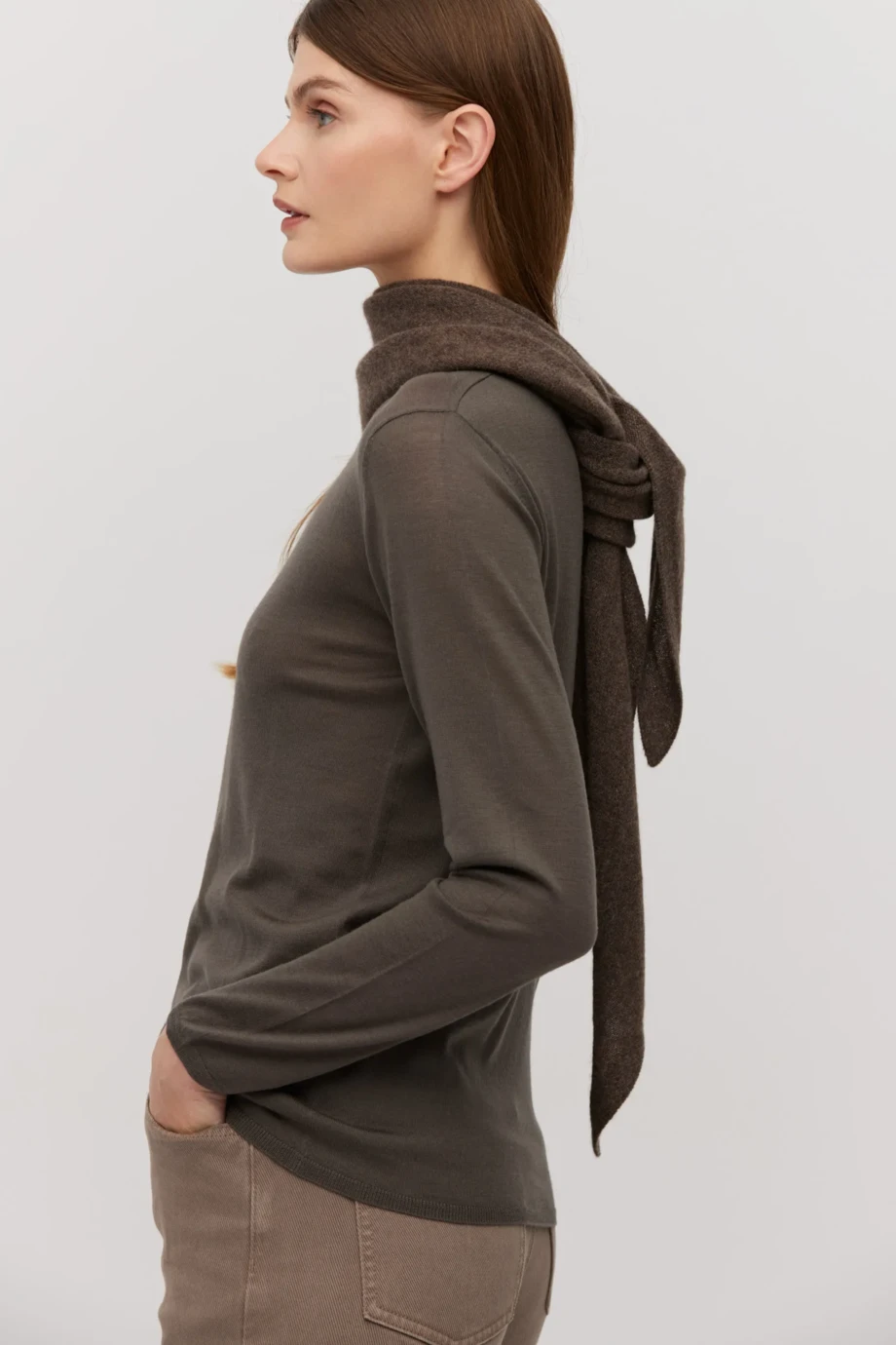 Halenka top z merino vlny. Kulatý výstřih, dlouhý rukáv, střih blíže k tělu. Pletenina s velmi jemným úpletem single jersey, vyrobená na stroji s uiglením 18 GG. Barva hnědá.