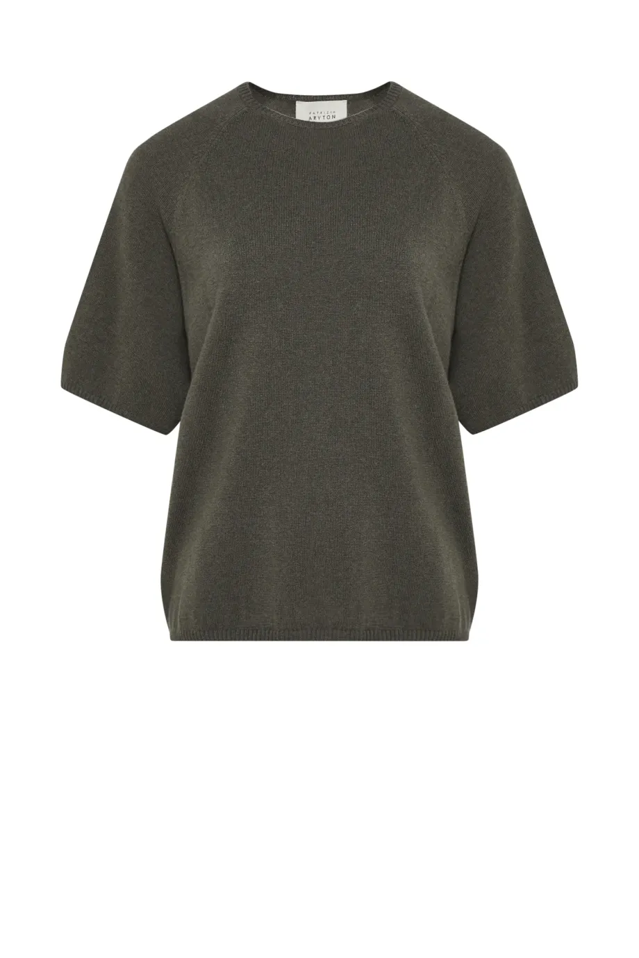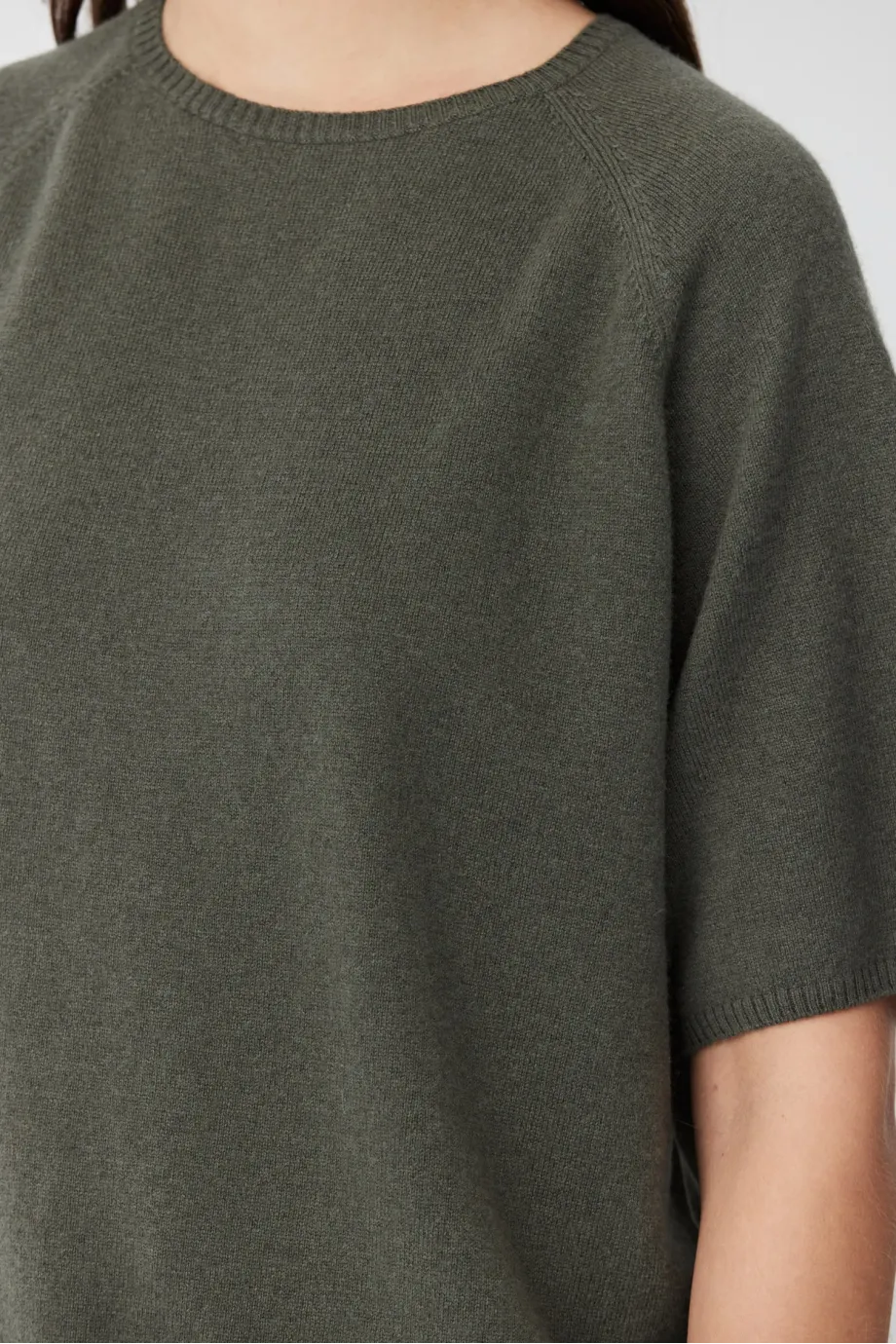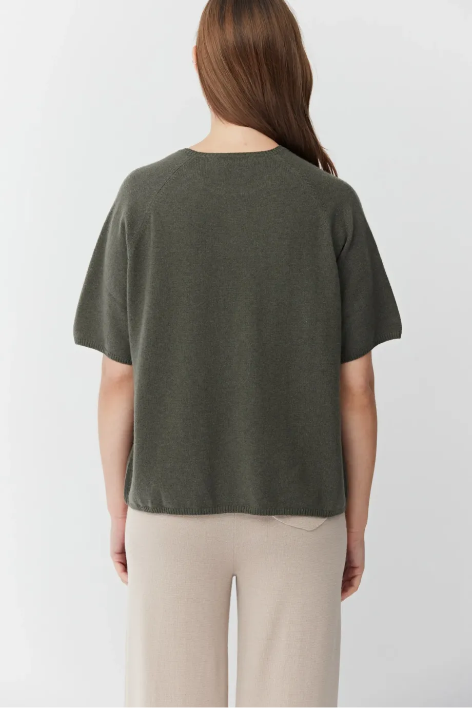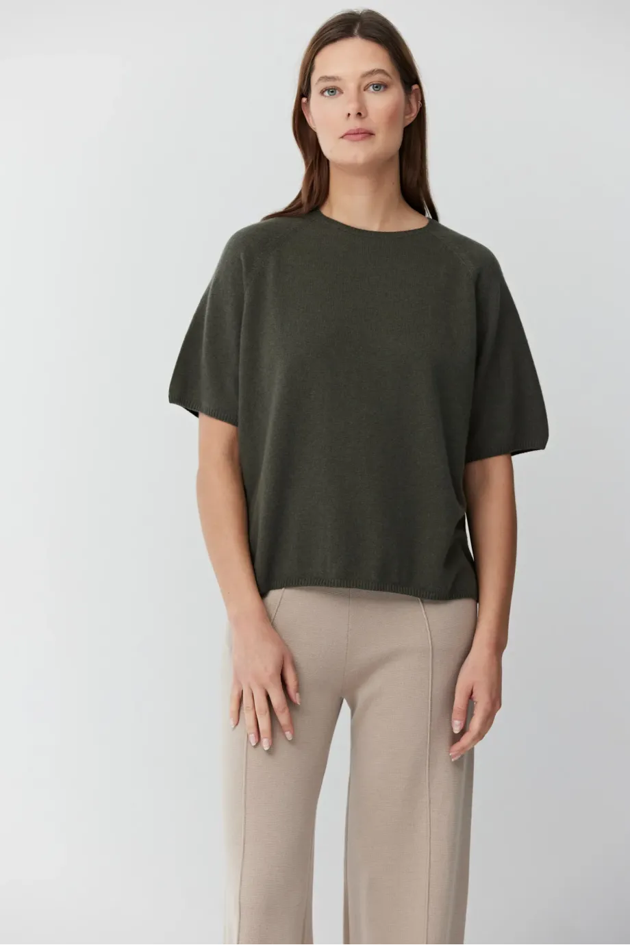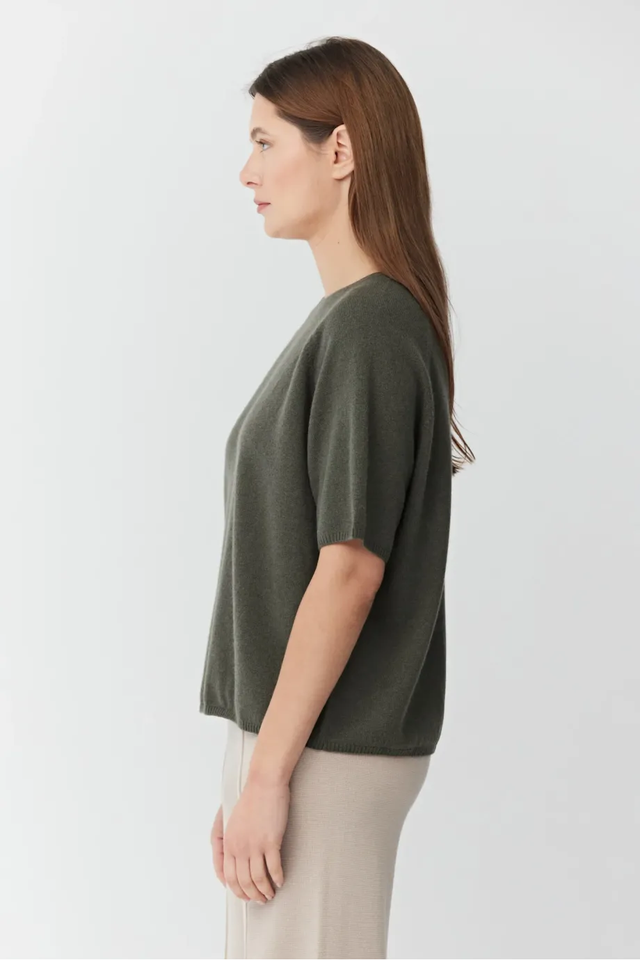 Halenka z merino vlny a kašmíru. Jednoduchý, volný střih s krátkým rukávem. Pletenina se stehem jersey knit, vyrobená na stroji s jemností 14 GG. Zelená barva.