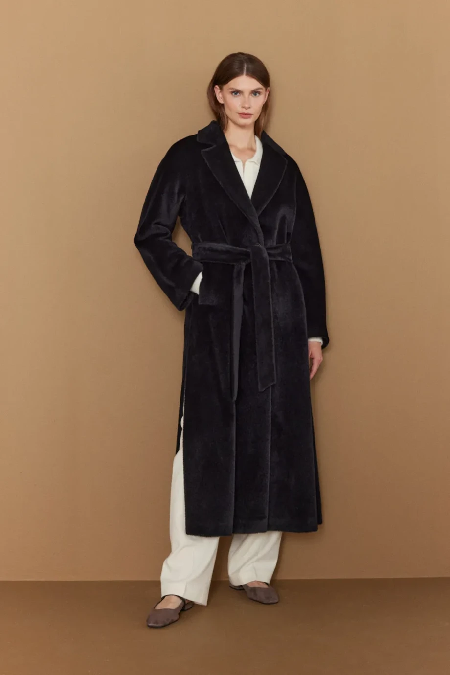 Černý midi kabát s páskem z suri alpaky