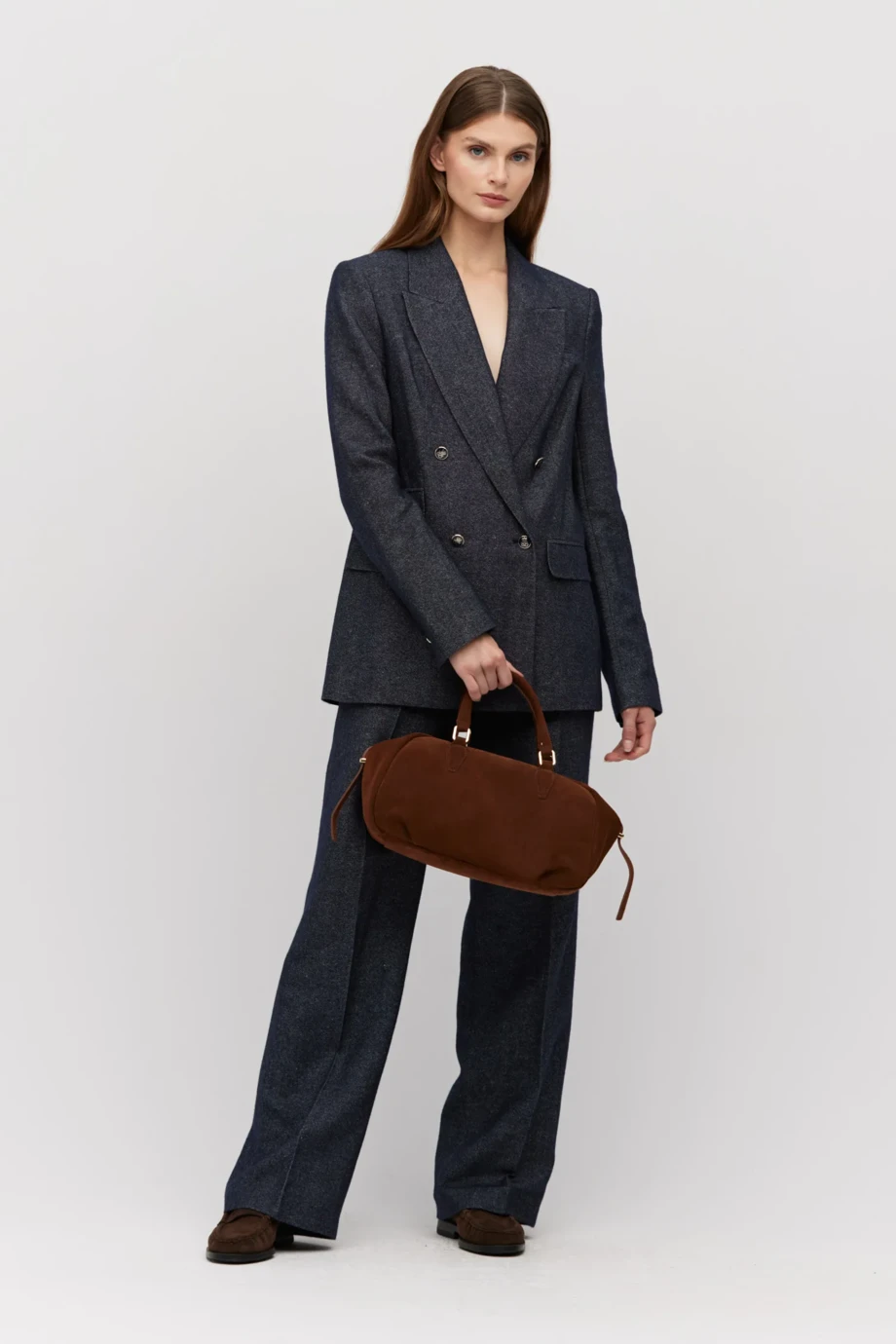 Kalhoty oblekové z směsi jemné vlny, lnu a kašmíru. Široké nohavice, poutka, látkový pásek s kovovou přezkou a vnitřní knoflík z přírodního ořechu. Kapsy. Vnitřek dokončený ozdobným lemováním.