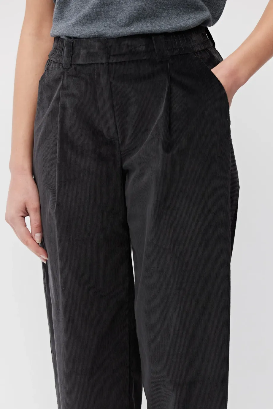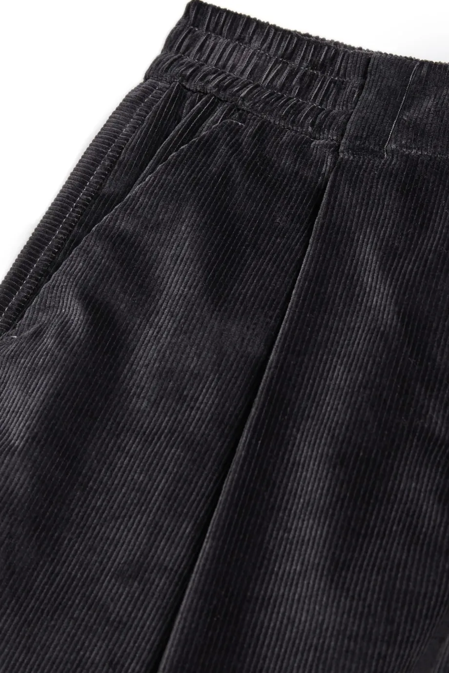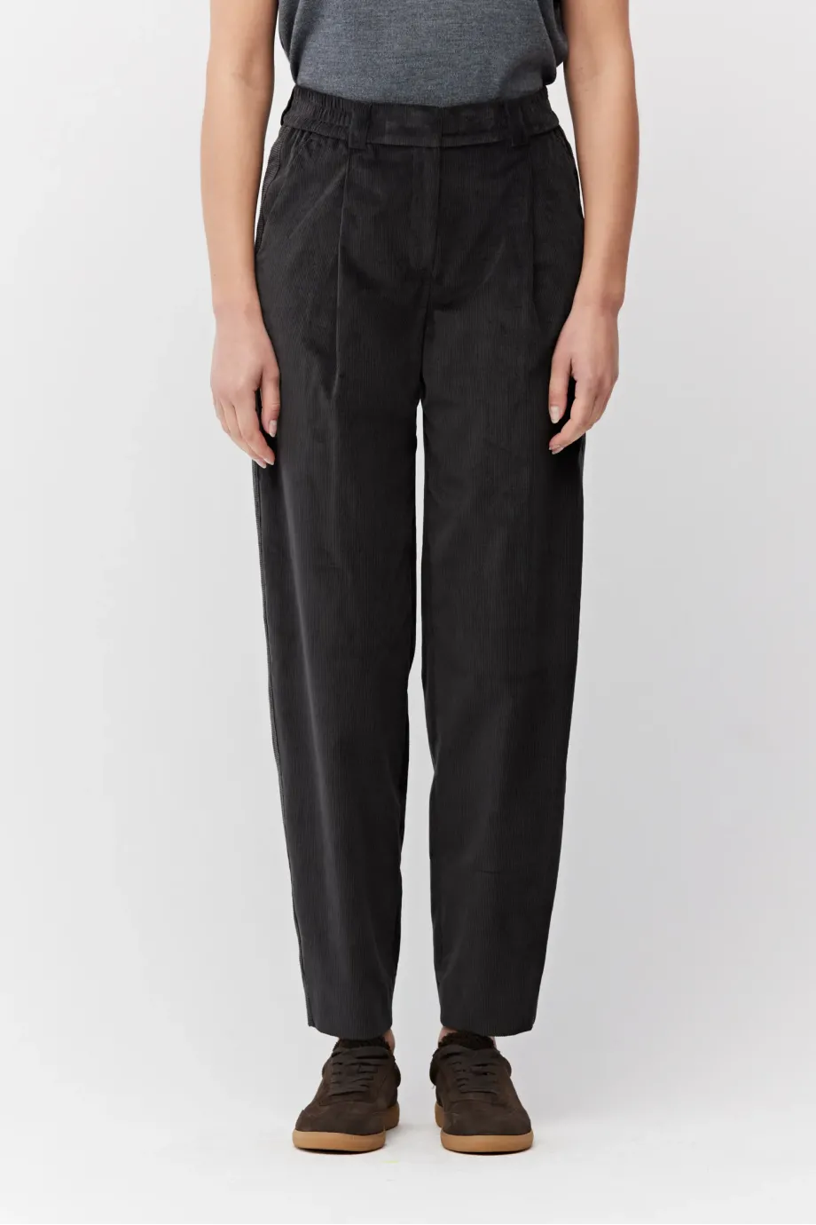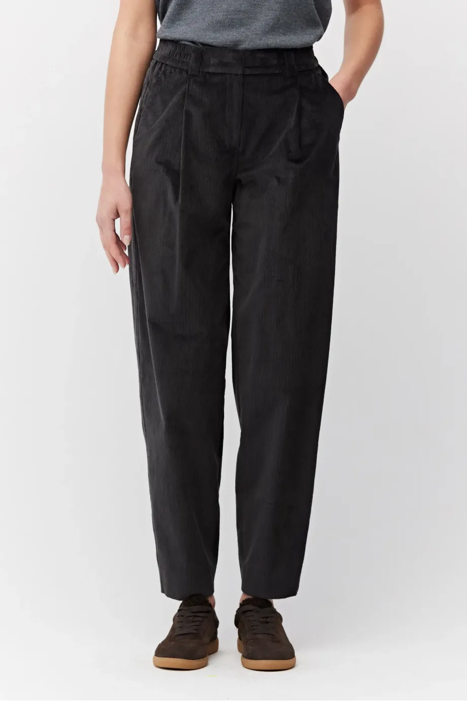 Kalhoty z měkké kordurové tkaniny. Barva tmavě šedá. Zúžený střih nohavic, elastický pás vzadu. Boční kapsy, vnitřní ozdobné detaily. Zapínání na ocelový háček a knoflík z přírodního ořechu corozo. Vyrobeno z bavlny.