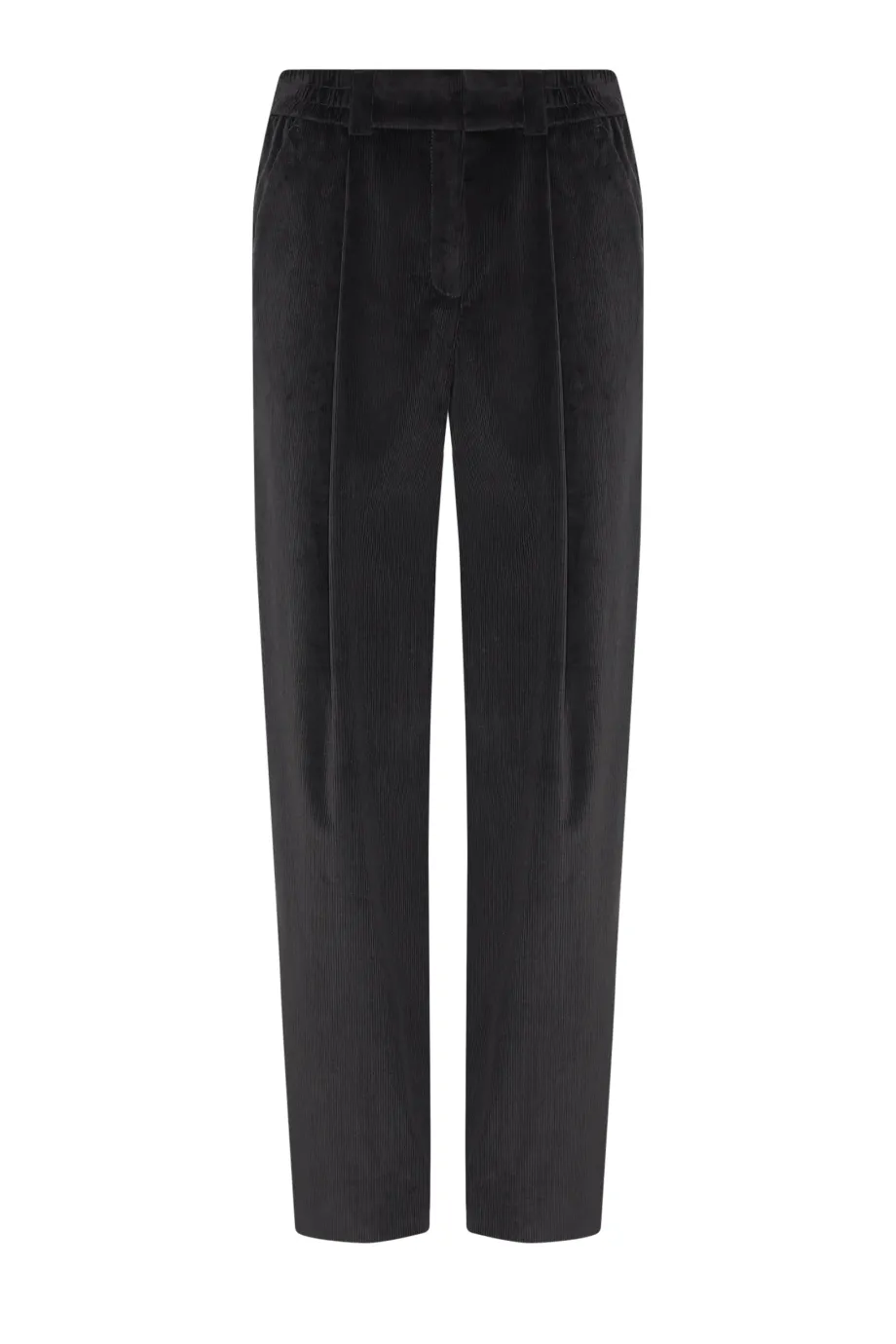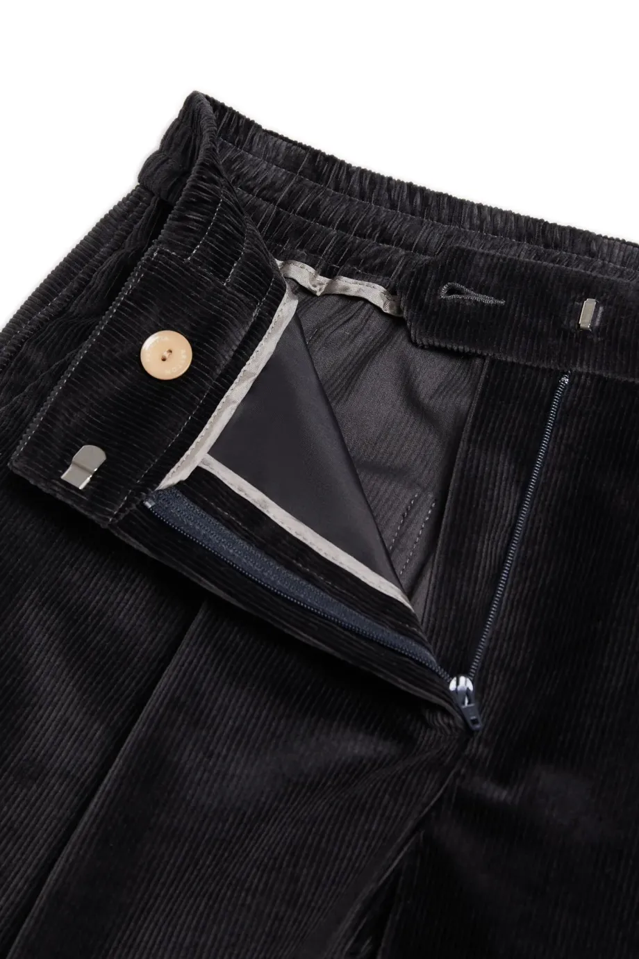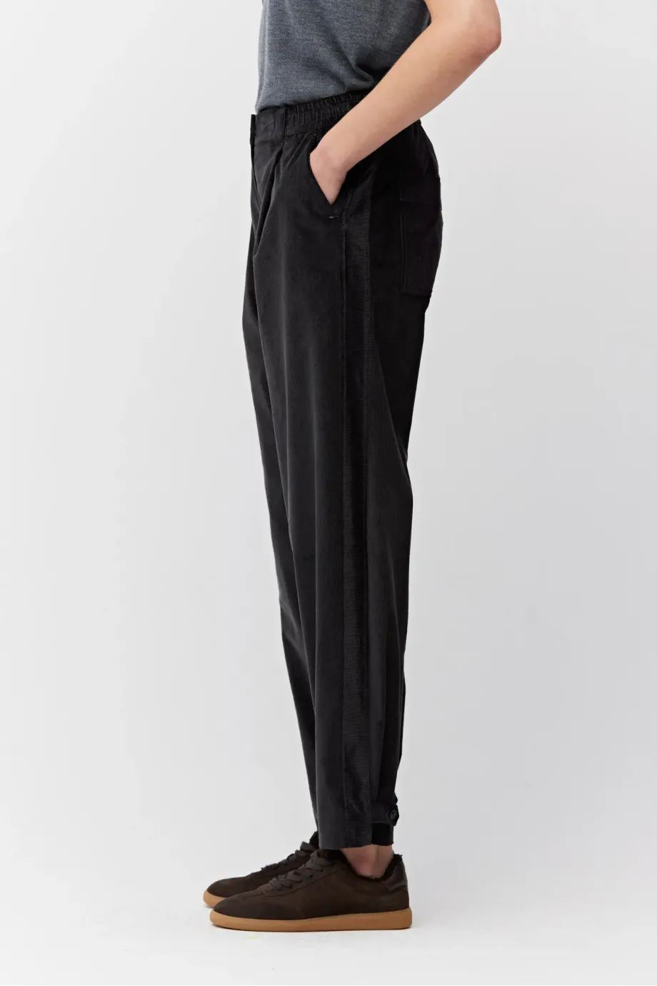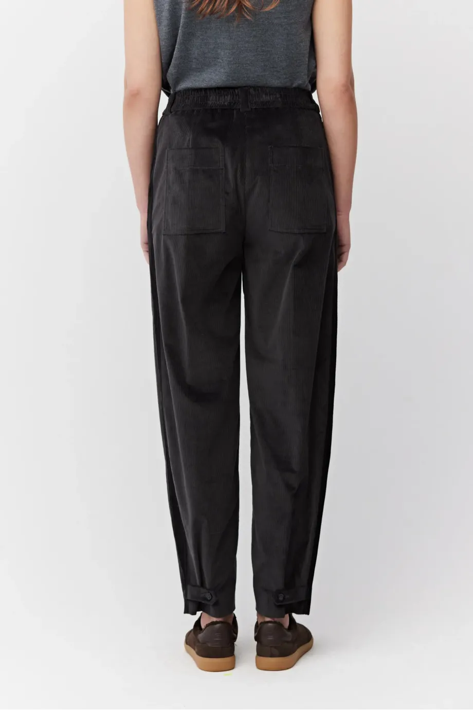Kalhoty z měkké kordurové tkaniny. Barva tmavě šedá. Zúžený střih nohavic, elastický pás vzadu. Boční kapsy, vnitřní ozdobné detaily. Zapínání na ocelový háček a knoflík z přírodního ořechu corozo. Vyrobeno z bavlny.