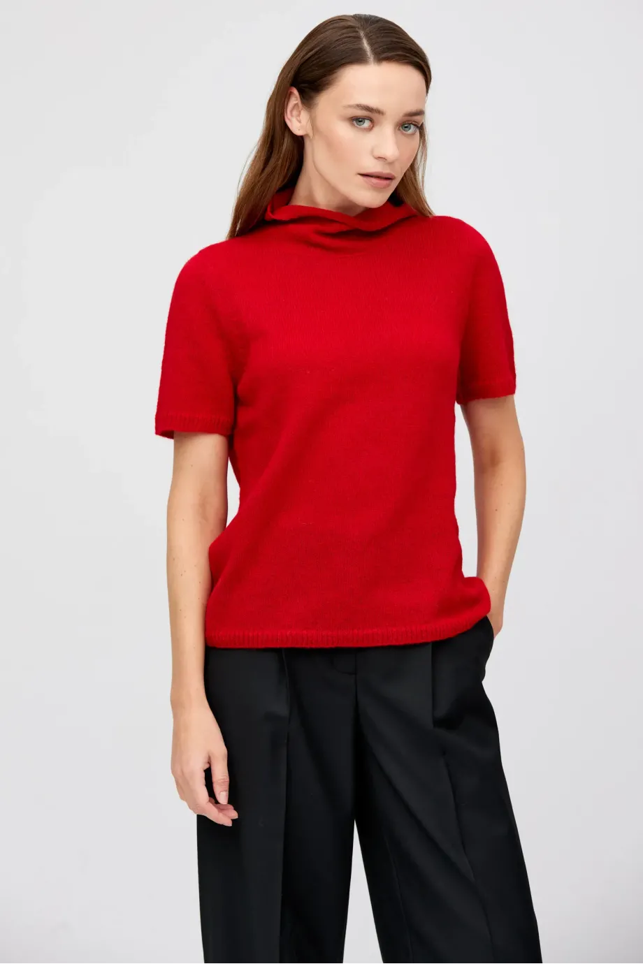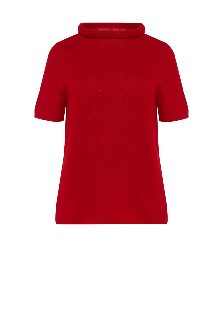 Půlgolf z vlny baby alpaky. Krátký rukáv, jednoduchý střih. Měkká, teplá pletenina s volným úpletem single jersey, vyrobená na stroji s uiglením 5 GG. Barva červená.