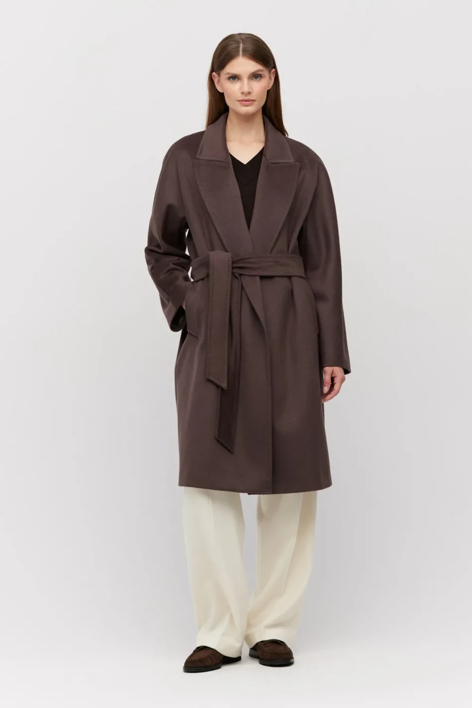 Vlněný kabát v hnědé barvě, zapínaný na pásek, s kapsami a délku po kolena. Na podšívce, se zdobným dokončením interiéru - lemováním a prošíváním.