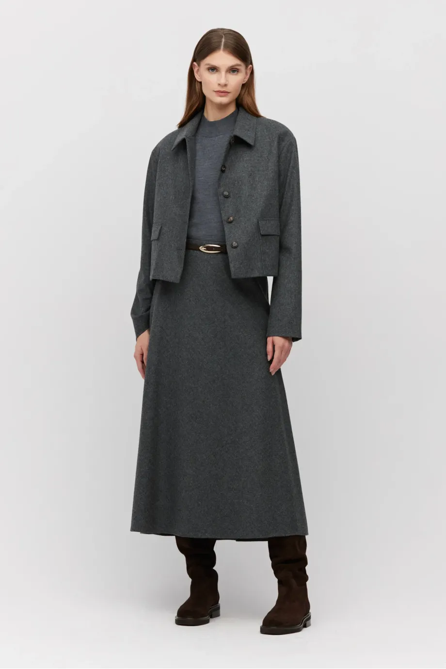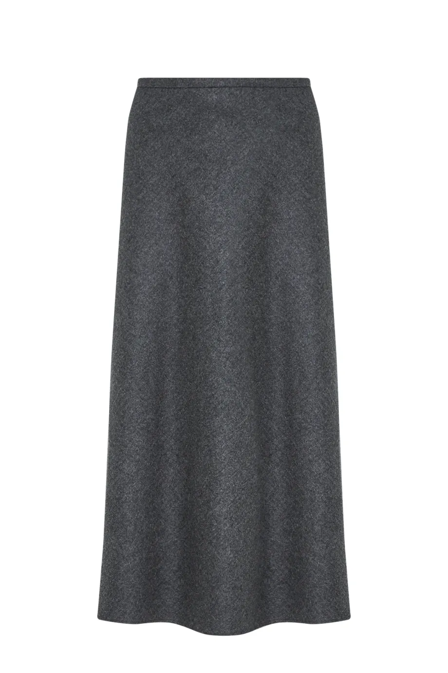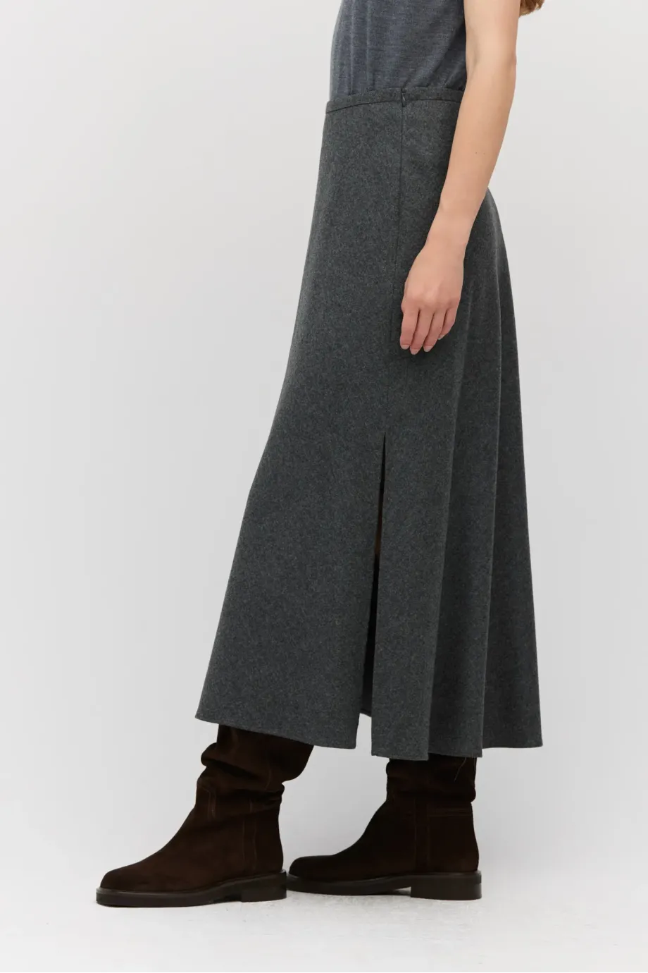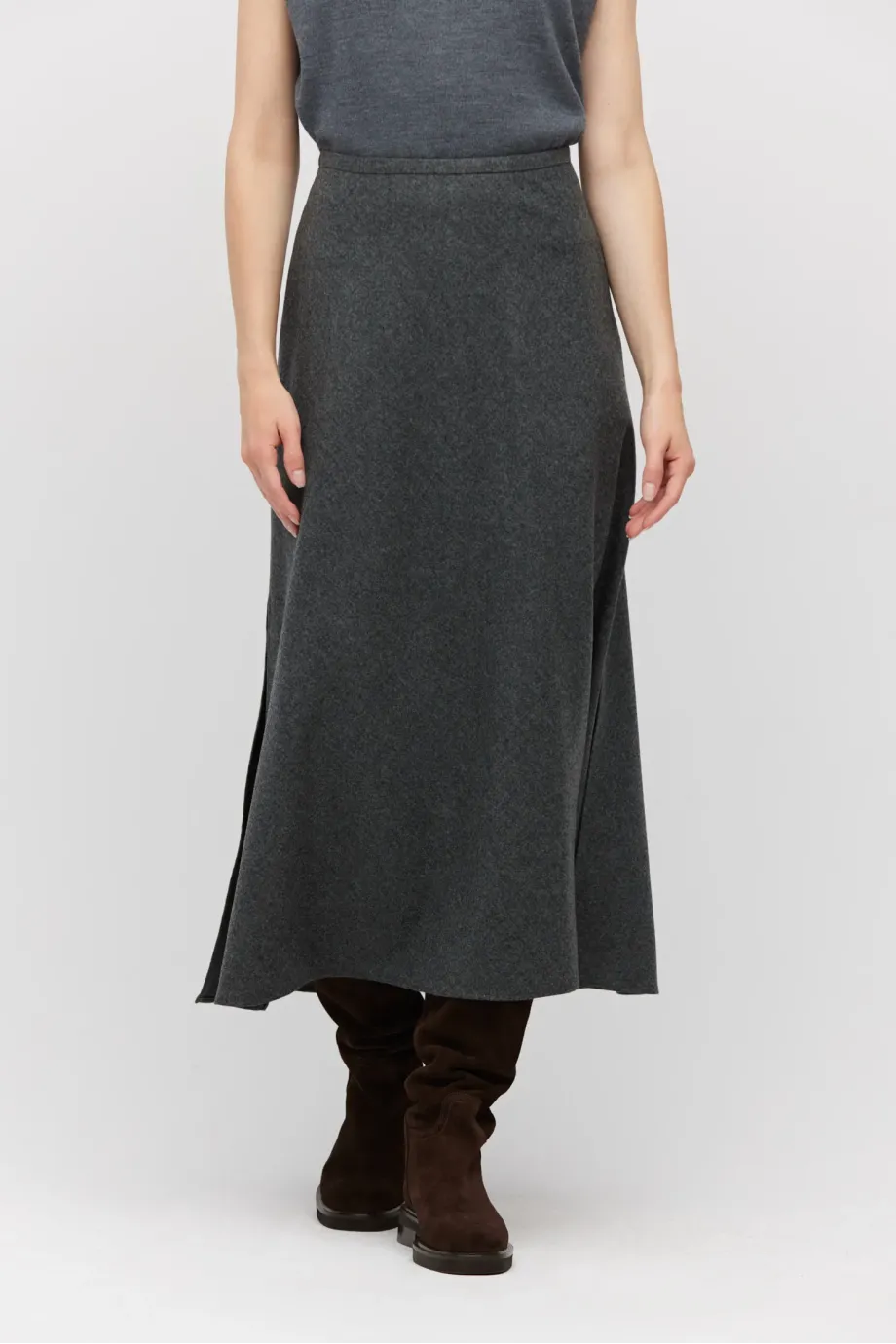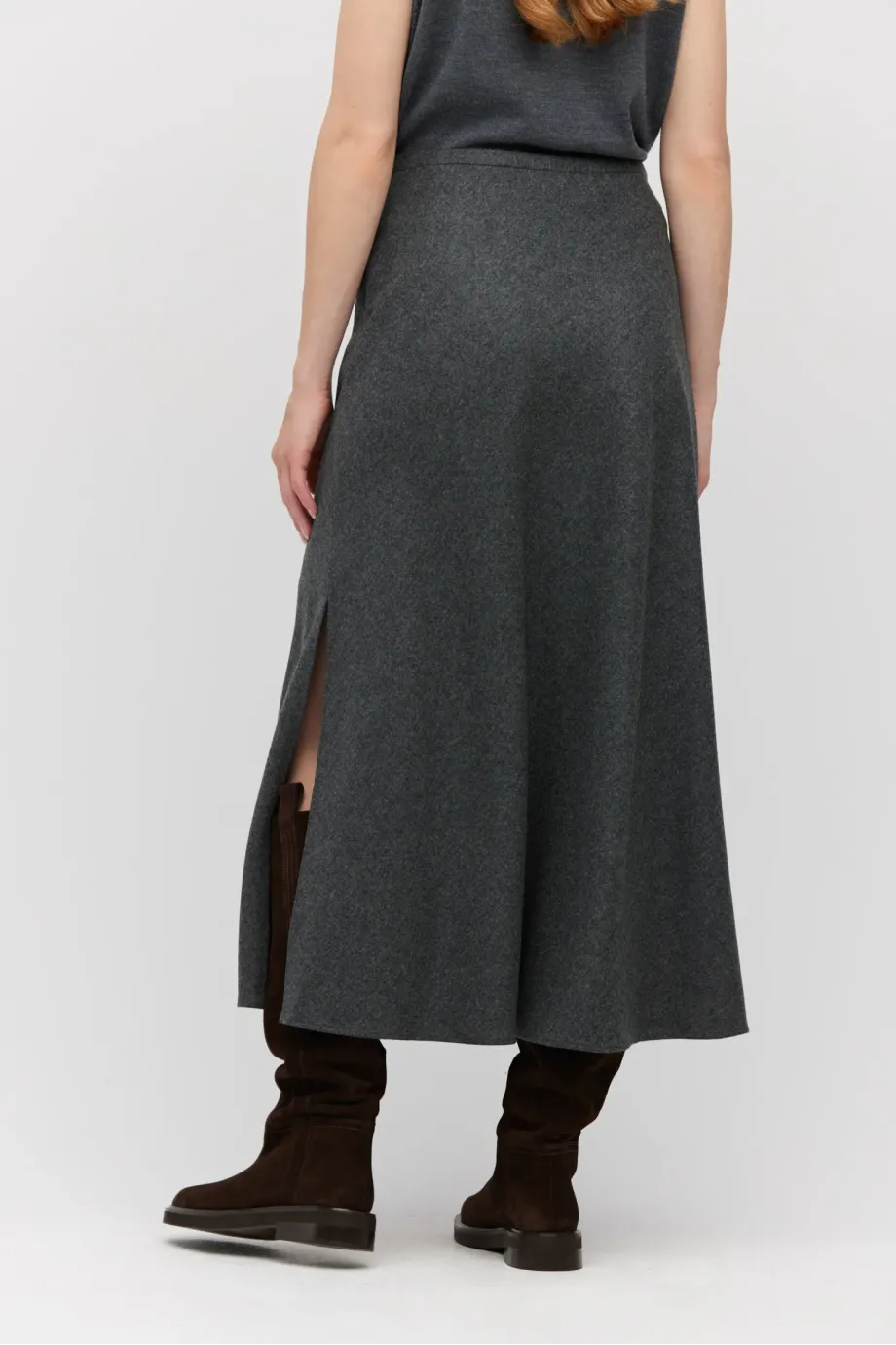 Tmavě šedá midi sukně na podšívce. Tkanina s příměsí kašmíru. V pase klasická, spodek šikmý. Zapínání na zip na levé straně.