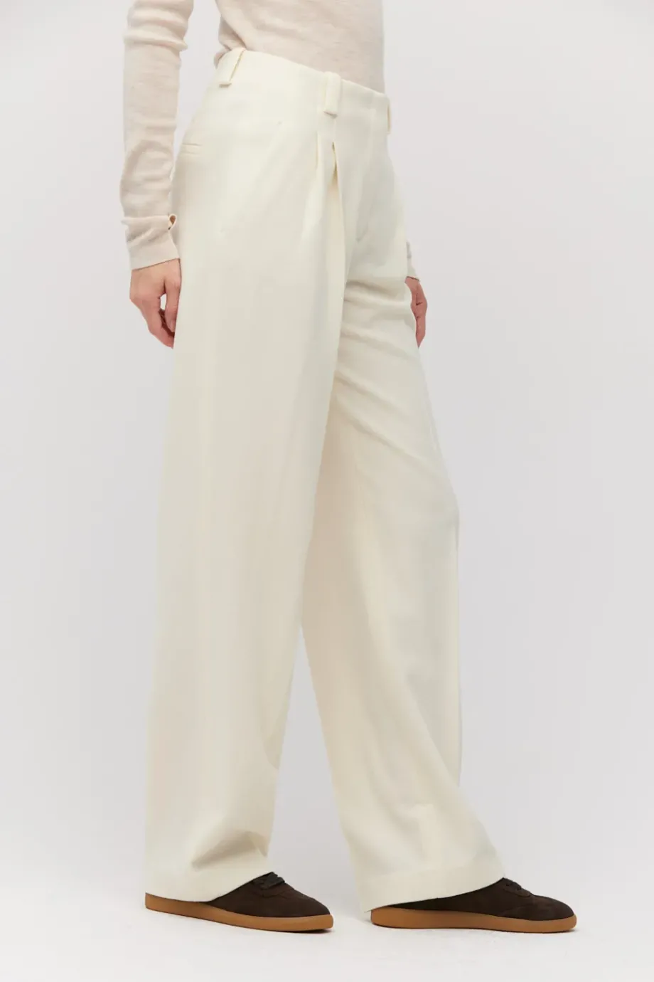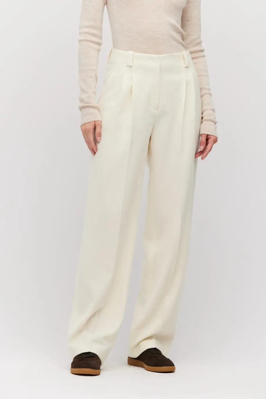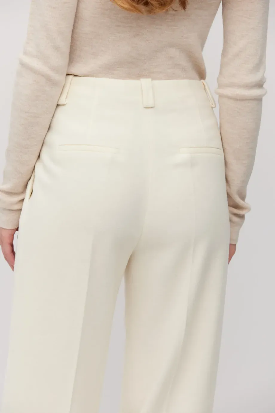 Vlněné kalhoty s příměsí kašmíru. Střih s vyšším pasem, široké nohavice. Boční kapsy, ozdobné vnitřní zakončení. Zapínání na skrytý zip, háček a vnitřní knoflík z přírodního ořechu corozo. K doplnění soupravy sako ze stejné tkaniny. Barva smetanová.