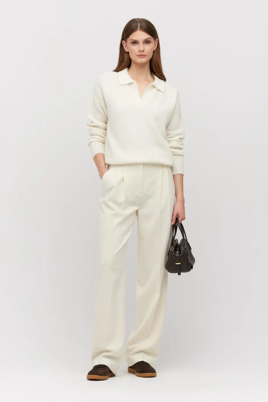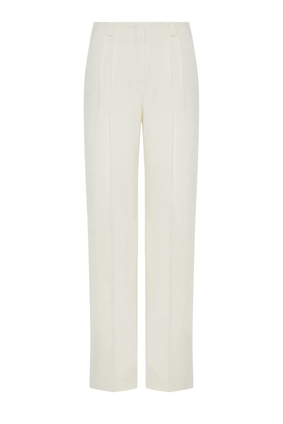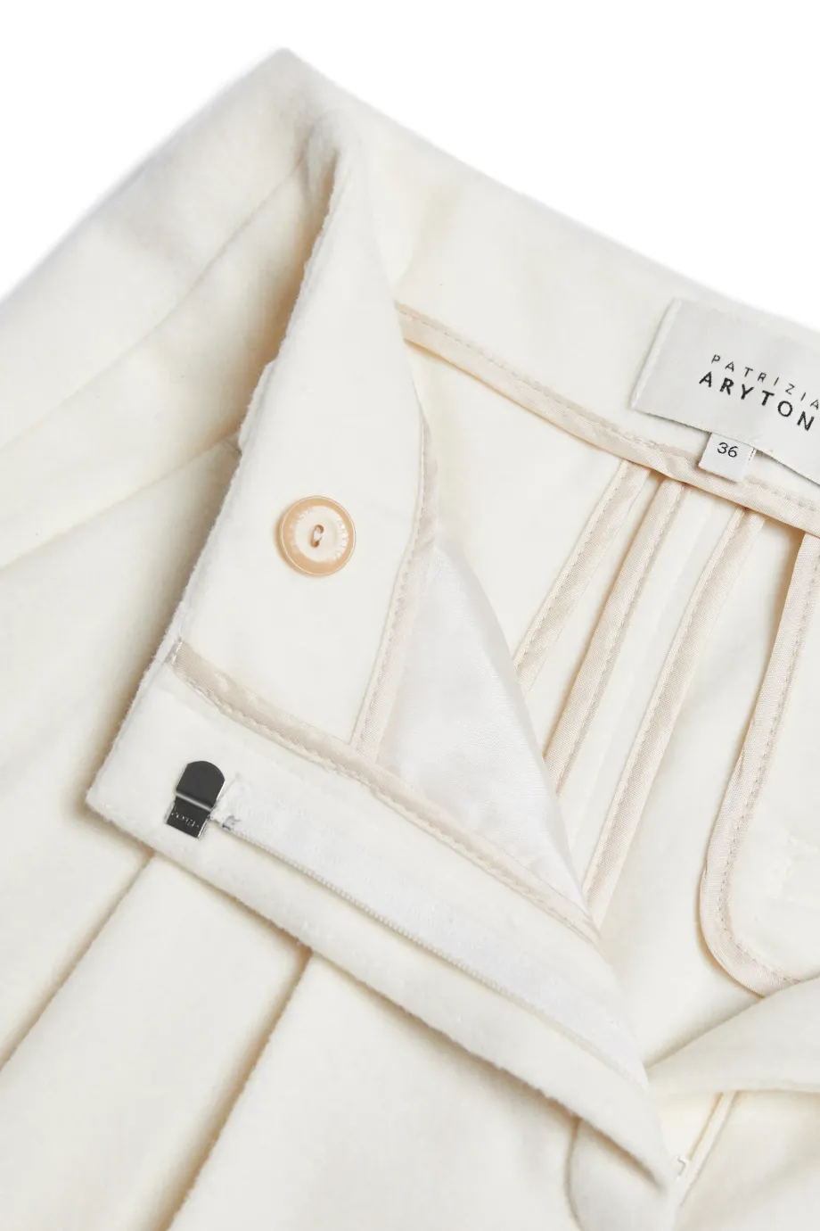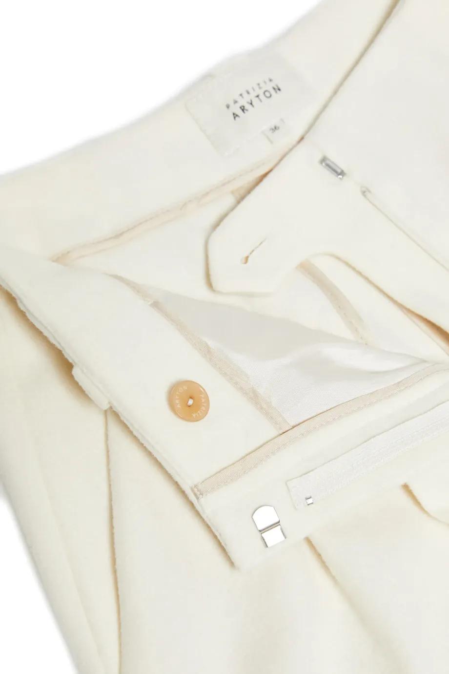 Vlněné kalhoty s příměsí kašmíru. Střih s vyšším pasem, široké nohavice. Boční kapsy, ozdobné vnitřní zakončení. Zapínání na skrytý zip, háček a vnitřní knoflík z přírodního ořechu corozo. K doplnění soupravy sako ze stejné tkaniny. Barva smetanová.