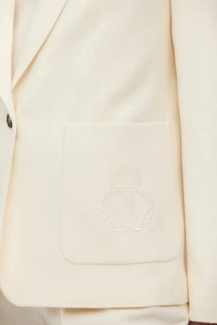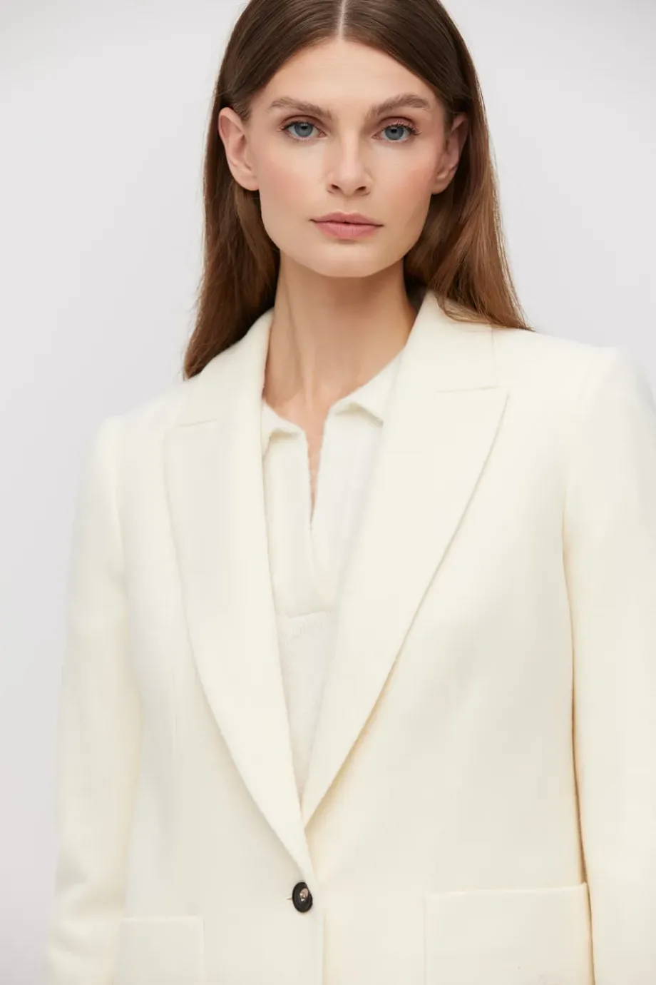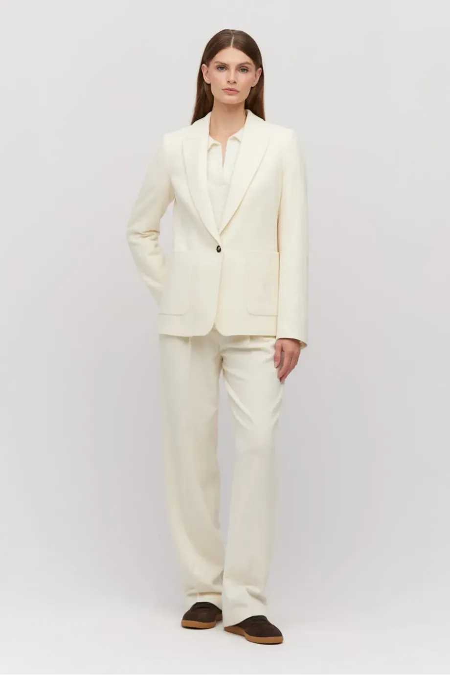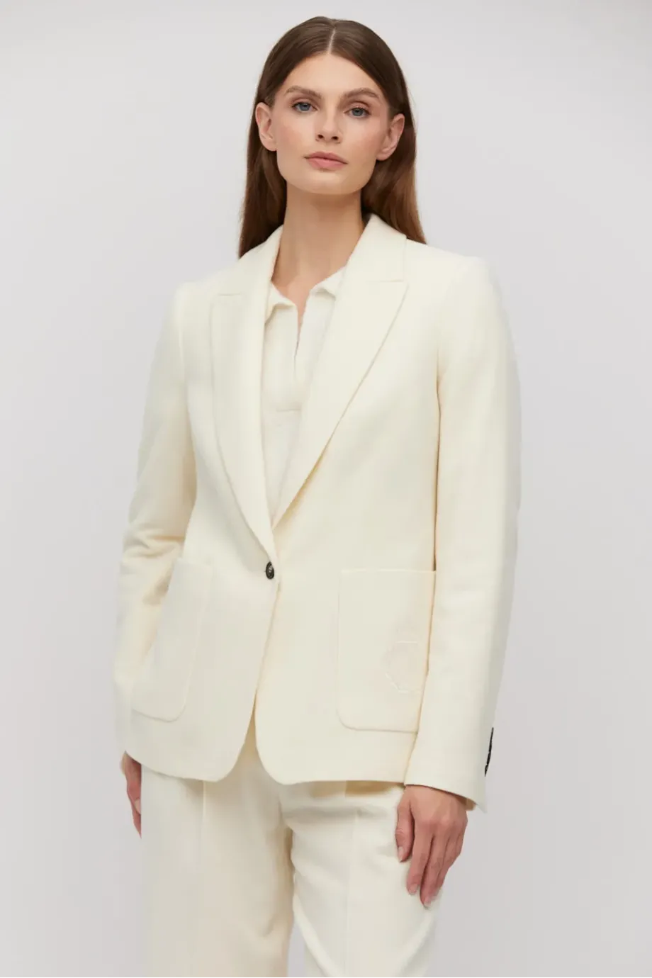 Jednobarevný blejzr, ušitý z vlny s příměsí kašmíru. Jemně tvarovaný střih, dlouhý rukáv, zapínání na jeden knoflík. Model na podšívce, se stehováním a paspulemi uvnitř. Násivné kapsy s výšivkou. K doplnění soupravy kalhoty ze stejné tkaniny.