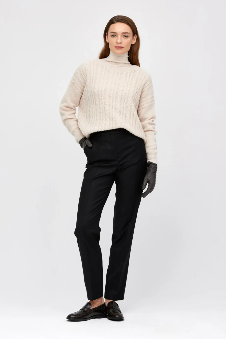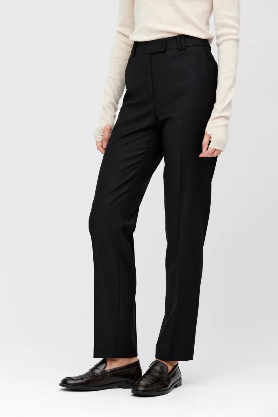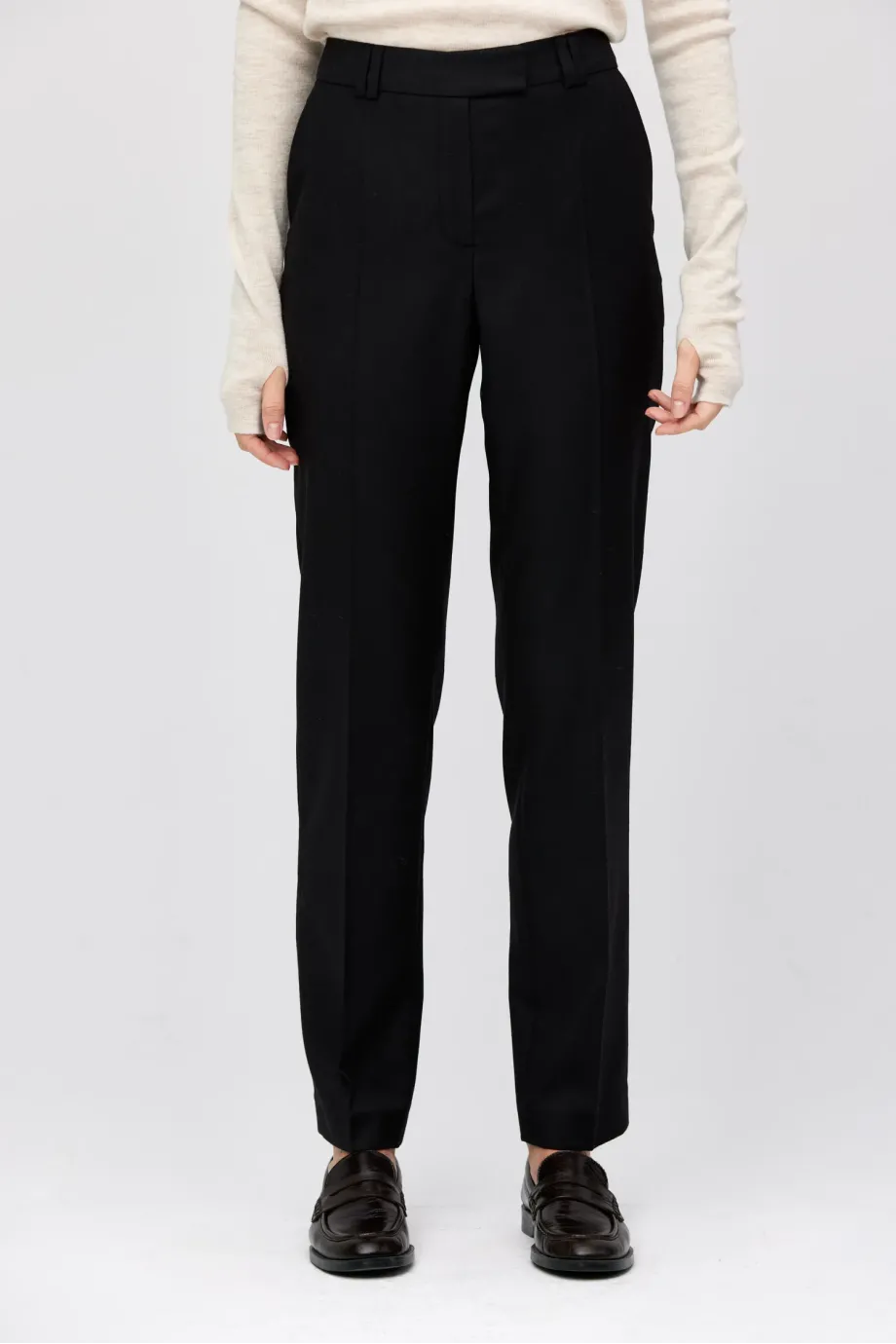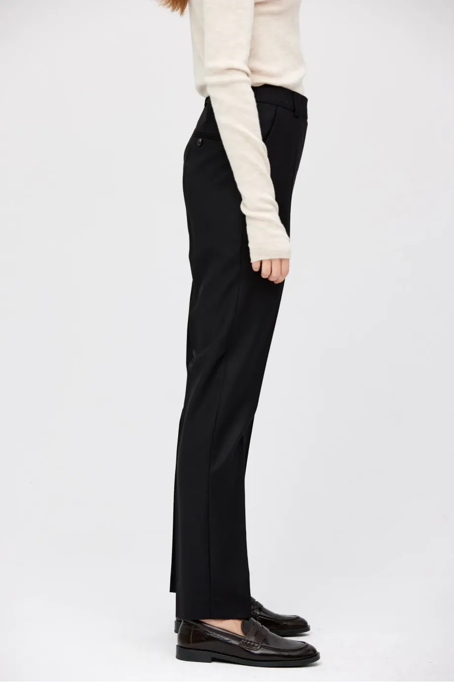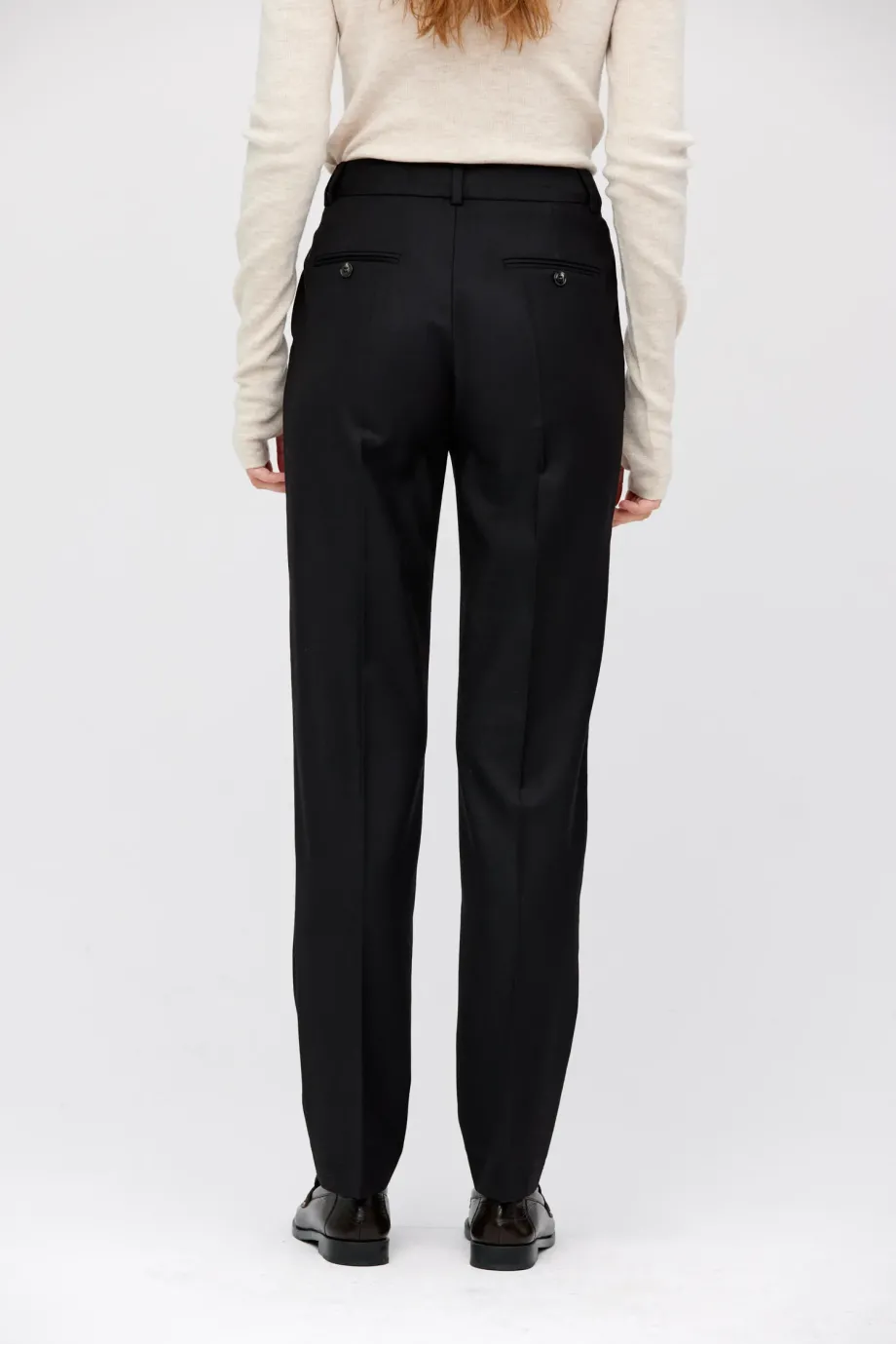 Kalhoty do obleku z jehněčí vlny. Lehce zúžené nohavice, se zapínáním na zip a háček a knoflík corozo uvnitř. Vnitřek s ozdobným lemováním. Kapsy a poutka. Barva černá. K doplnění soupravy sako ze stejné tkaniny.