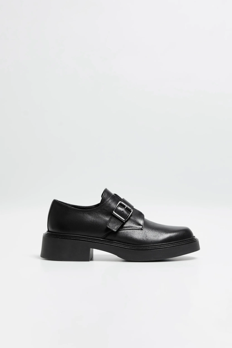 Černé monk boty z měkké kozí kůže, ručně šité v Itálii. Klasický styl s přezkou a kulatou špičkou na masivní podrážce.