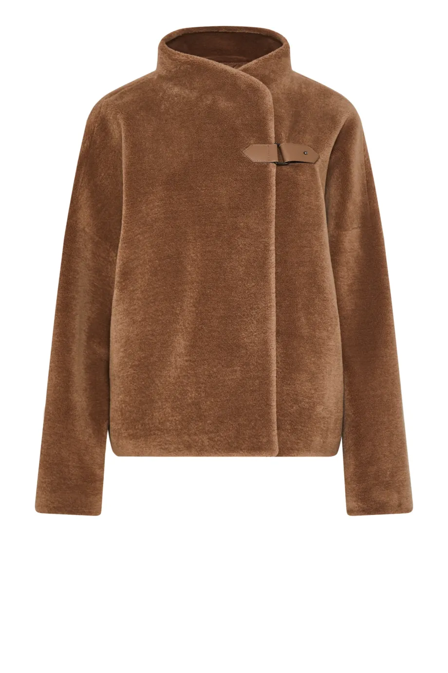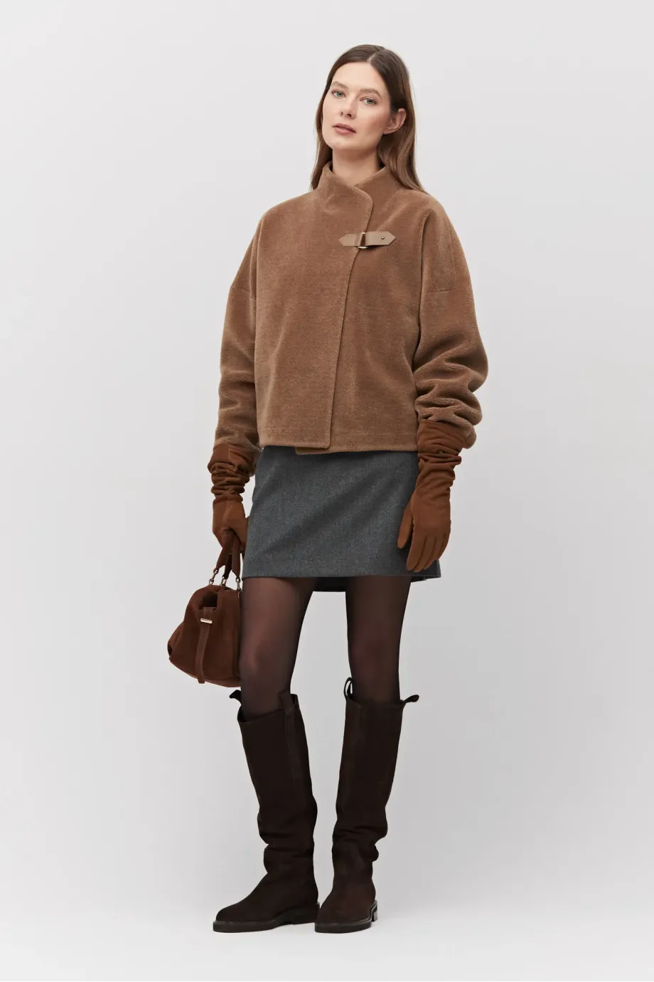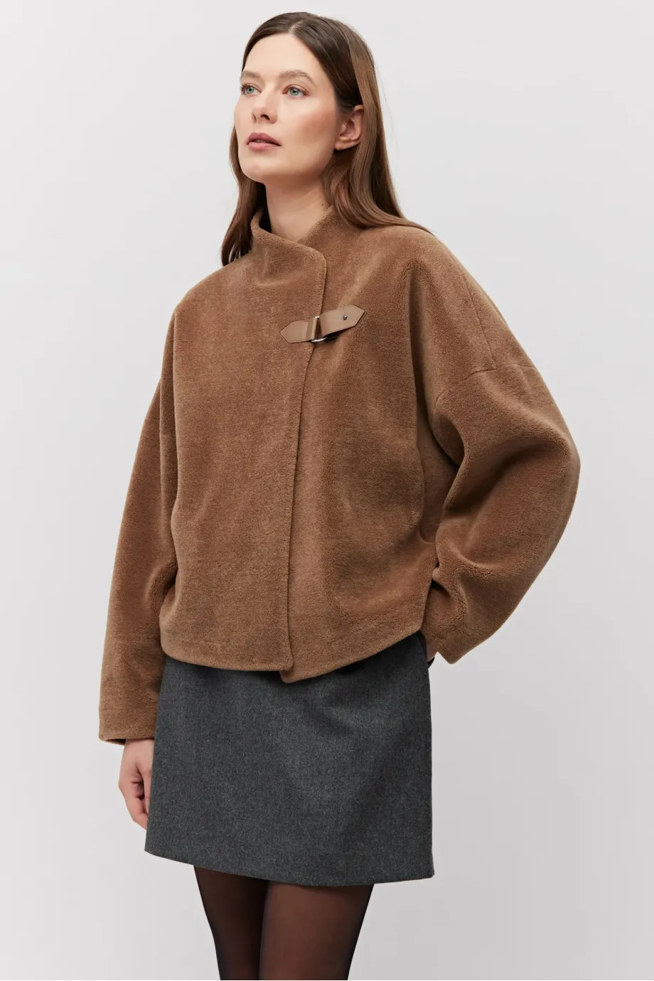 Bunda z vlny teddy bear. Krátká forma, s límcem a koženým zapínáním. Dlouhý rukáv, kapsy. Barva hnědá.
