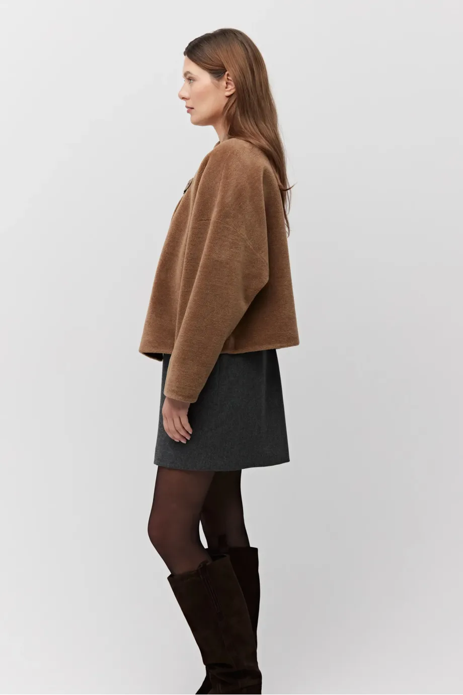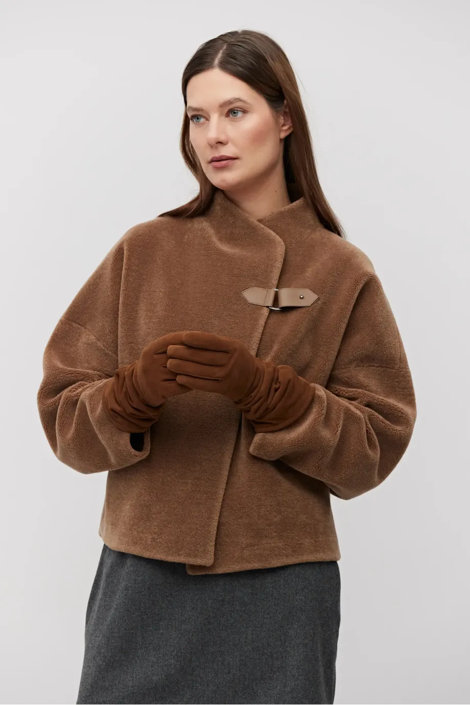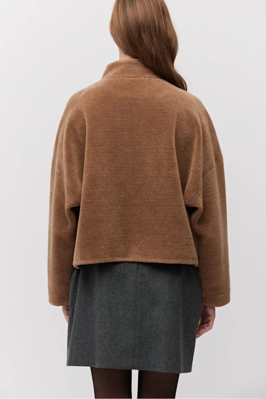 Bunda z vlny teddy bear. Krátká forma, s límcem a koženým zapínáním. Dlouhý rukáv, kapsy. Barva hnědá.