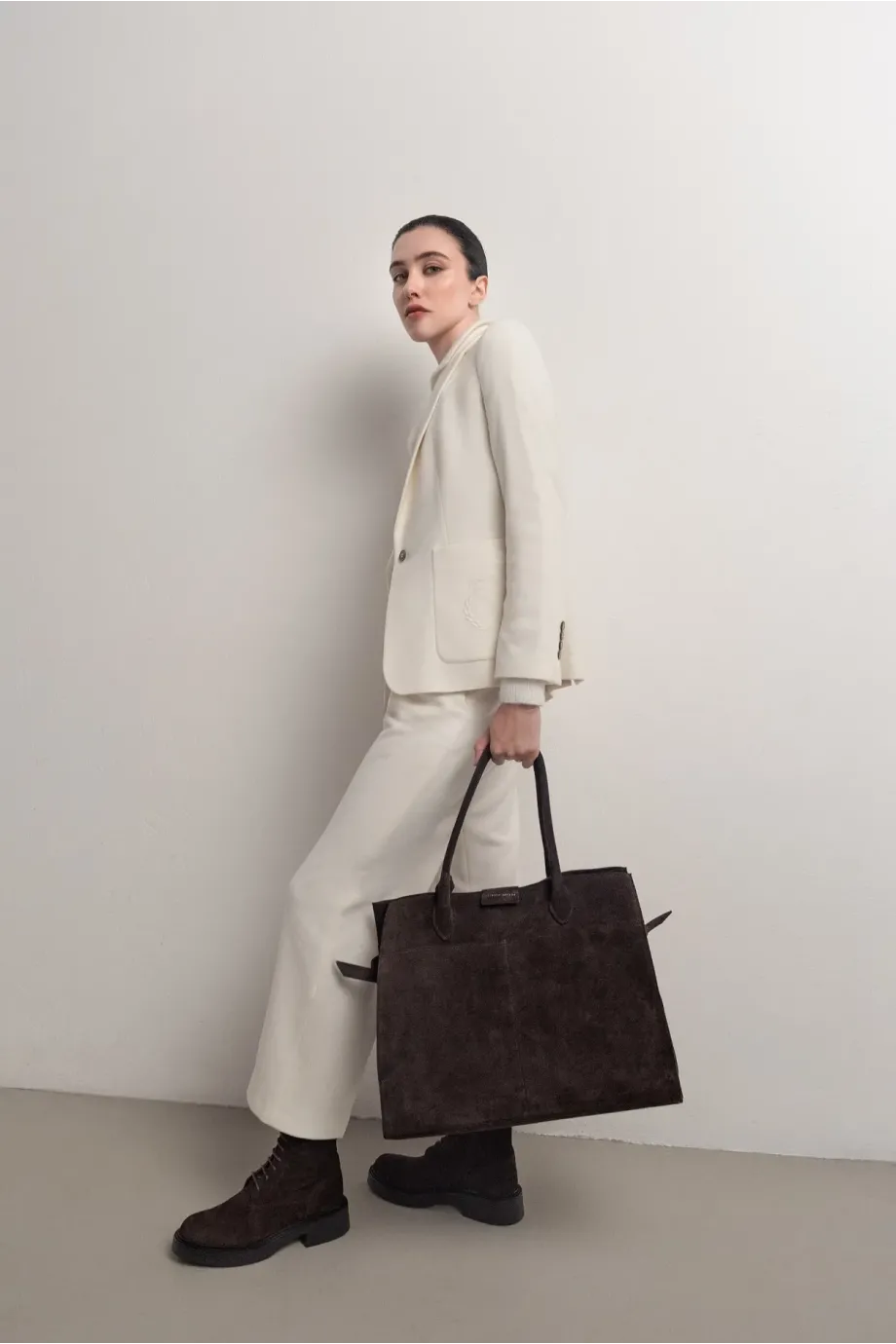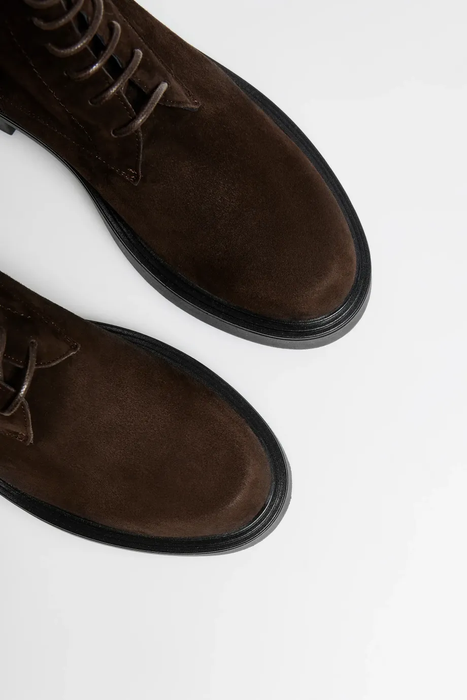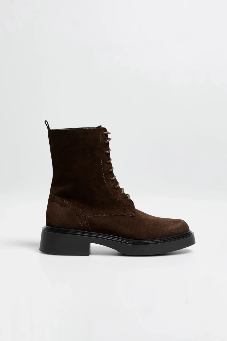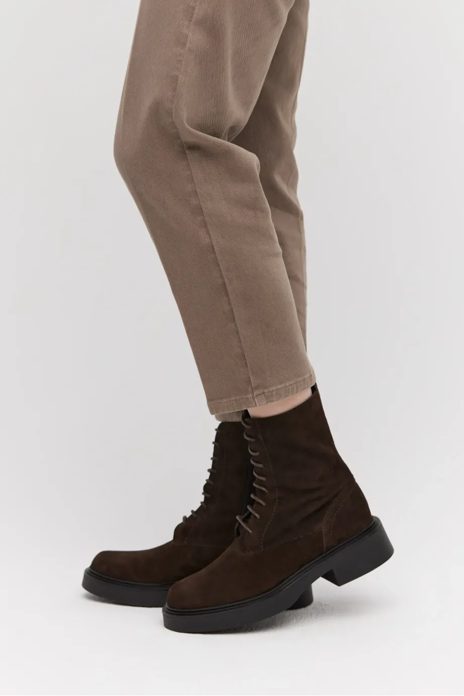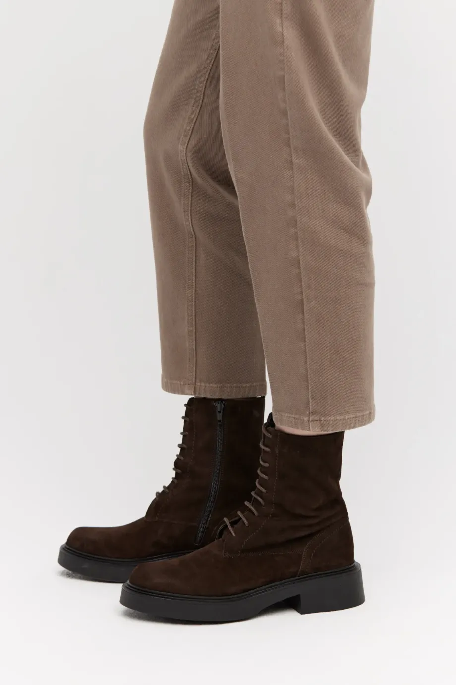 Hnědé kotníkové boty z měkké nubukové kůže. Šněrovací, s masivní podrážkou a kulatou špičkou. Ručně vyrobené v italské manufaktuře.
