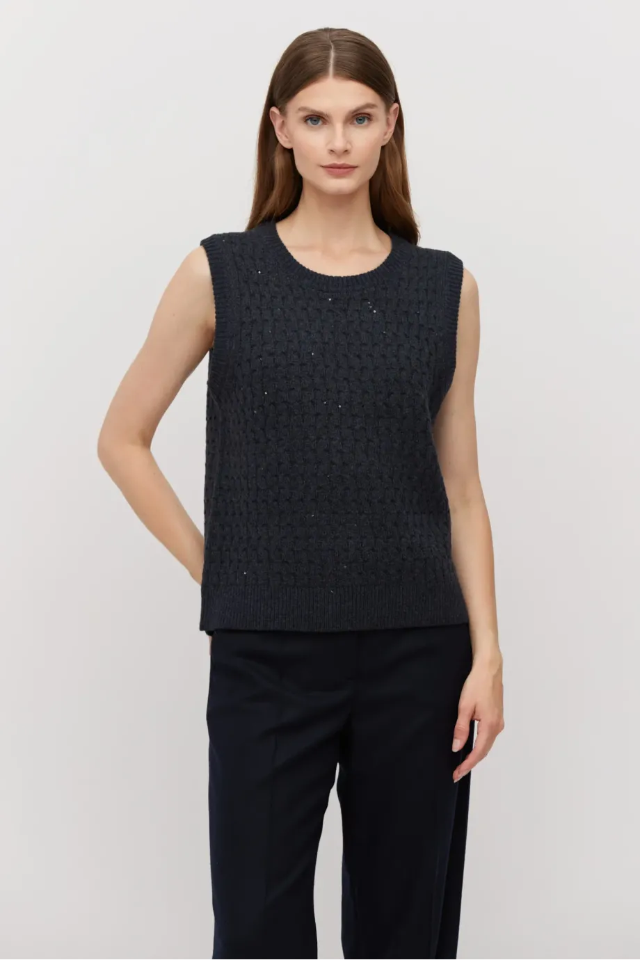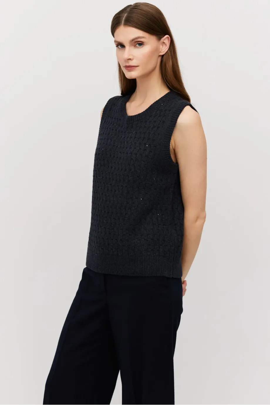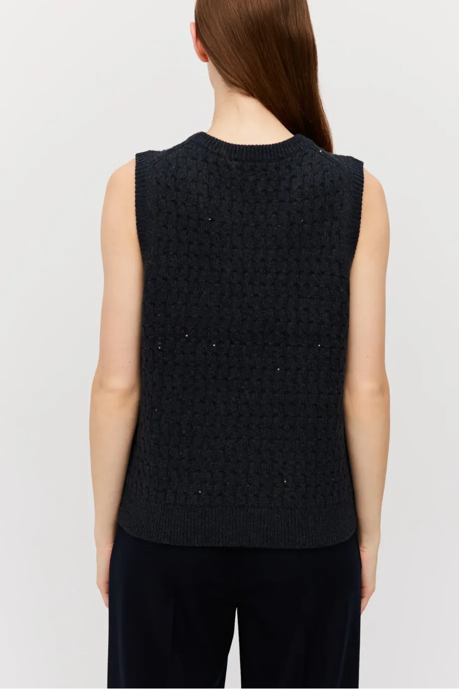 Grafitová vesta z merino vlny. Střih blíže k tělu s kulatým výstřihem. Pletenina s jemnou lurexovou nití.