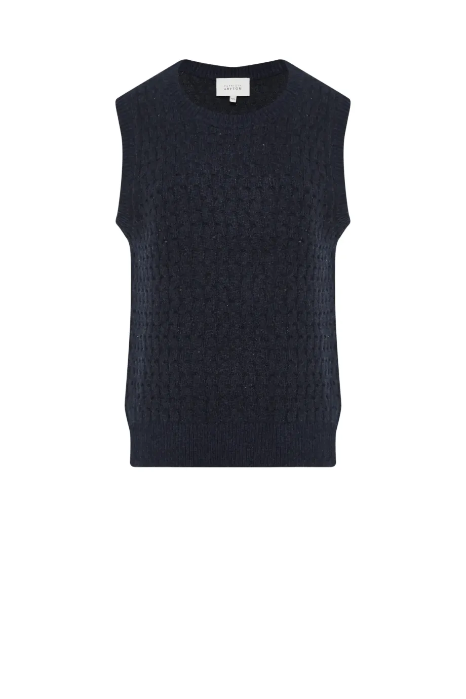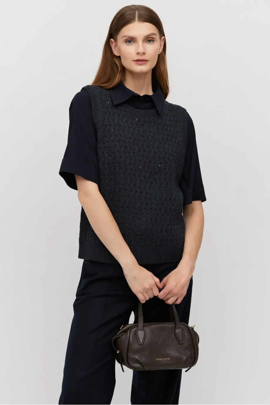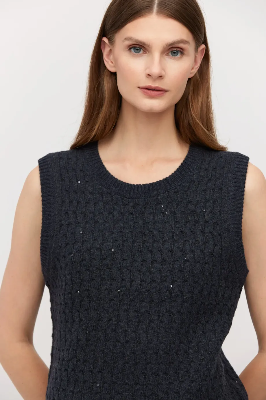 Grafitová vesta z merino vlny. Střih blíže k tělu s kulatým výstřihem. Pletenina s jemnou lurexovou nití.
