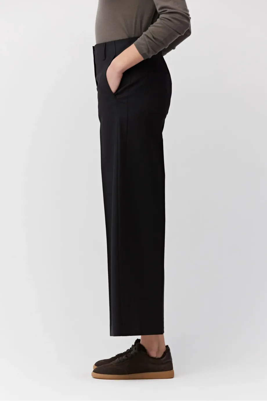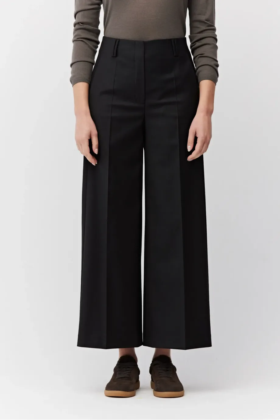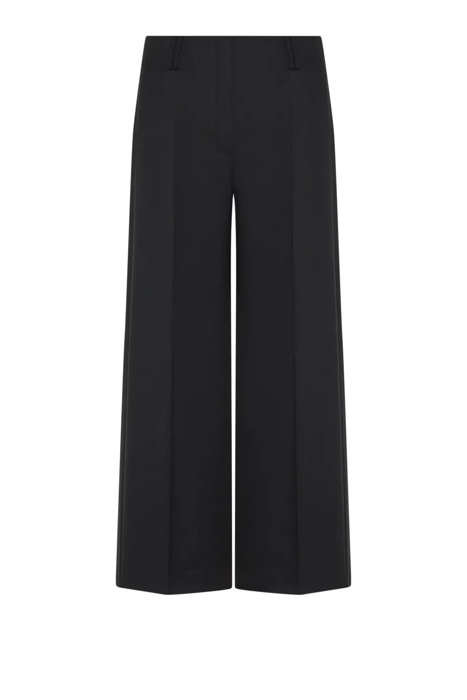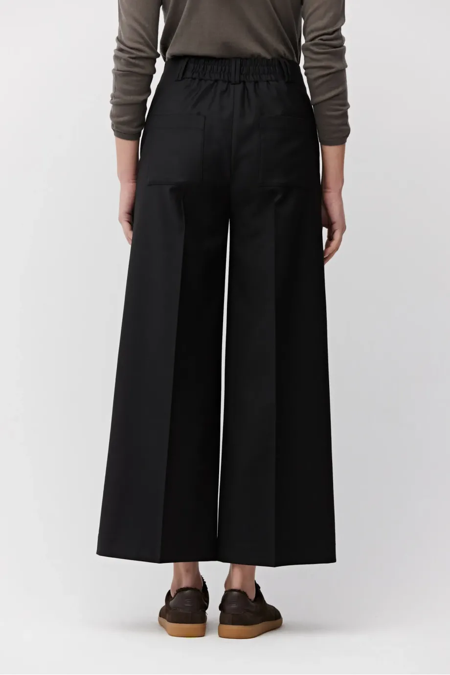 Černé kalhoty s vlnou. Střih s širší nohavicí typu culotte. Kapsy, poutka. Zapínání na skrytý zip, háček a vnitřní knoflík z corozo ořechu. Z vnitřní strany ozdobné lemování. Po straně lampas.