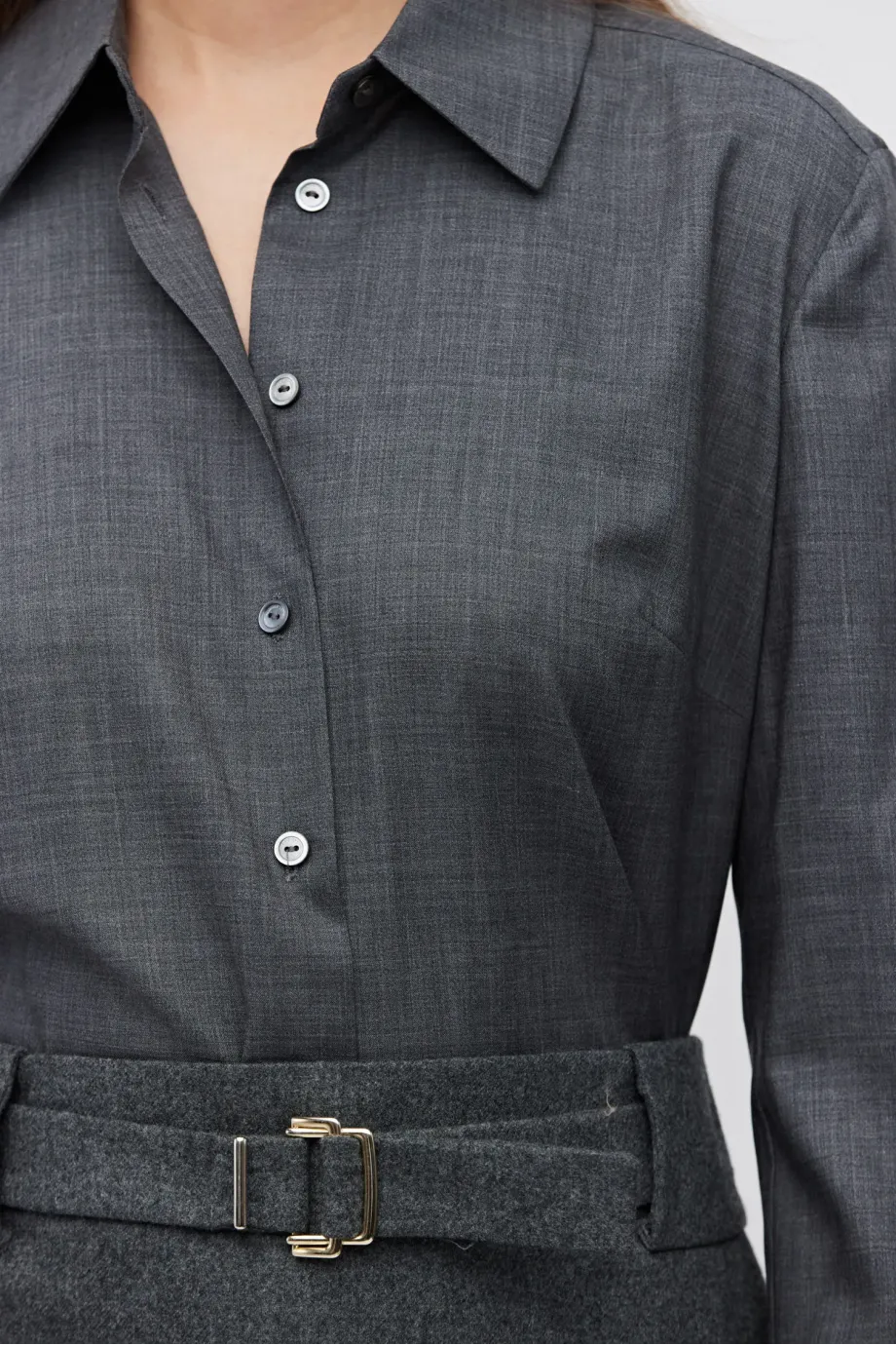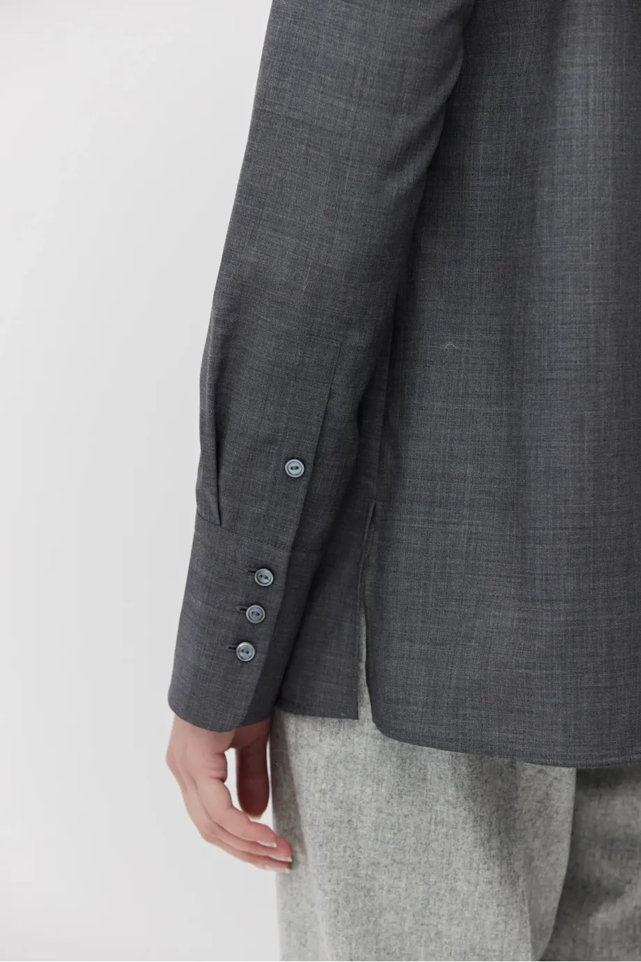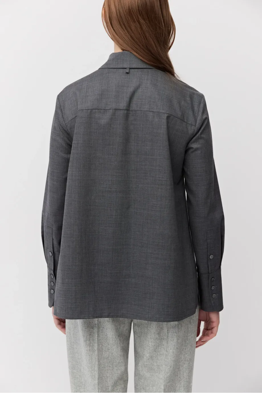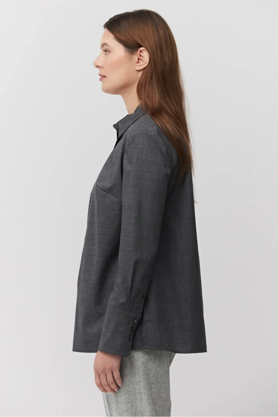 Wlněná košile s širokými manžetami. Límec, zapínání na knoflíky z perleťové mušle. Dlouhý rukáv. Barva tmavě šedá.