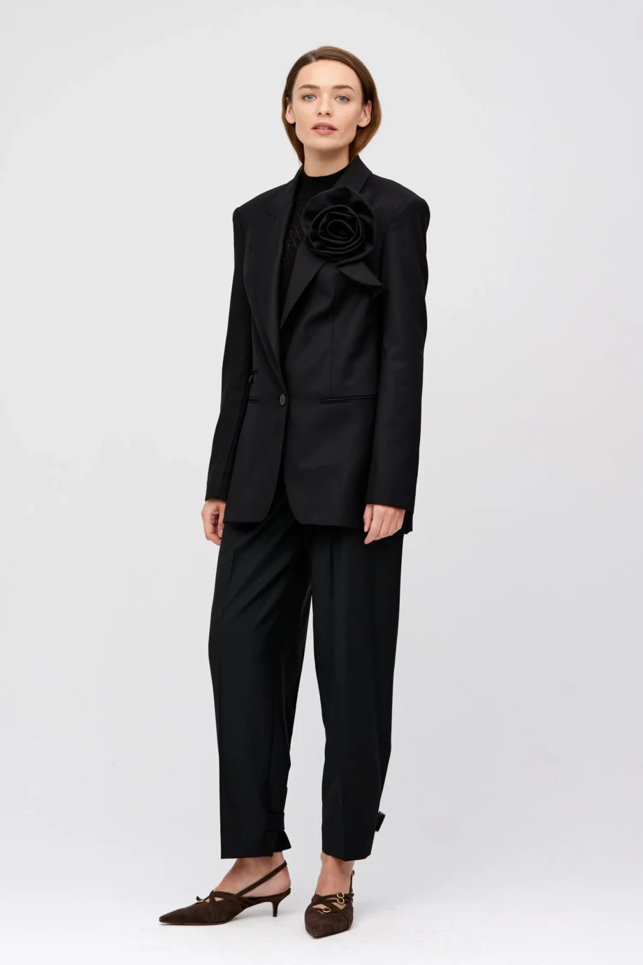 Kalhoty s vlnou. Černá barva. Zúžené nohavice, elastický pas vzadu. Boční kapsy, vnitřní dekorativní úpravy. Zapínání na ocelový háček a knoflík z přírodního ořechu corozo.