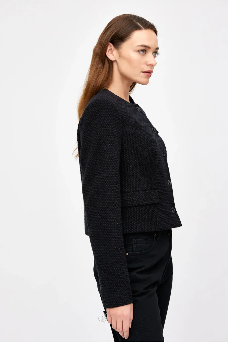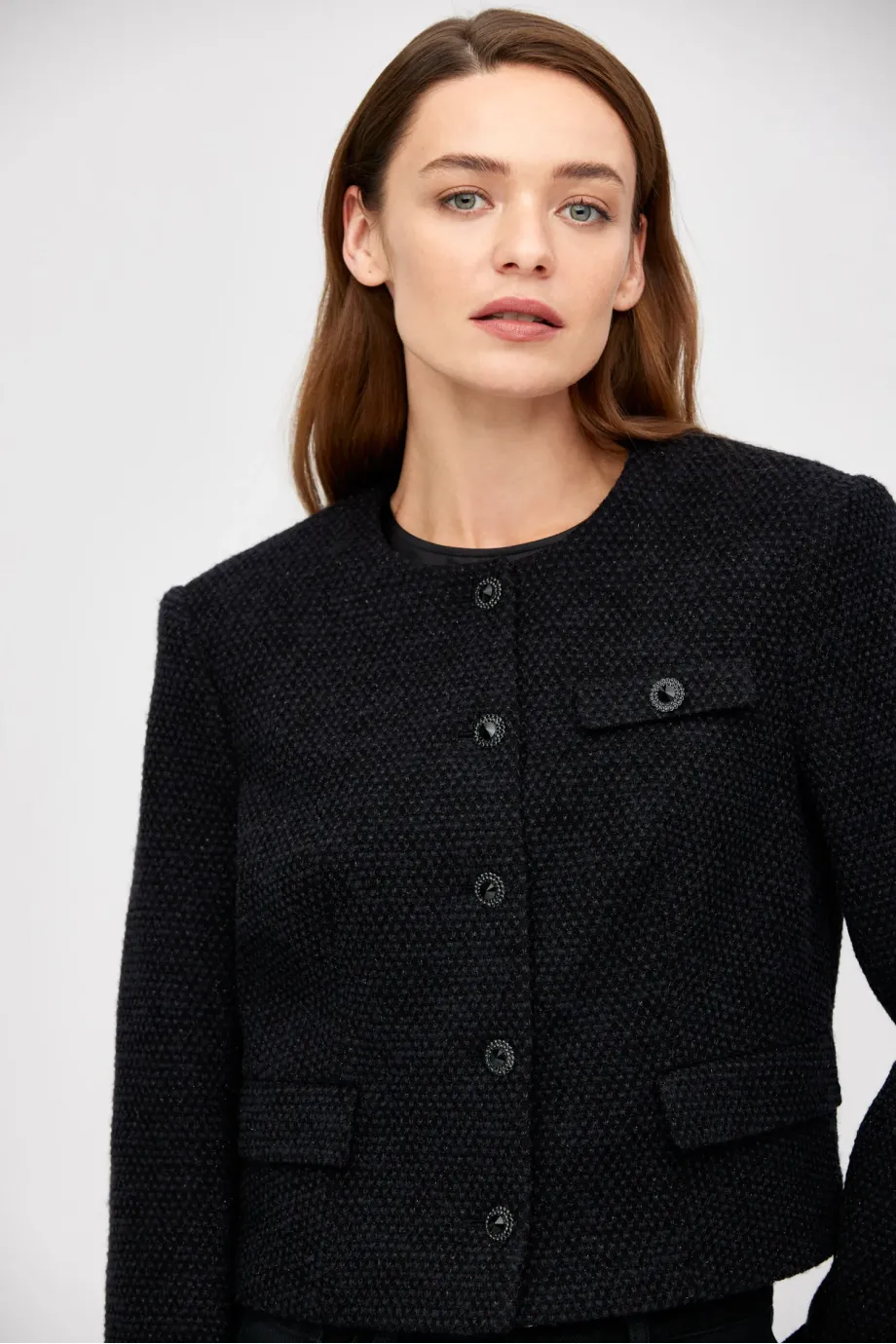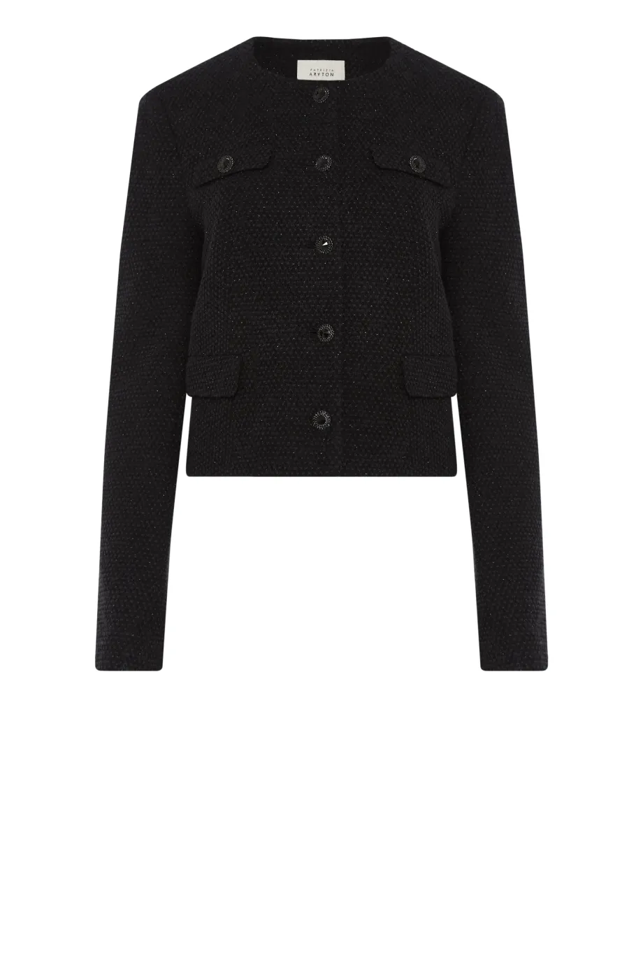 Jednobotonový blejzr s příměsí vlny. Krabicový střih, dlouhý rukáv, zapínání na knoflíky. Kapsy. Model na podšívce, s ozdobným prošíváním a lemováním uvnitř. Barva černá.