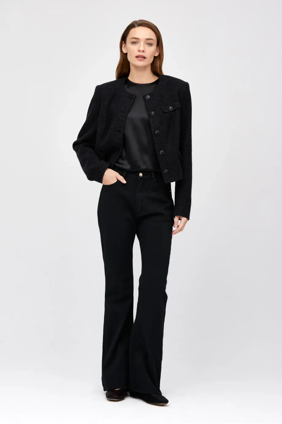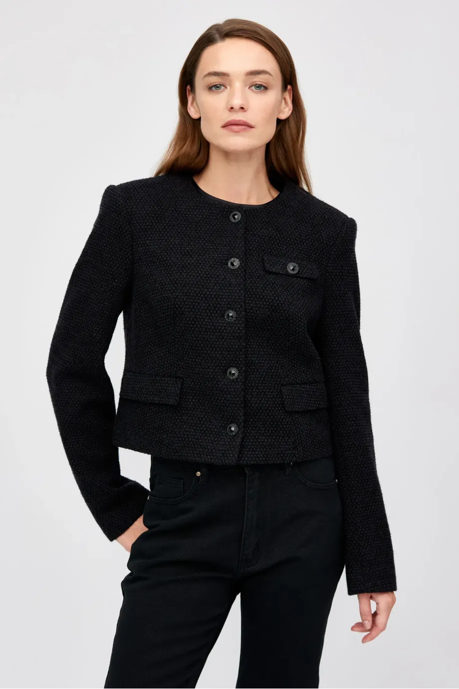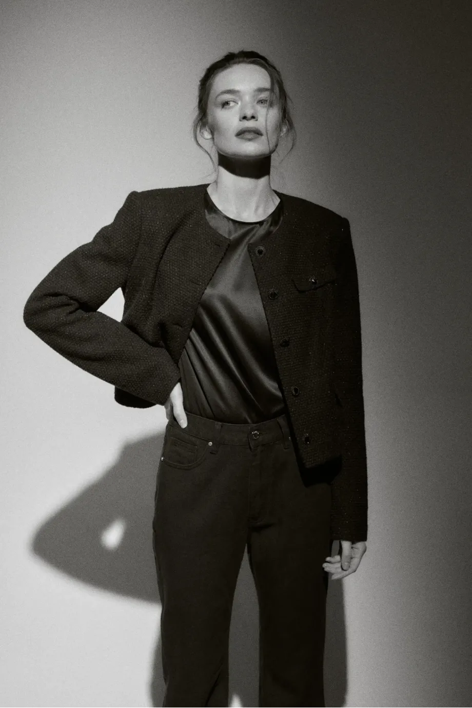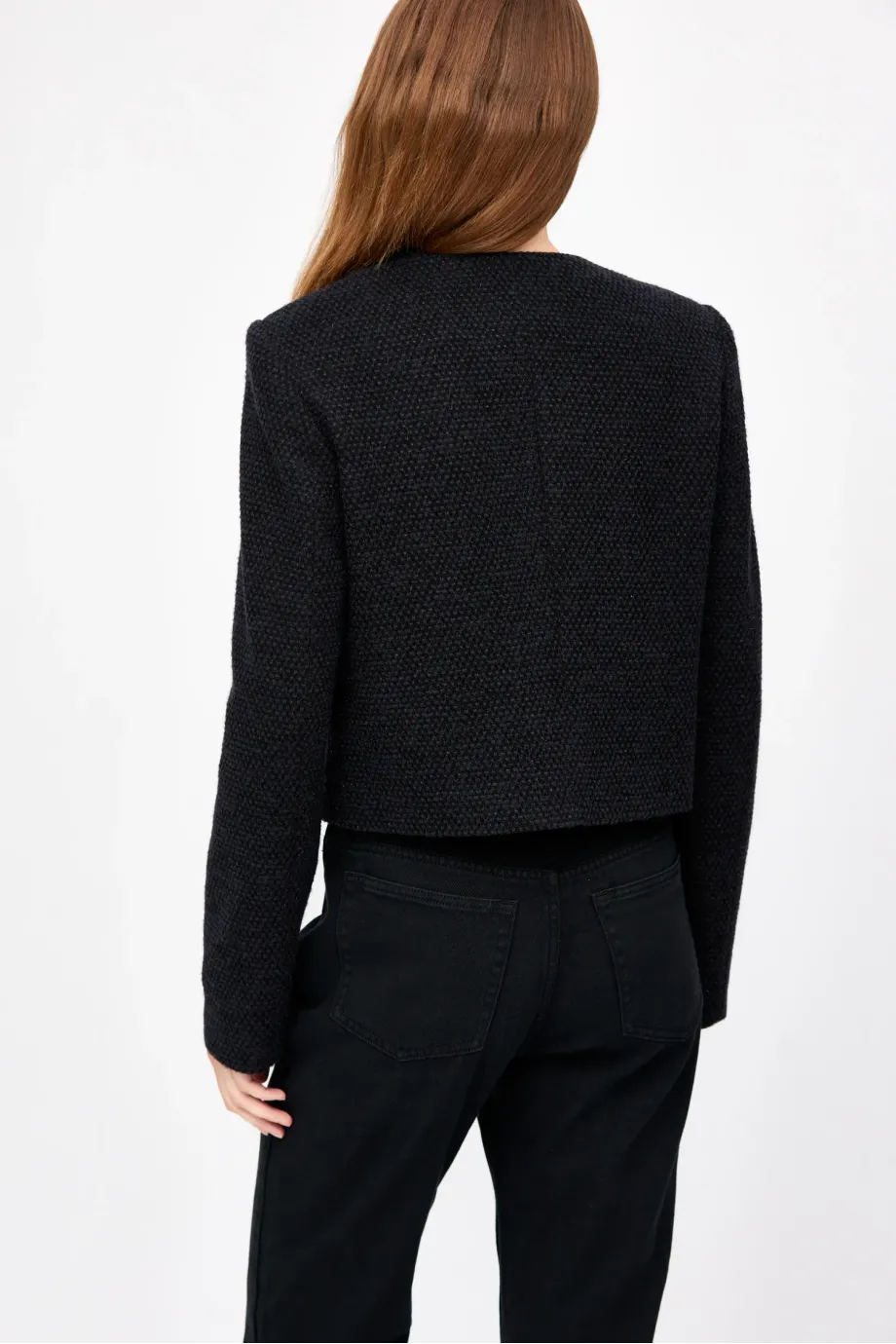 Jednobotonový blejzr s příměsí vlny. Krabicový střih, dlouhý rukáv, zapínání na knoflíky. Kapsy. Model na podšívce, s ozdobným prošíváním a lemováním uvnitř. Barva černá.