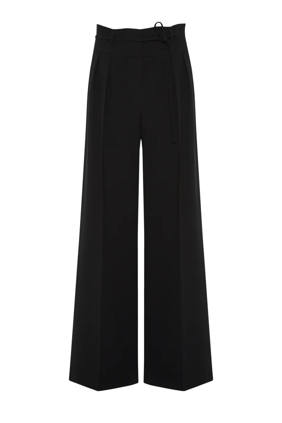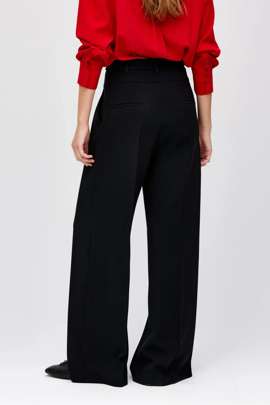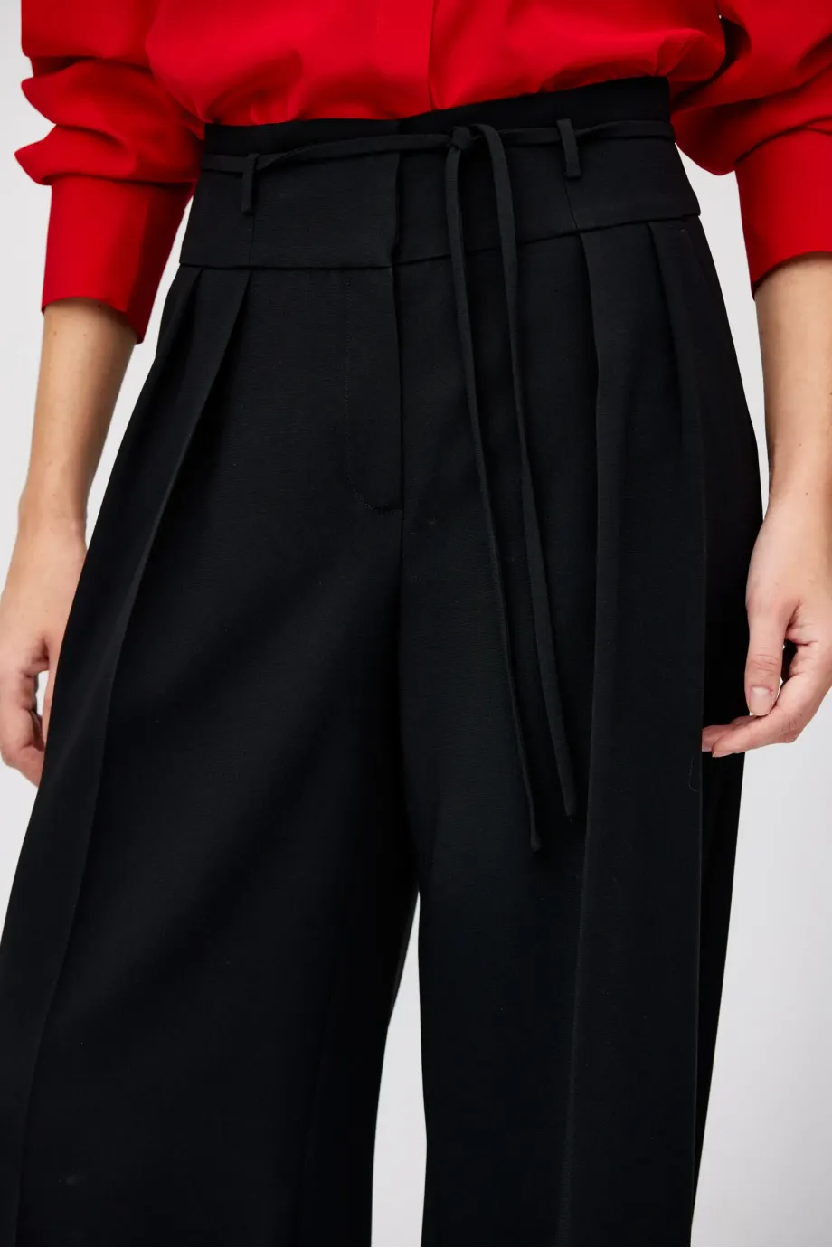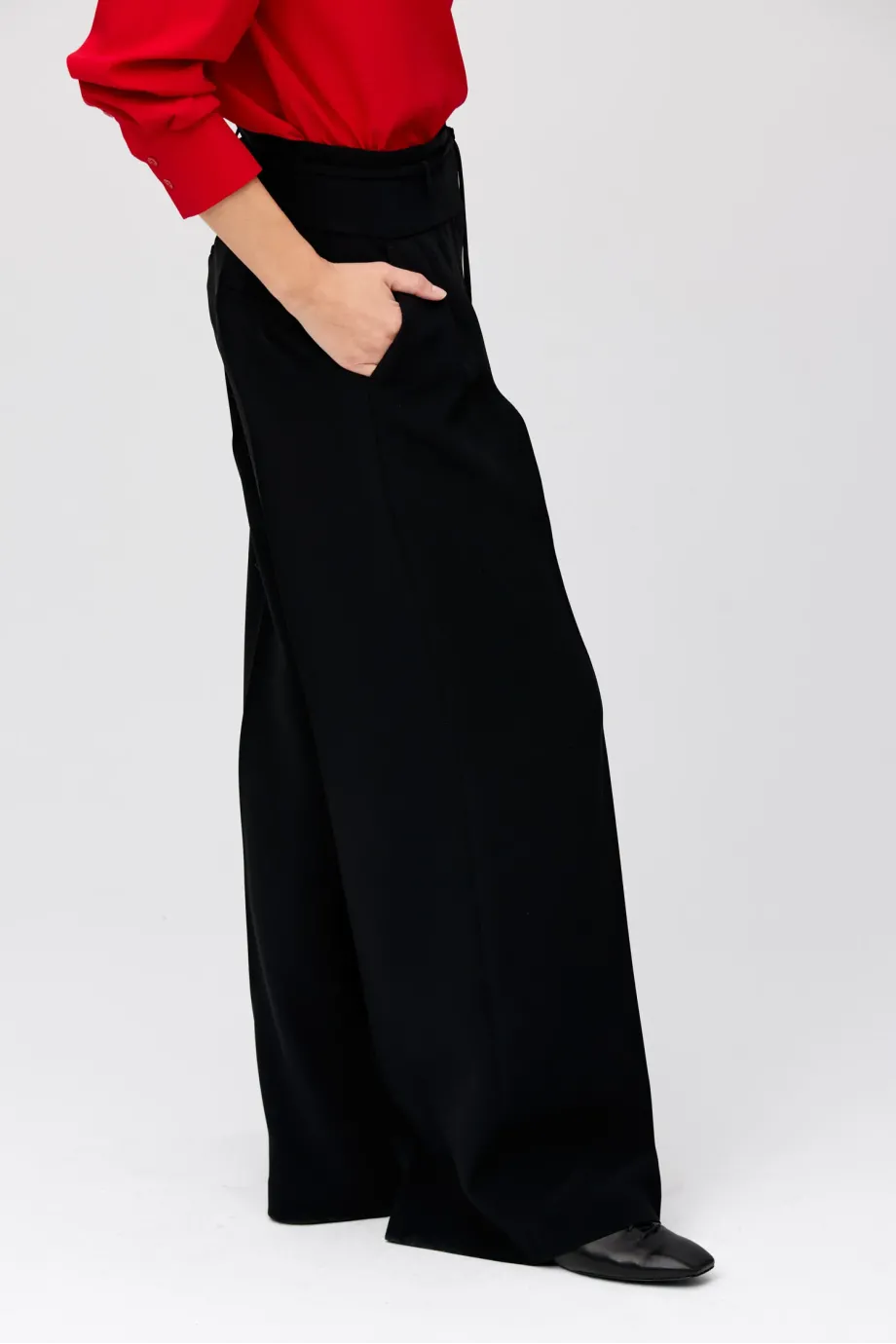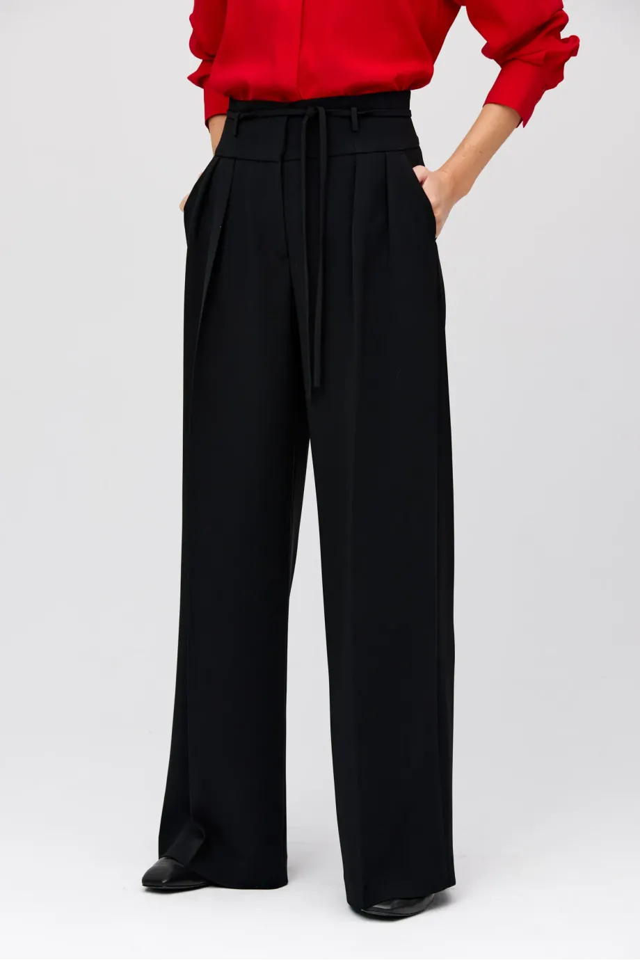 Kalhoty s vysokým pasem. Široká nohavice, záhyby, zapínání na zip, háček a knoflík corozo uvnitř. Vnitřek s ozdobným lemováním. Kapsy a poutka. Barva černá.