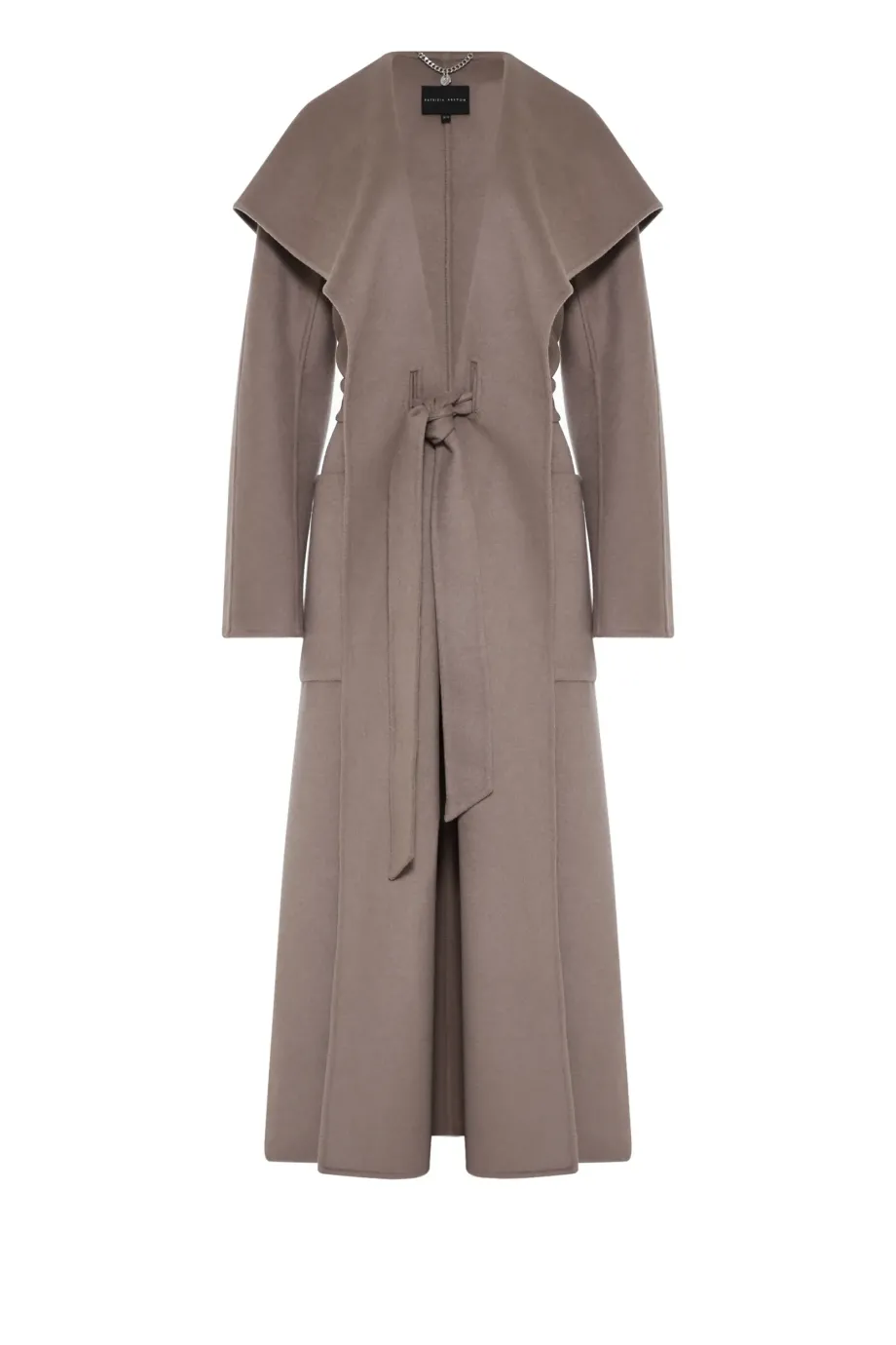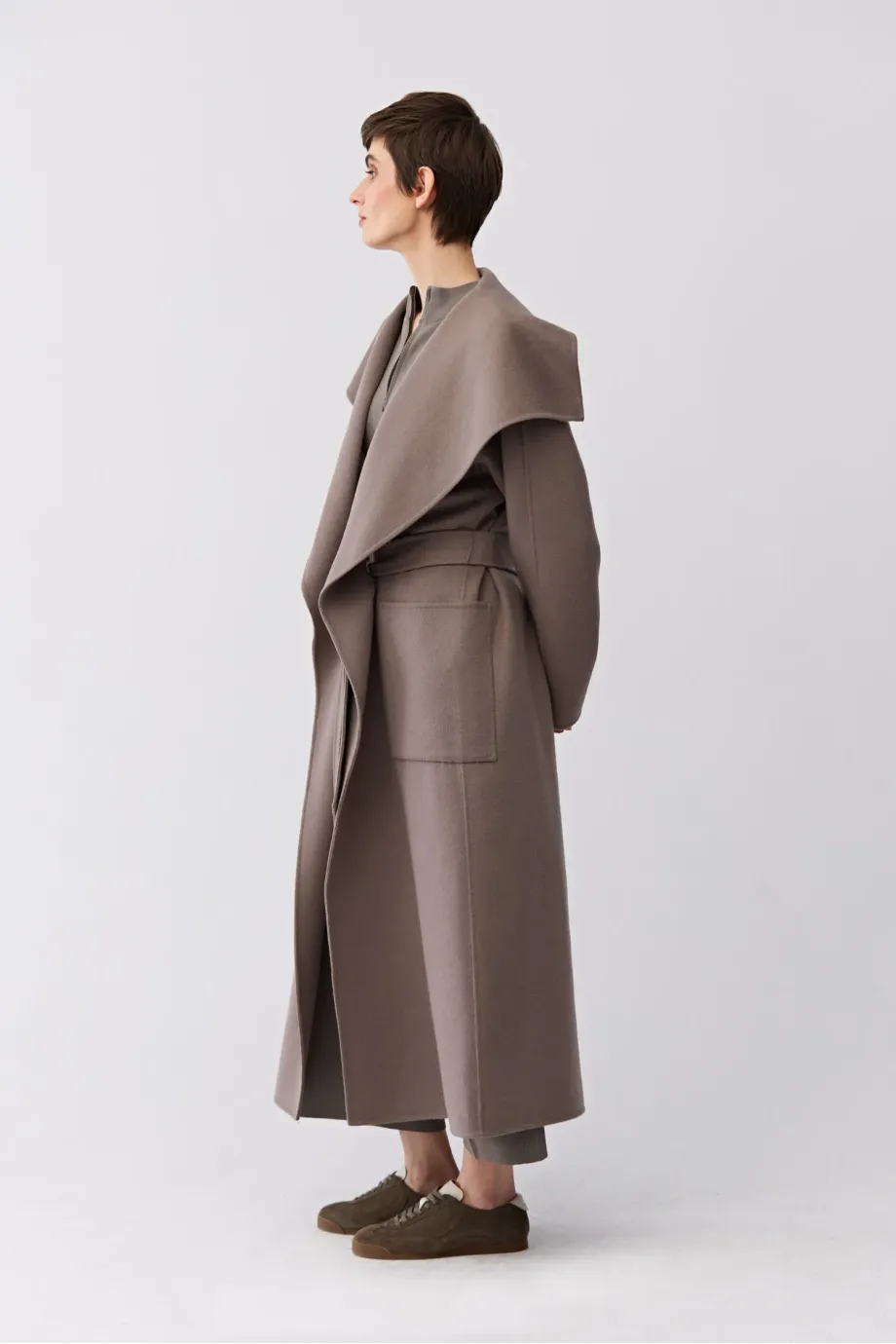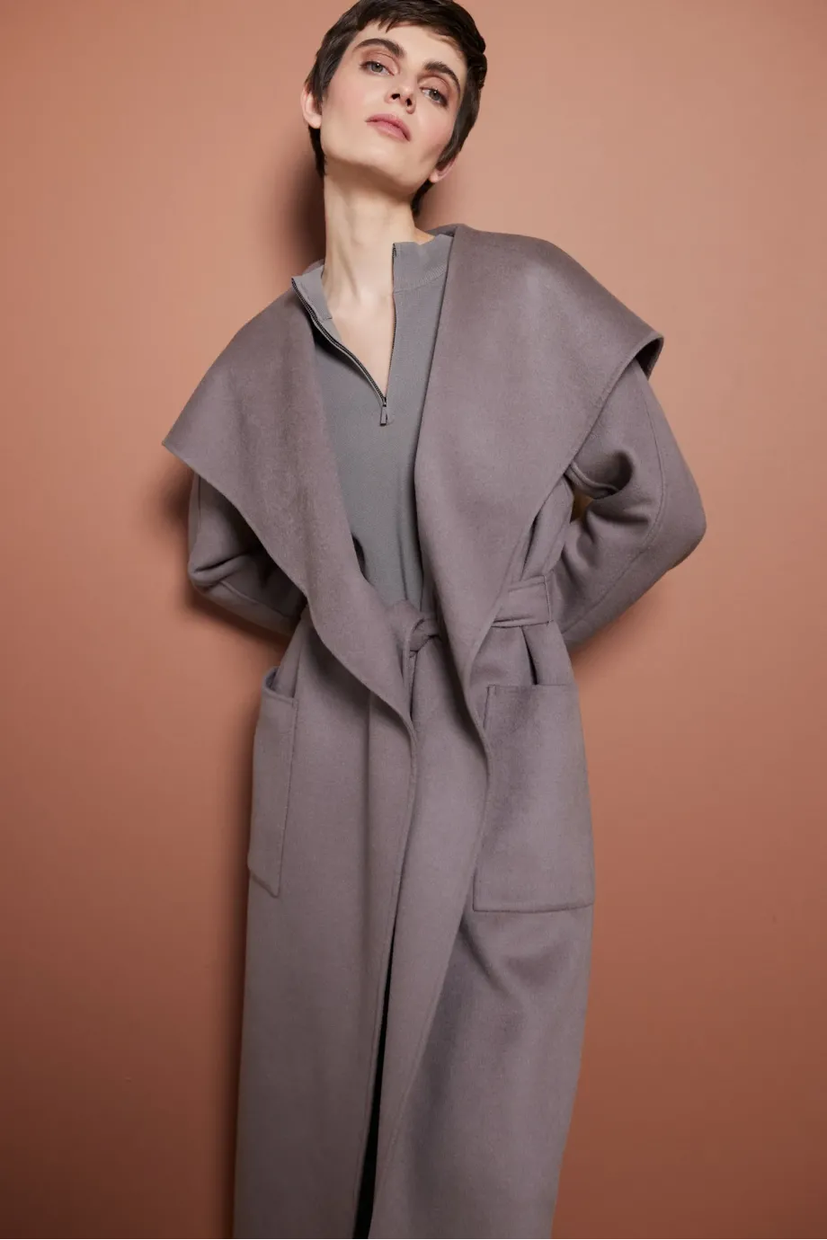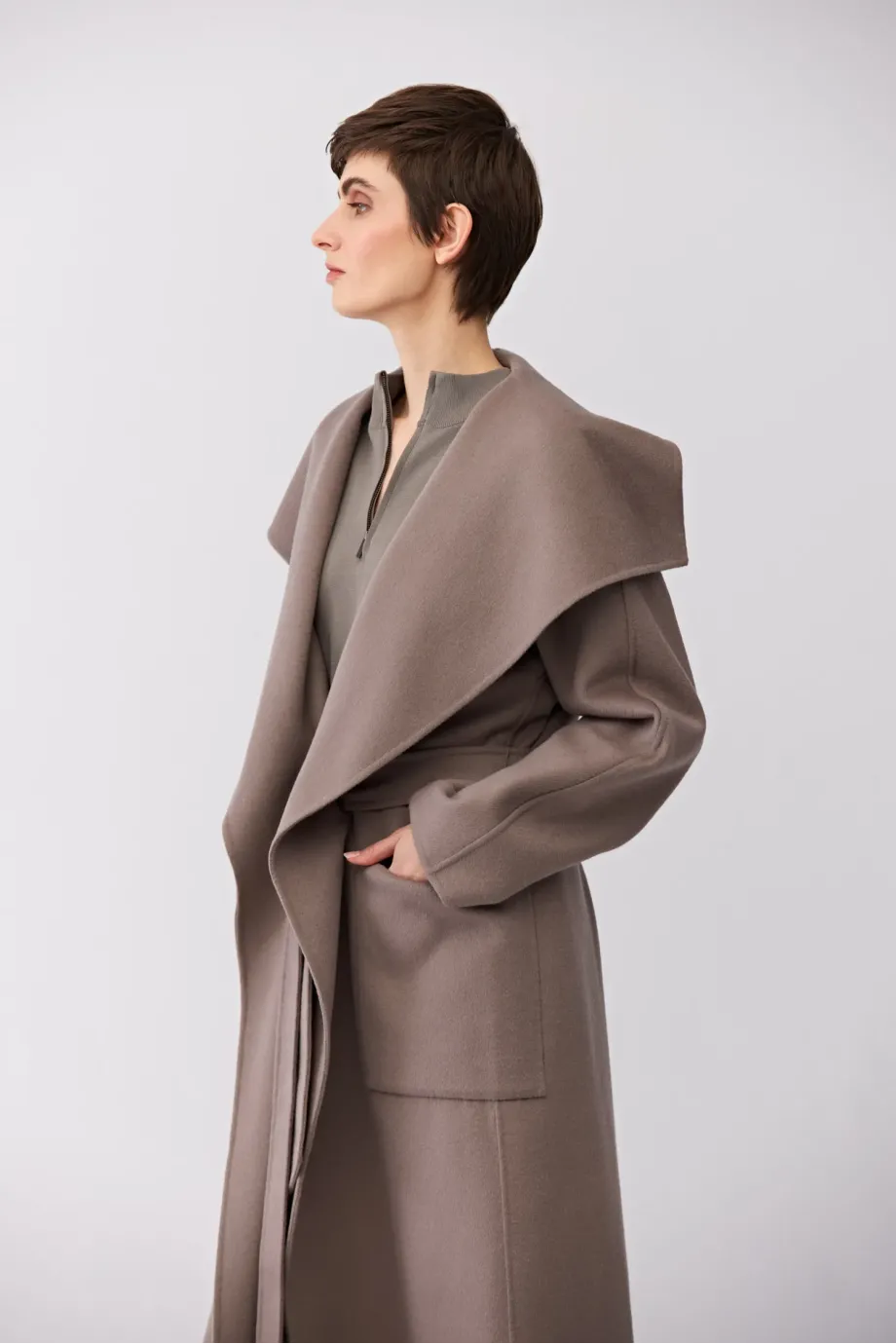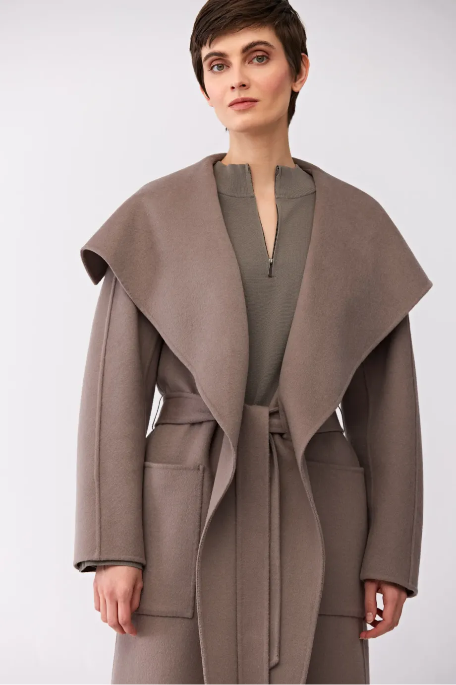 Doubleface kabát s hedvábím. Velký límec, dlouhý kimono rukáv. Kapsy. Zapínání na pásek. Midi délka. Barva taupe.