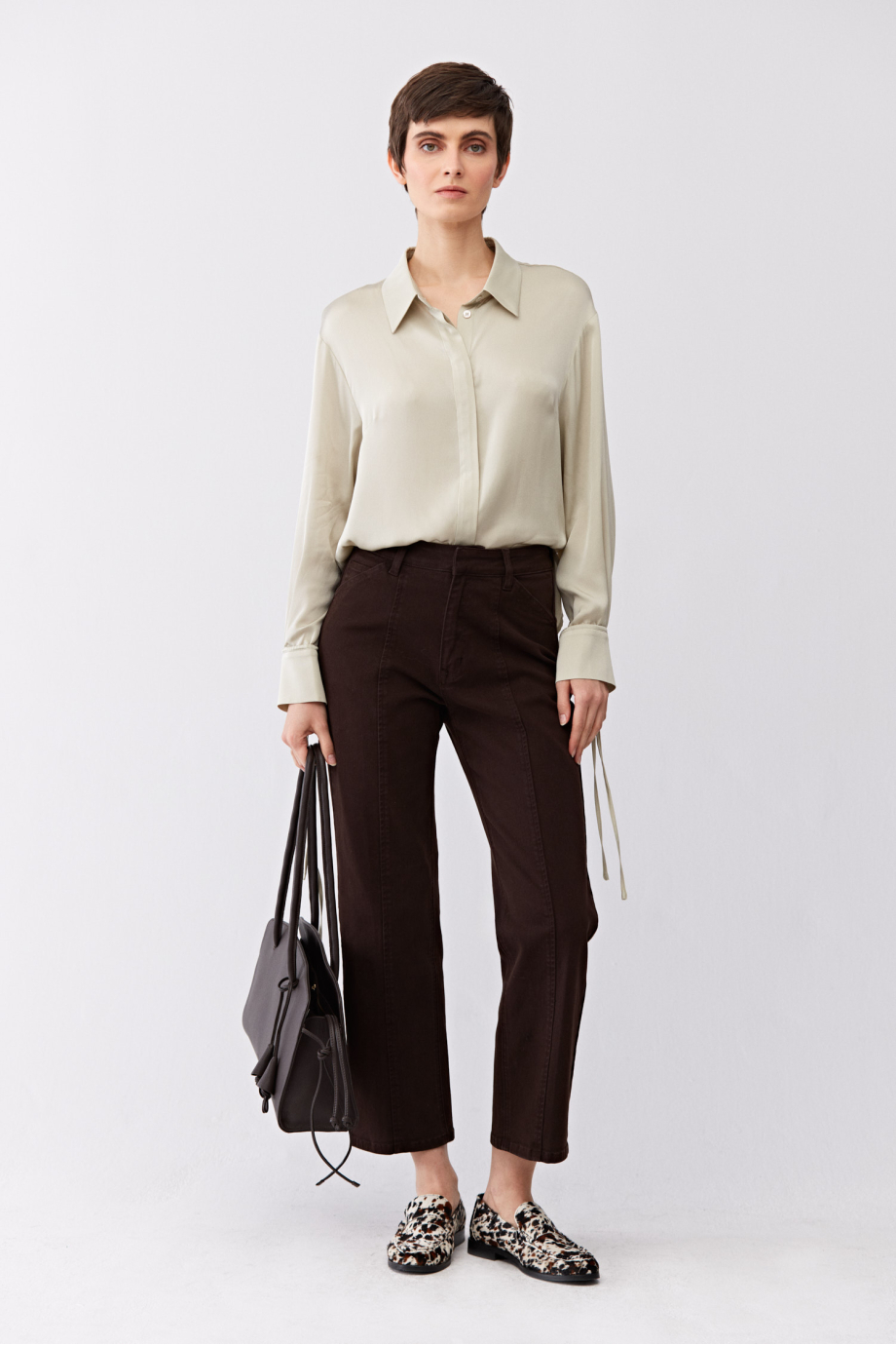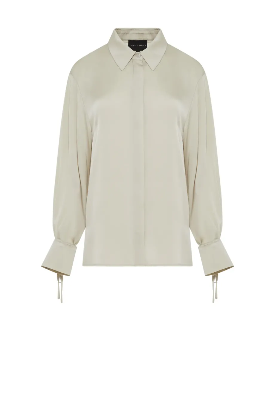 Halenka z hedvábí. Zapínání na knoflíky. Límec, dlouhý rukáv s ozdobným zavazováním. Barva světle zelená. Rovný, volný střih.