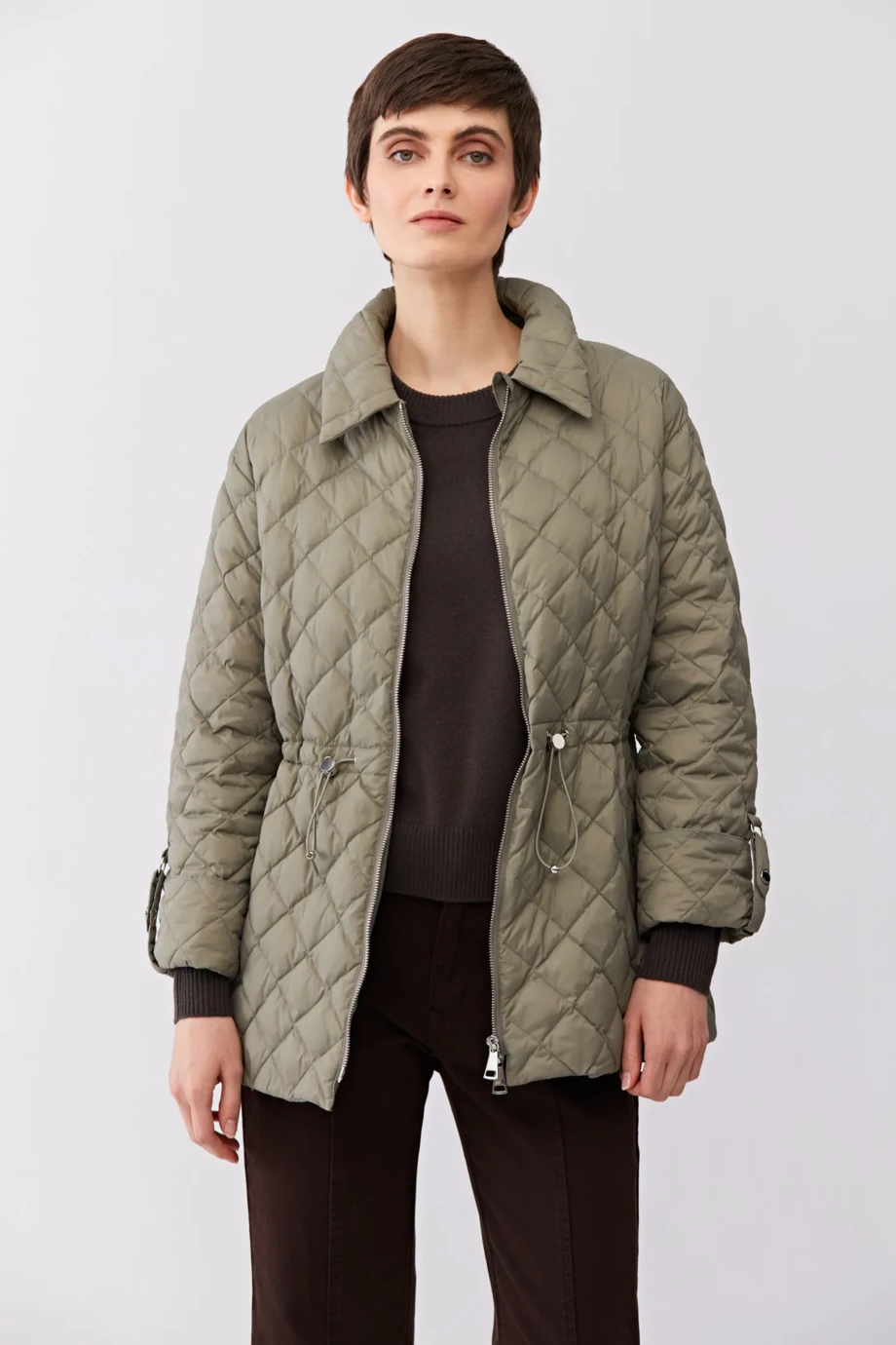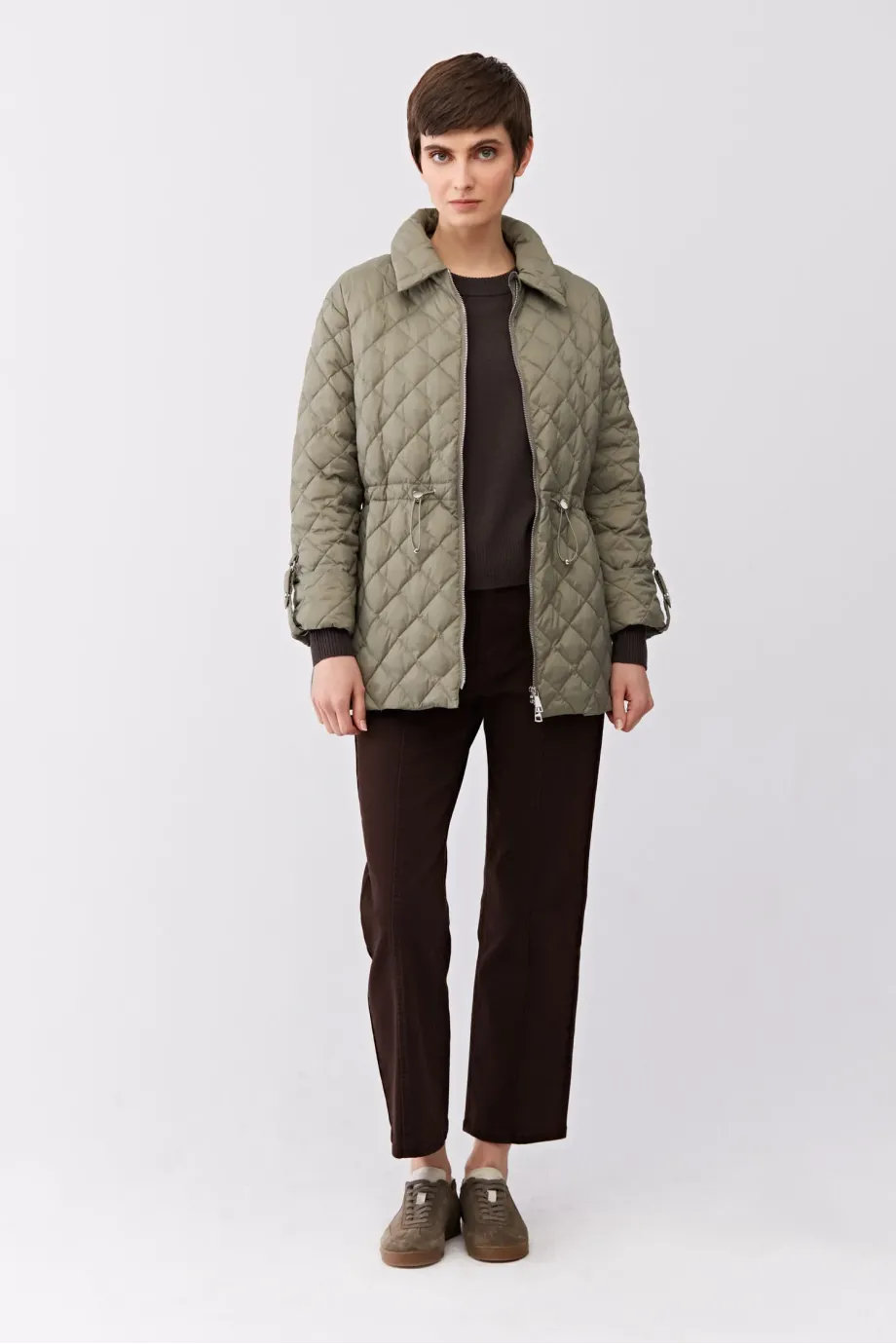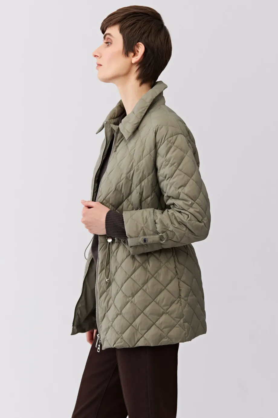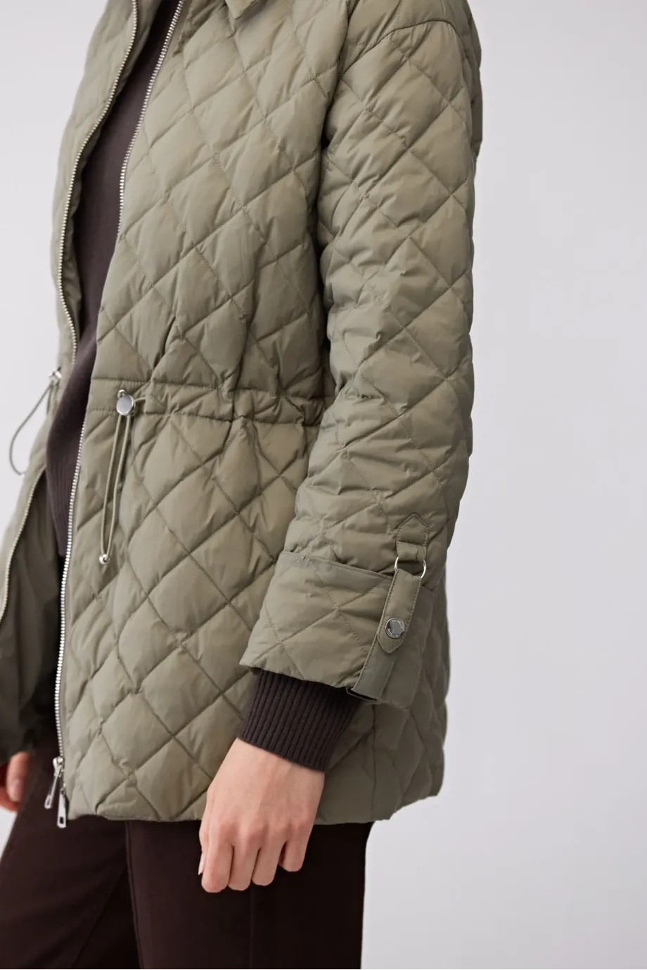 Péřová bunda s límcem. Zapínání na zip. Dlouhé rukávy s možností připnutí. Nastavení pasu. Kapsy. Barva světle zelená.