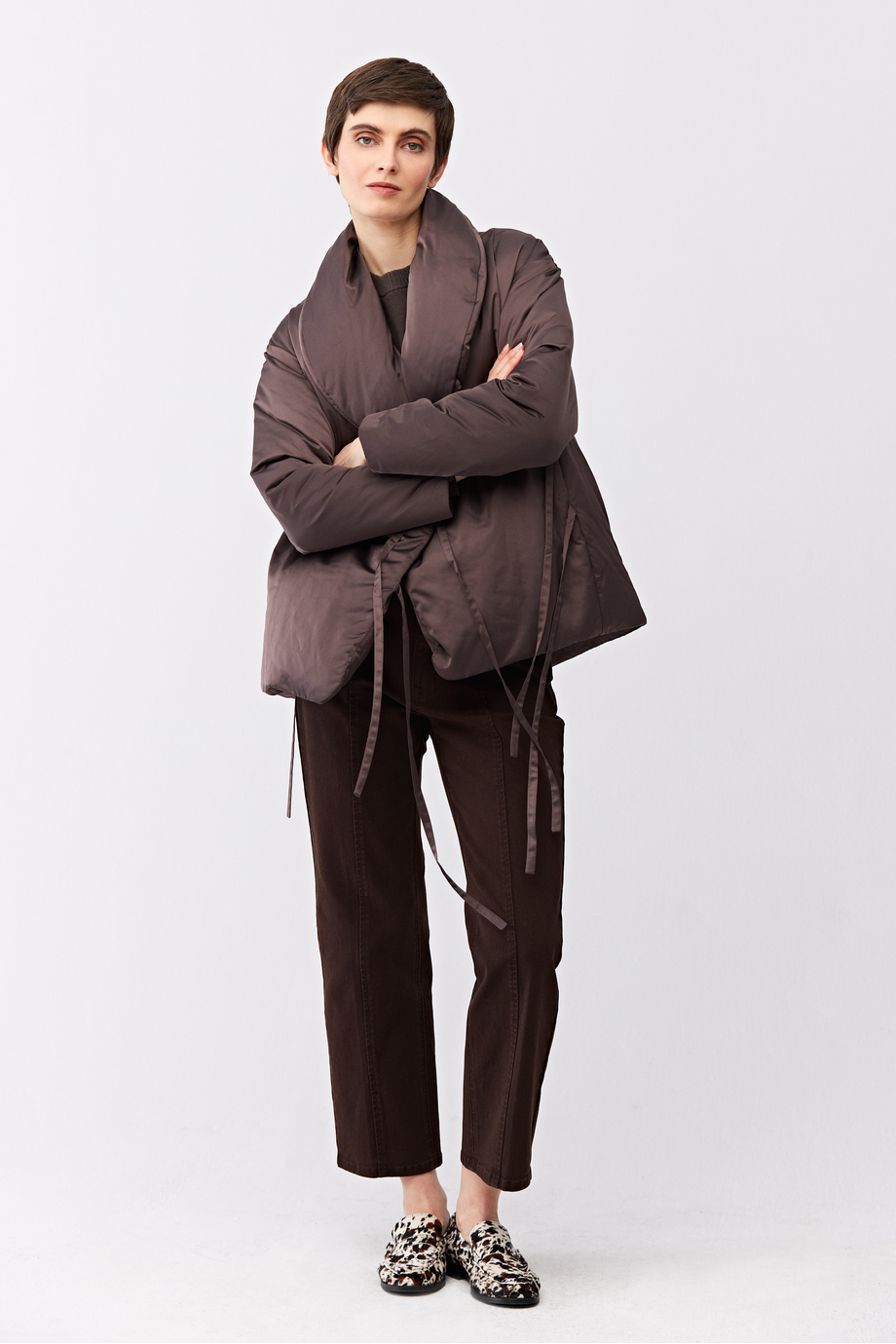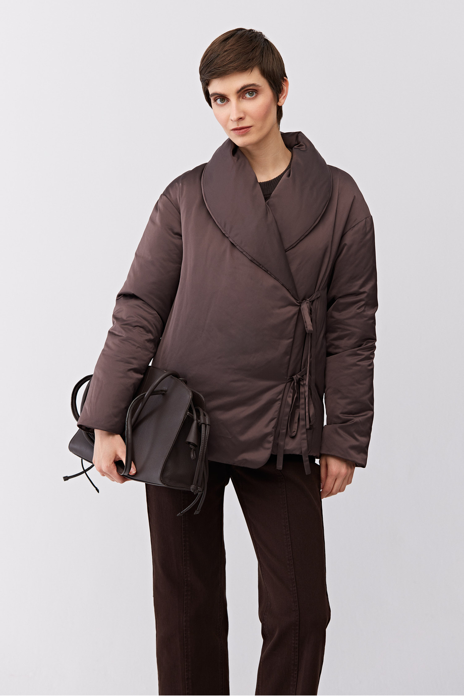 Bunda s přírodní výplní. Zavazovací zapínání. Šálový límec přecházející do stojáčku. Dlouhý rukáv. Jednoduchý, boxy střih. Hnědá barva.