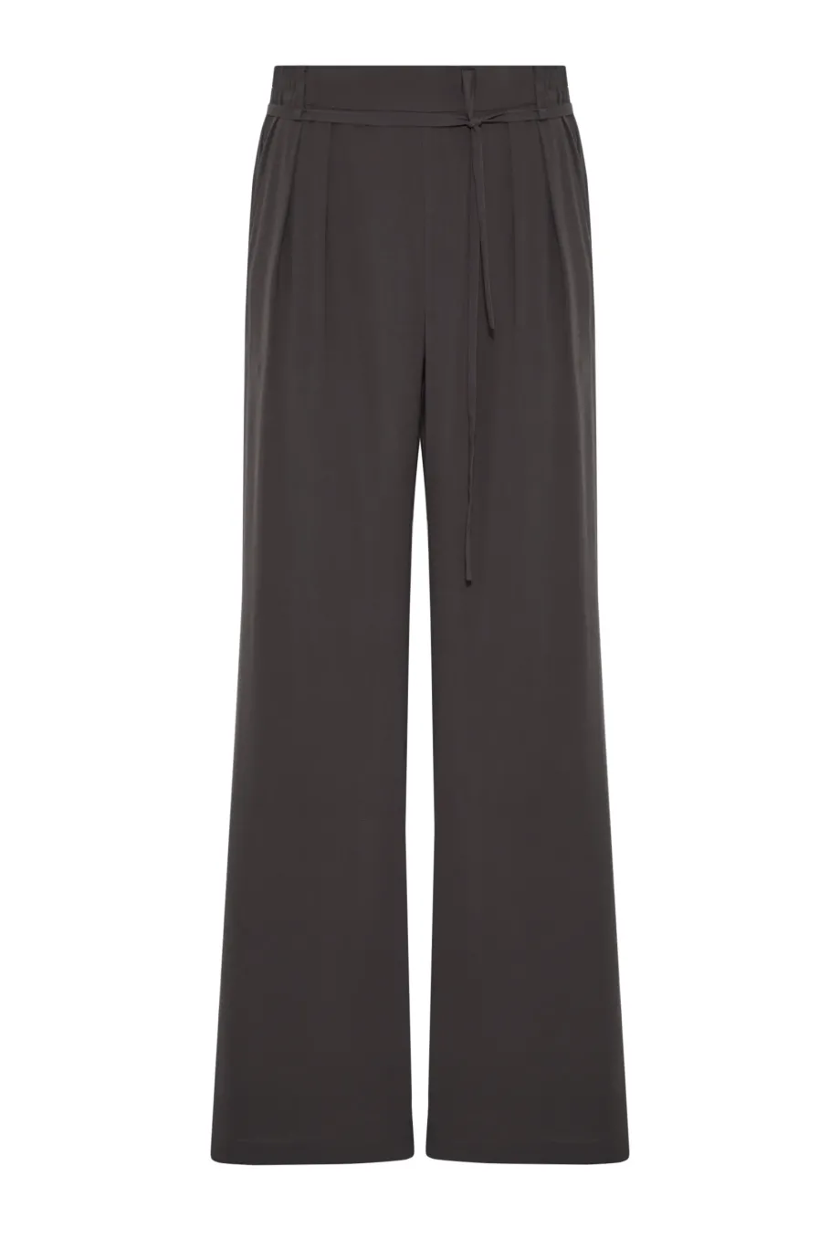 Kalhoty z hedvábí. Široká nohavice, záševky vytvářející volnost v oblasti boků. Kapsy. Tmavě šedá barva. Pro doplnění setu je k dispozici košile ze stejné tkaniny.