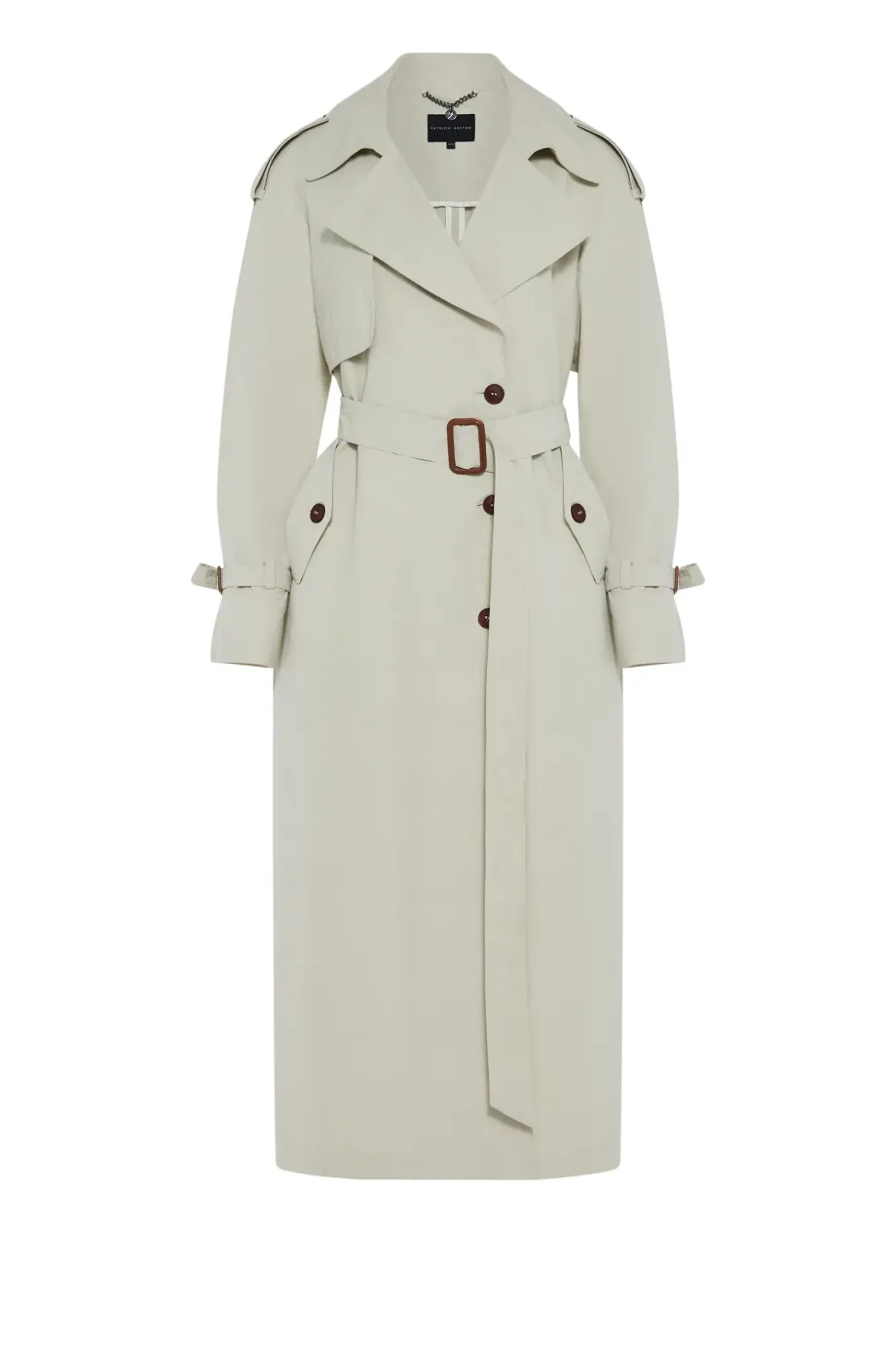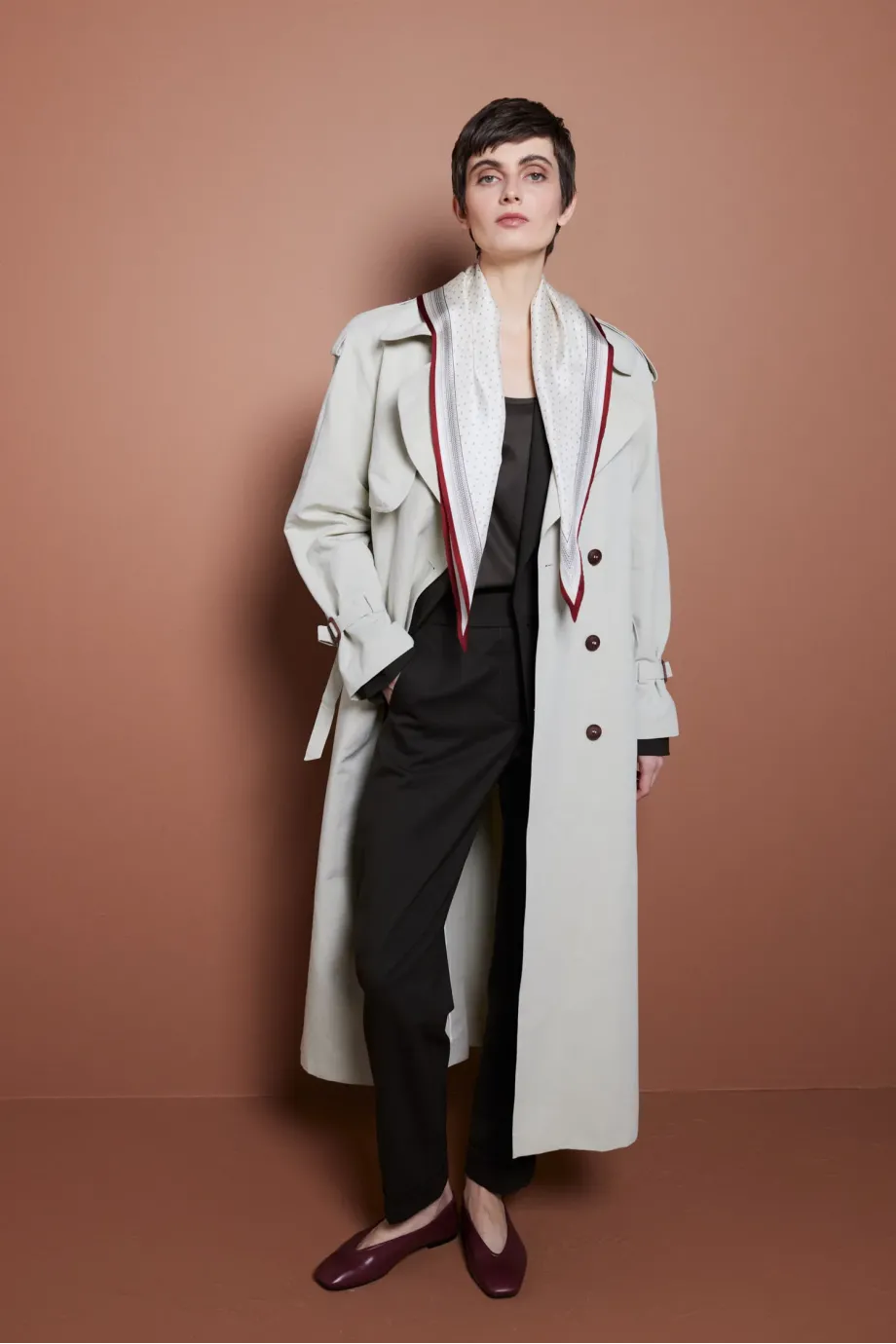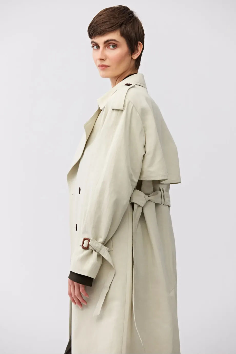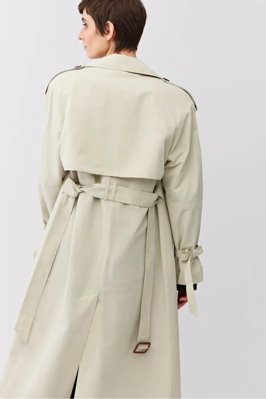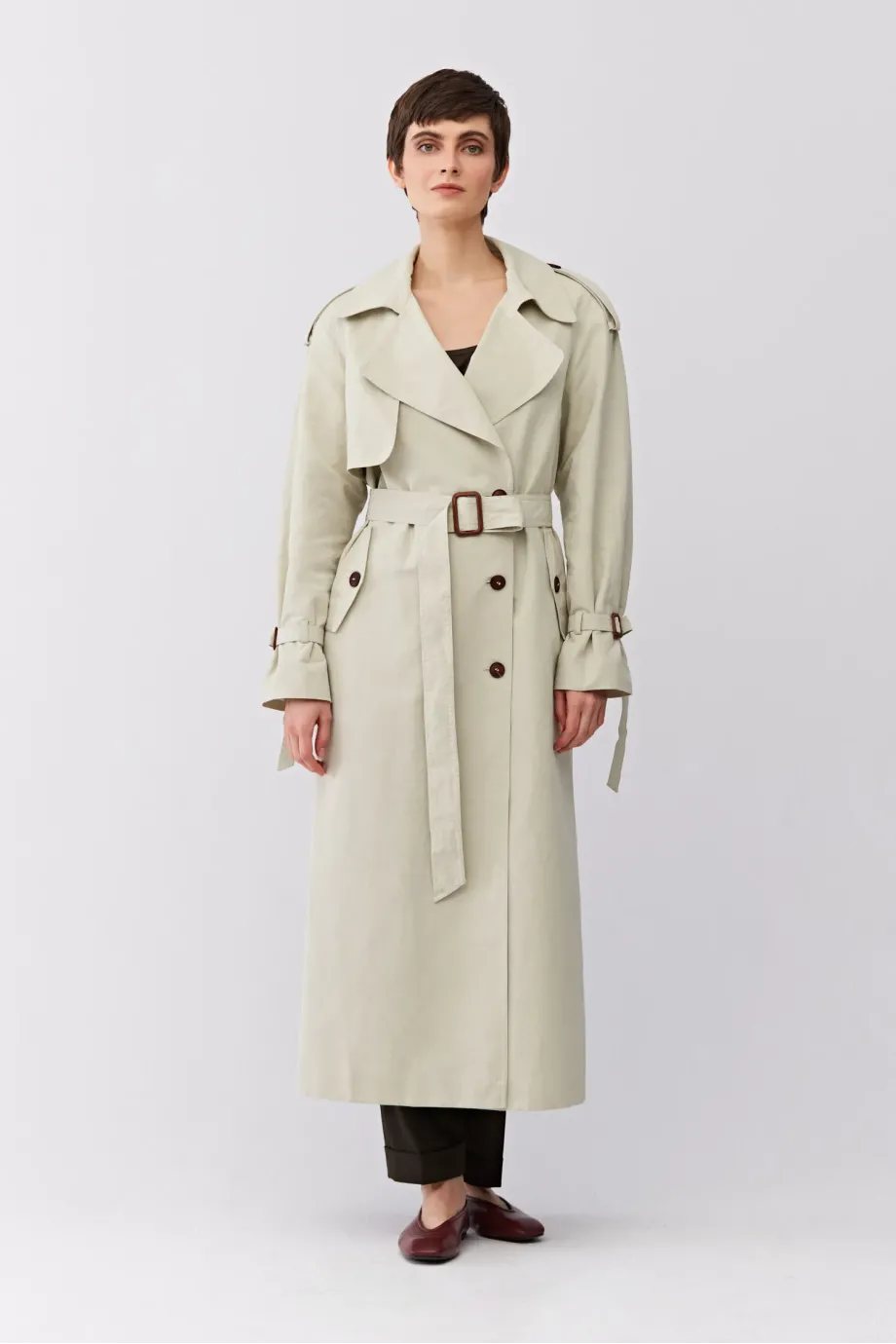Dlouhý trenčkot s páskem. Raglánové rukávy. Ušitý ze směsi bavlny a lnu. Pásek v pase. Límec, nárameníky na rukávech. Přírodní knoflíky. Kapsy.