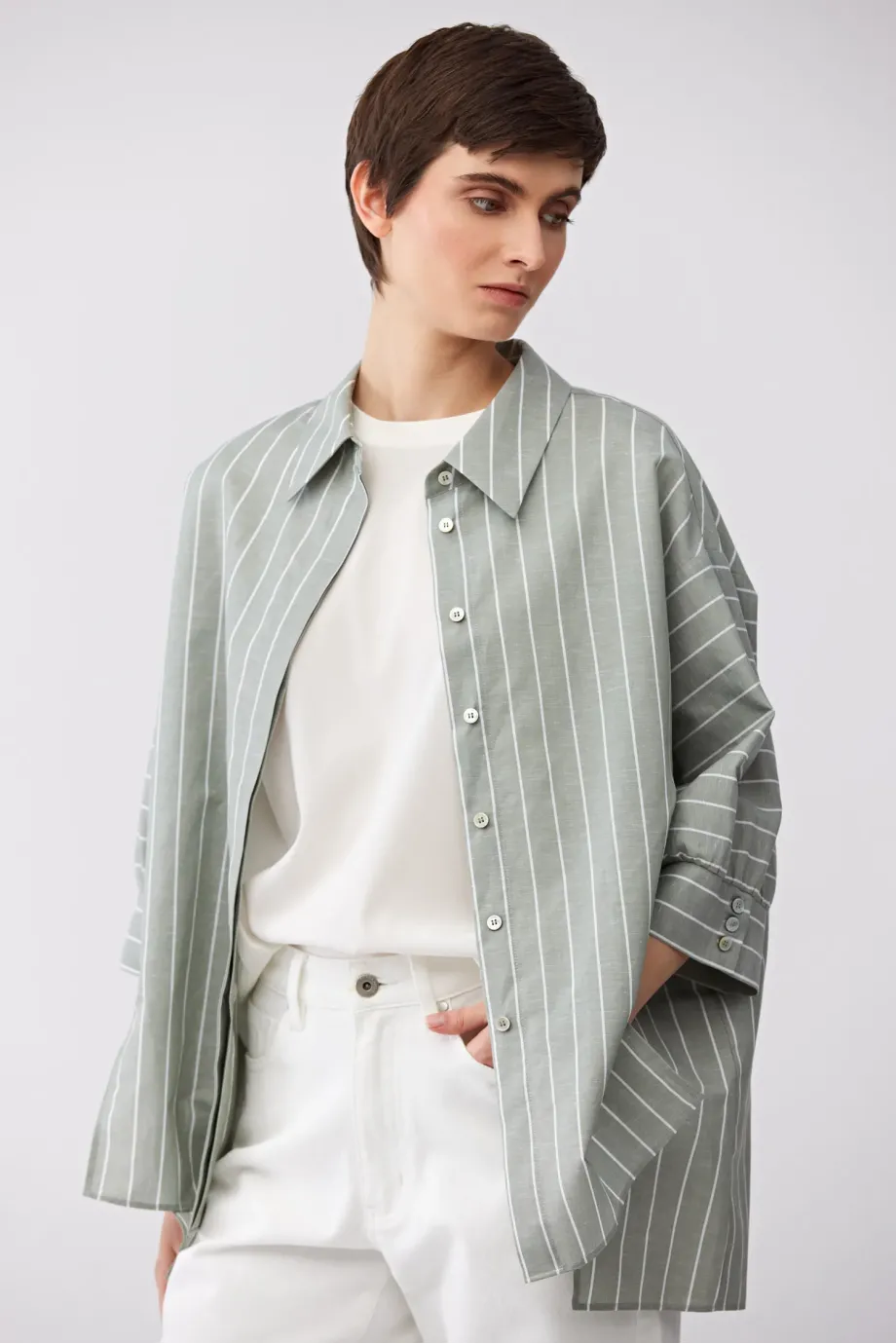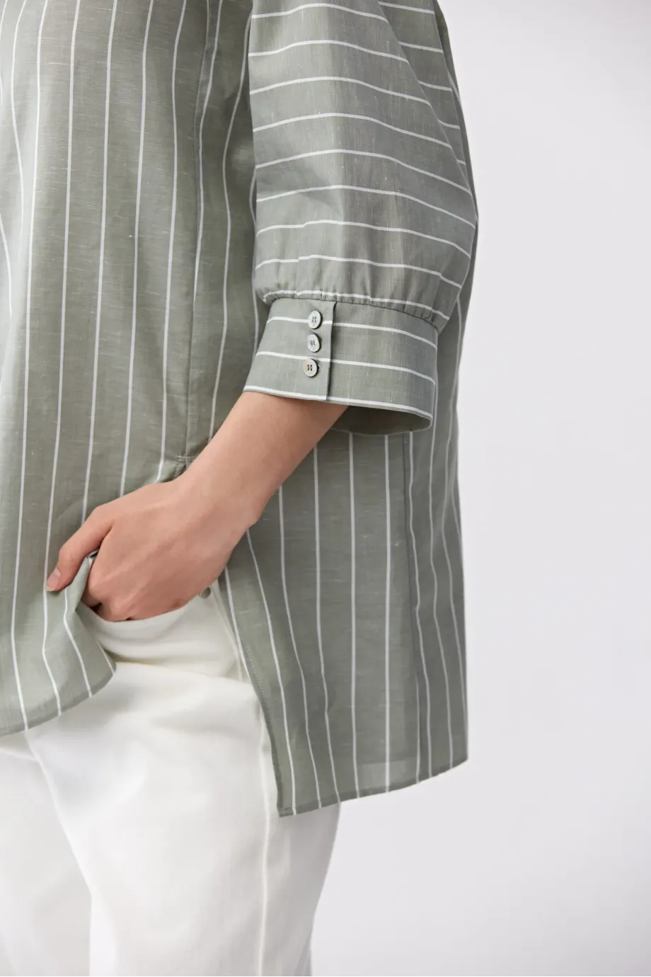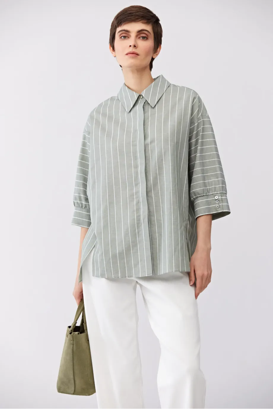 Volná košile ze směsi bavlny a lnu. Rovný střih. Zapínání na knoflíky. Límec. Rukáv v délce 3/4. Barva světle zelená.