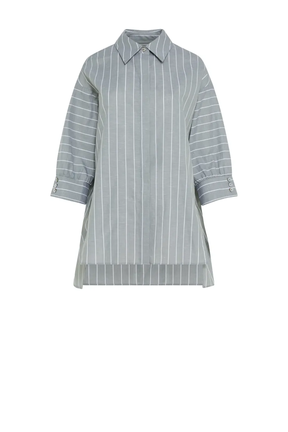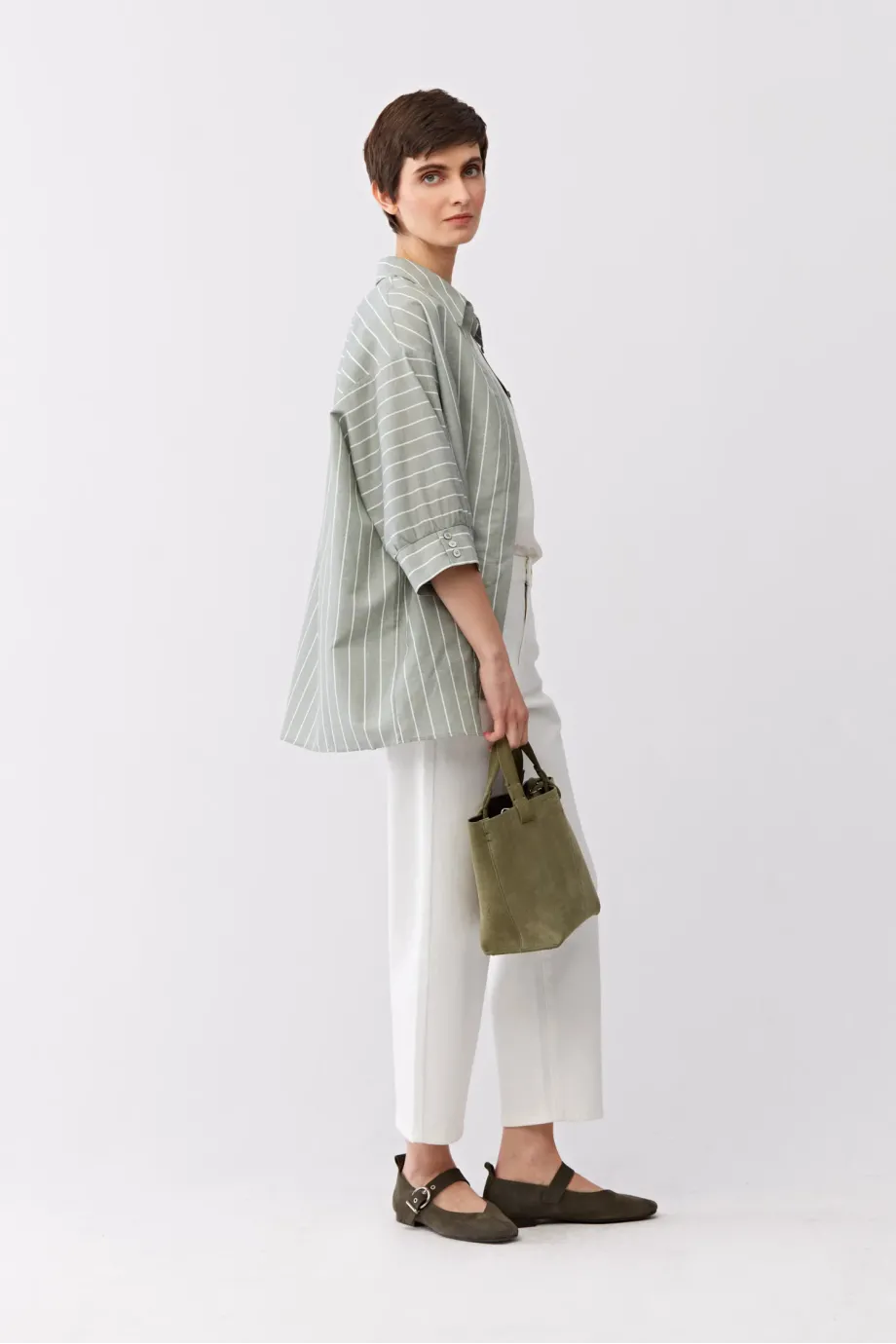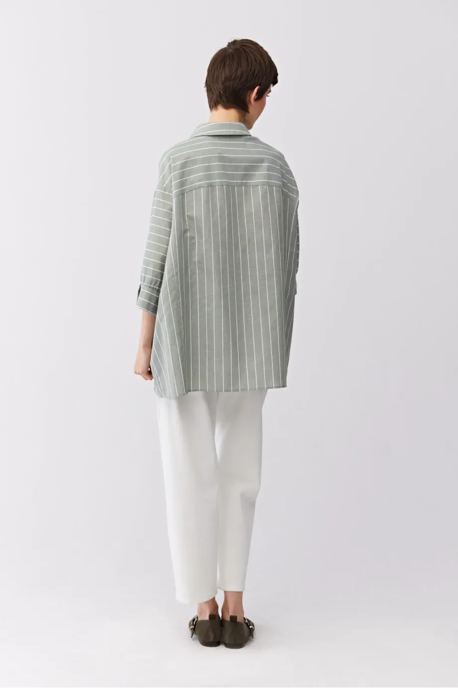 Volná košile ze směsi bavlny a lnu. Rovný střih. Zapínání na knoflíky. Límec. Rukáv v délce 3/4. Barva světle zelená.