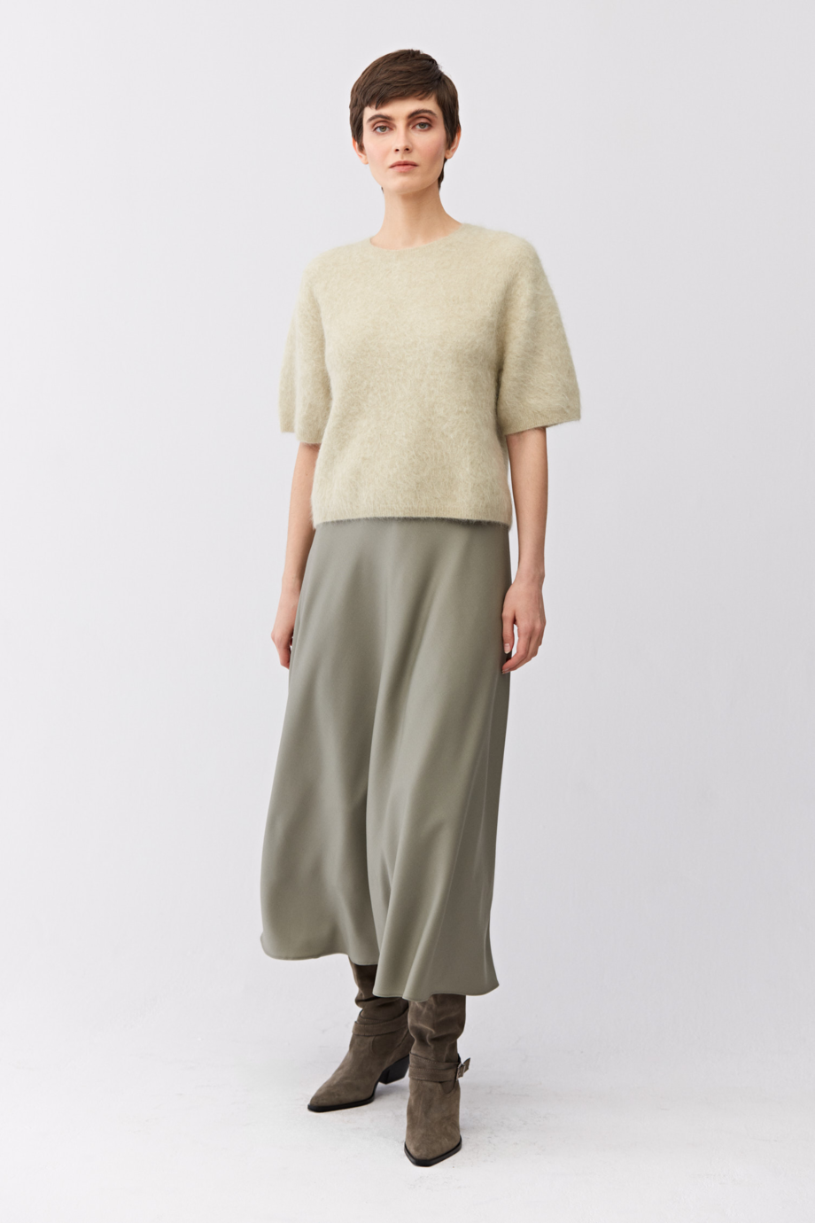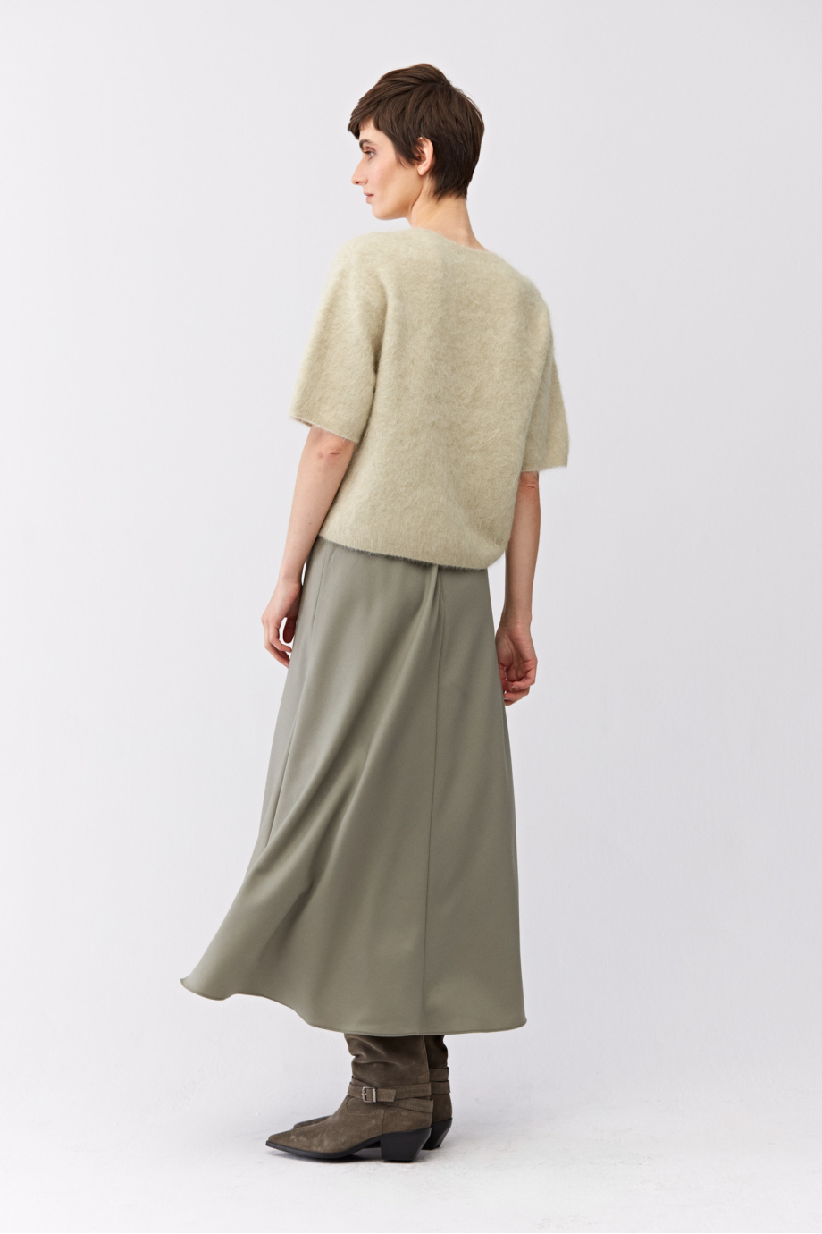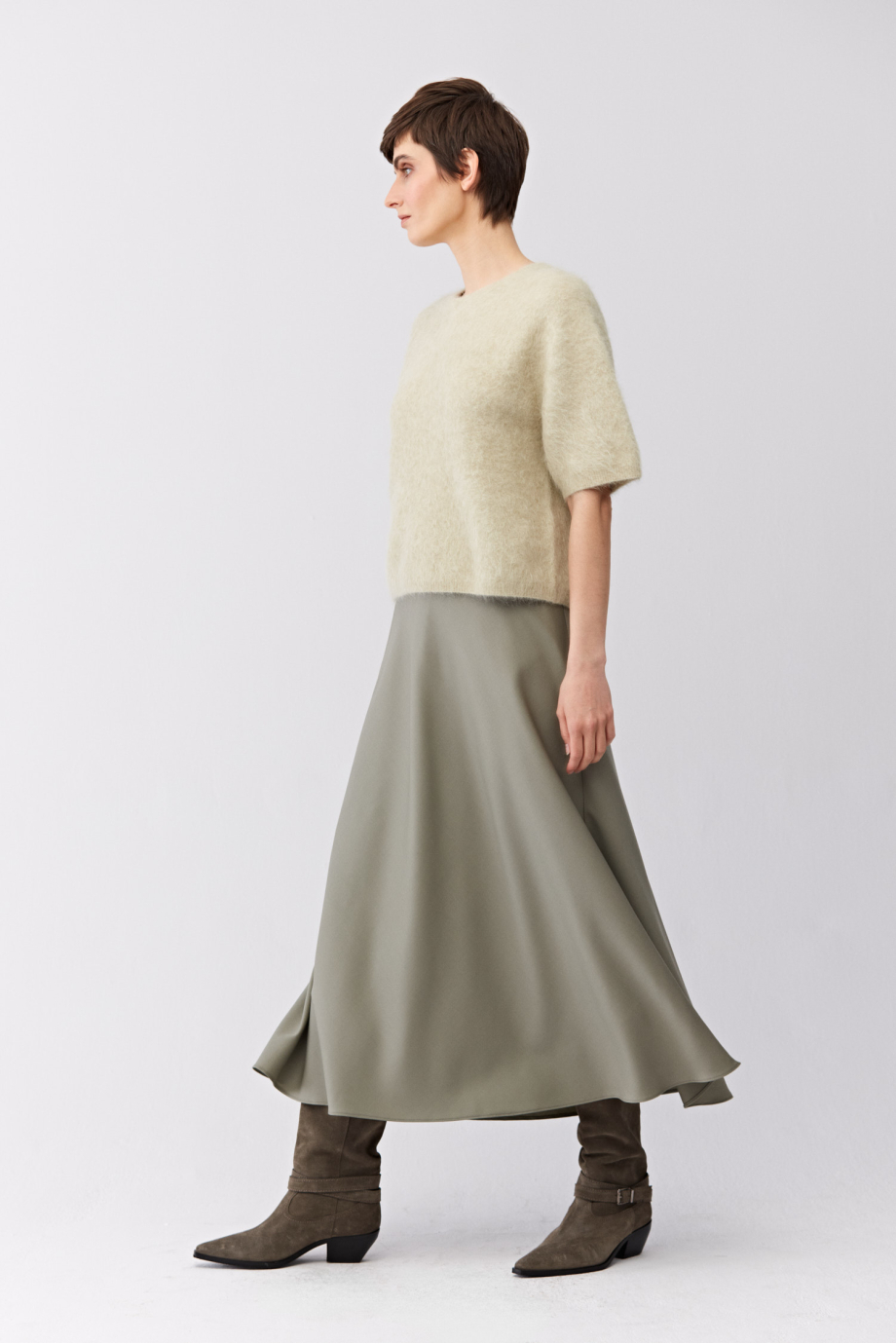 Vlněná midi sukně. Boční zapínání na zip a knoflík. Volný střih. Barva světle zelená.