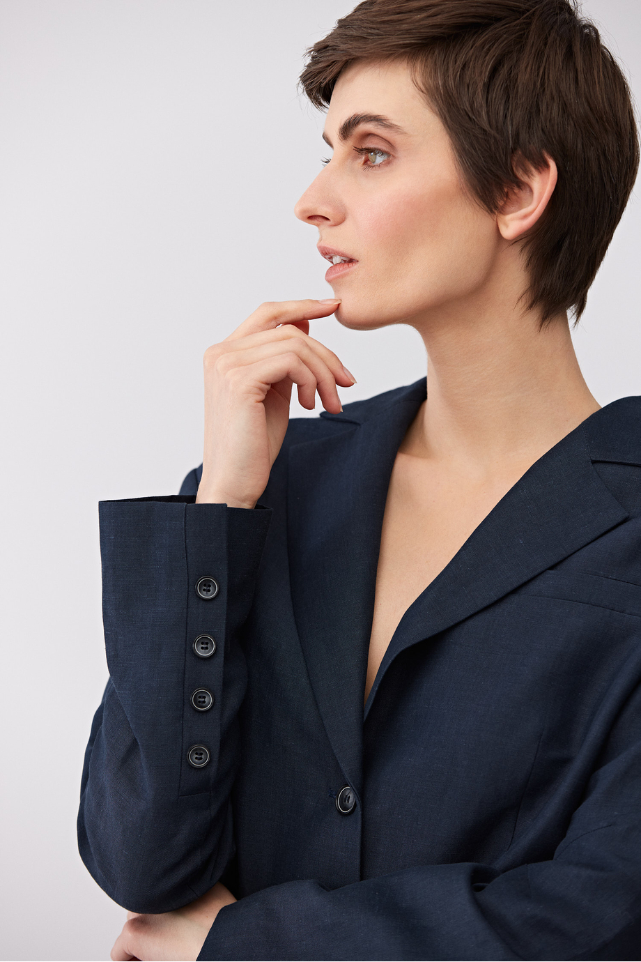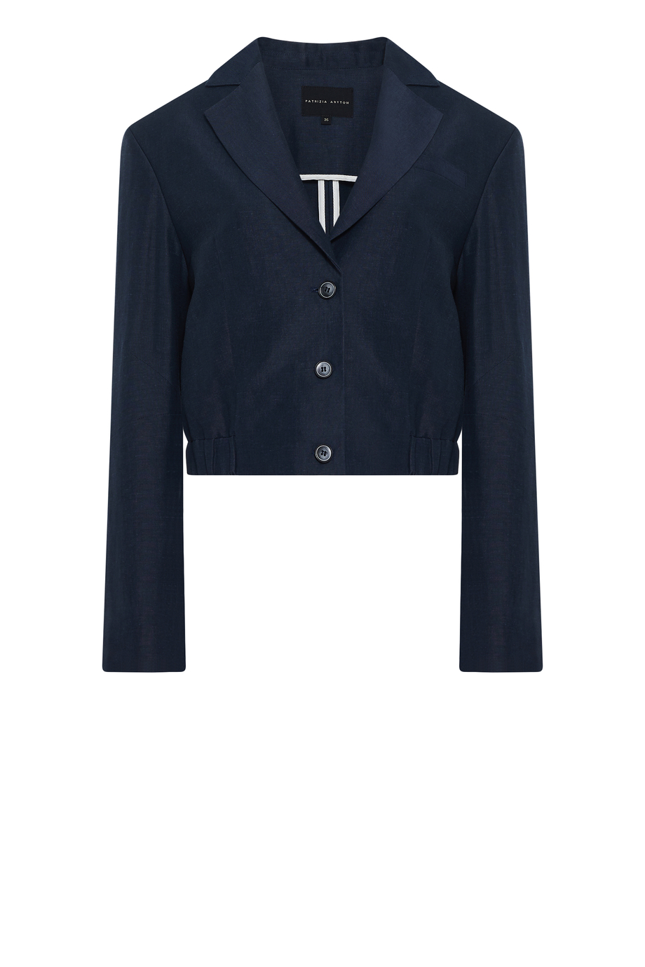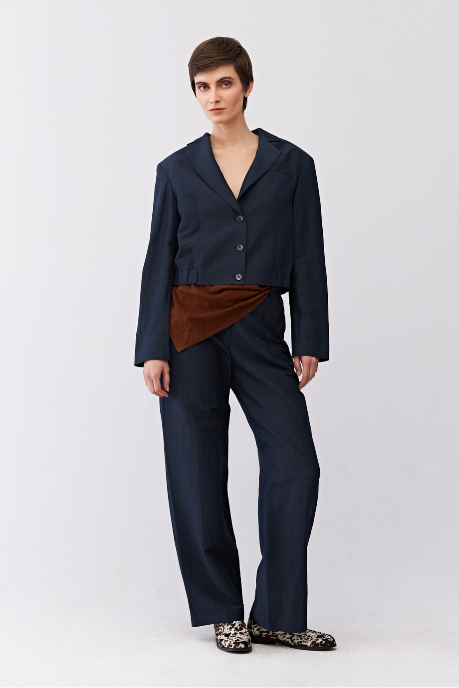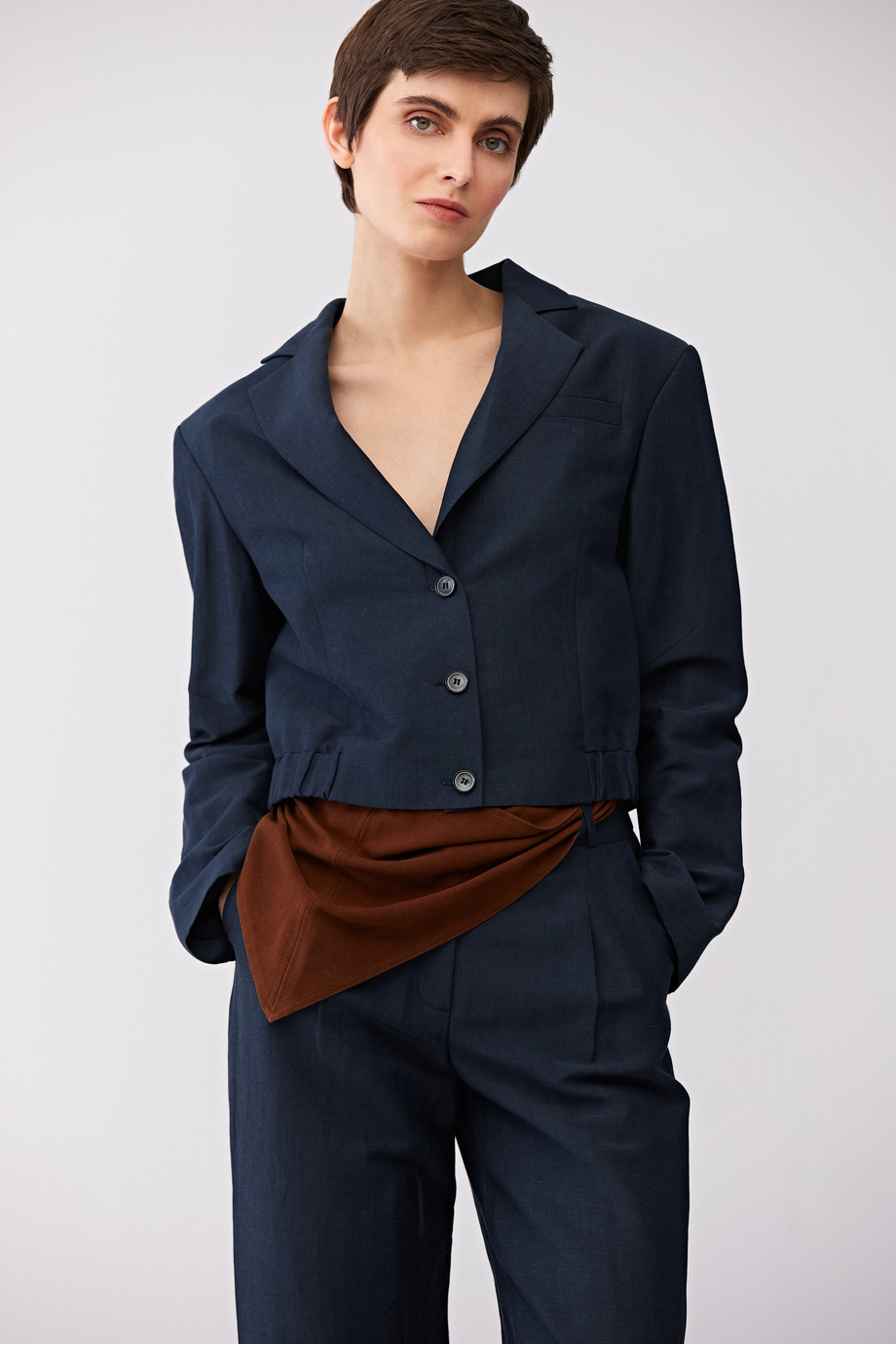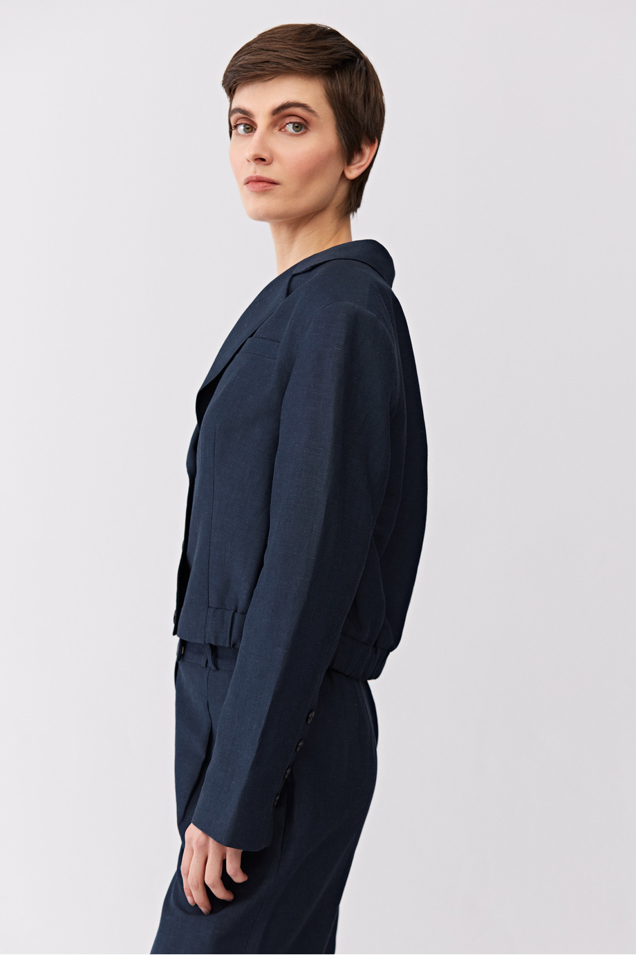 Jednořadé sako z panenské vlny a lnu. Boxy střih, dlouhý rukáv, zapínání na knoflíky. Kapsy. Model s podšívkou, s ozdobným prošitím a lemováním uvnitř. Tmavě modrá barva. Pro doplnění kompletu jsou k dispozici kalhoty ze stejné tkaniny.