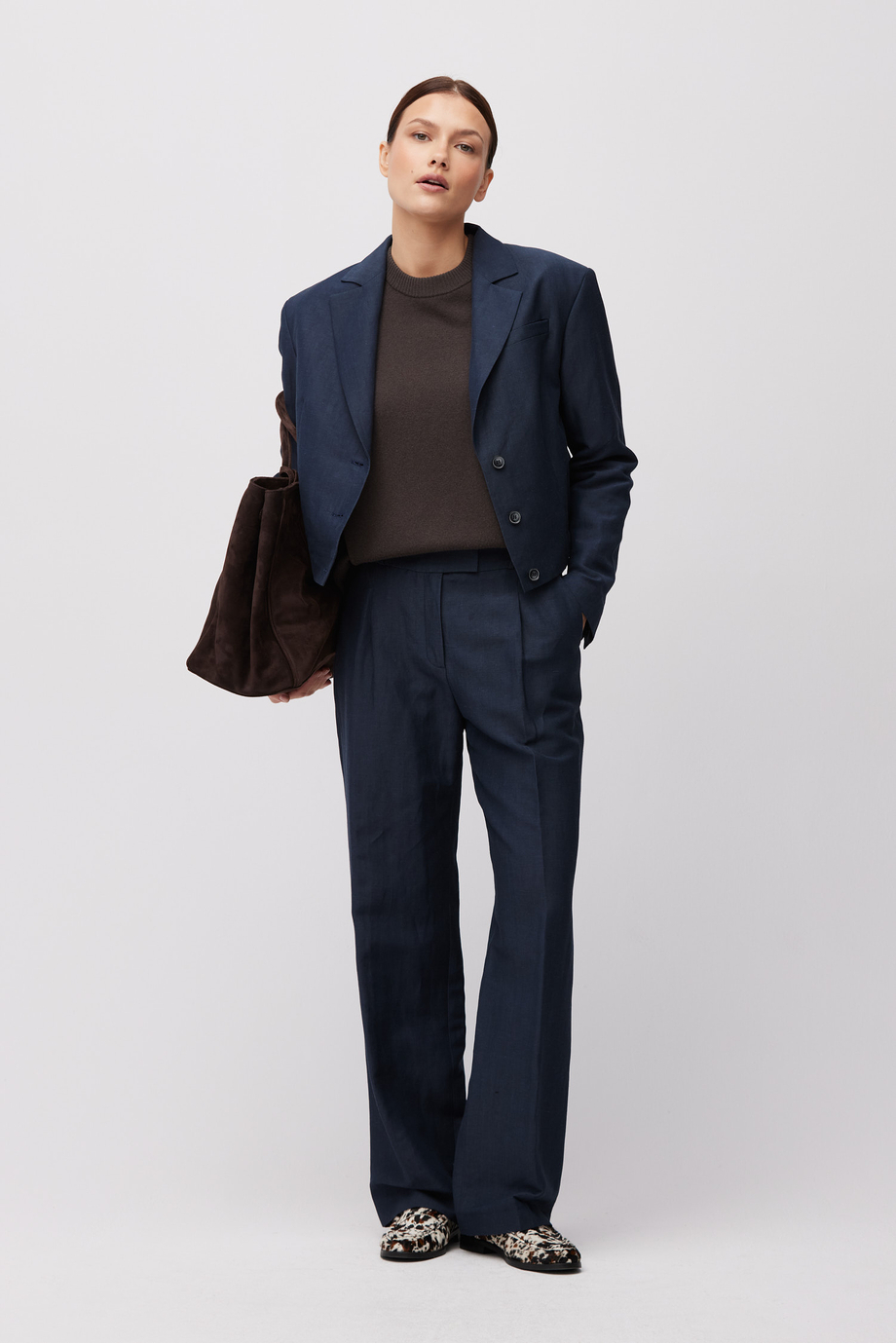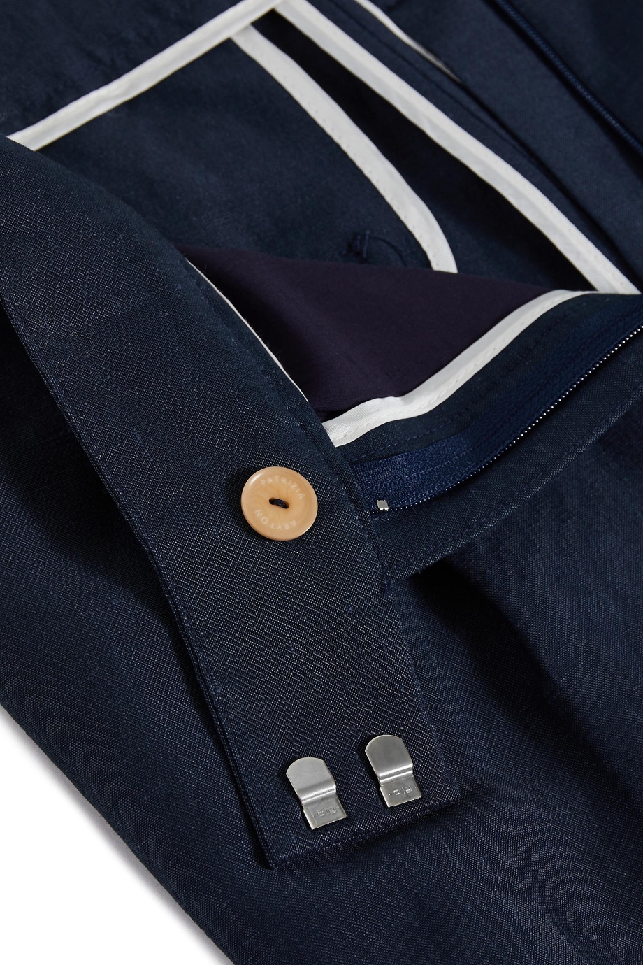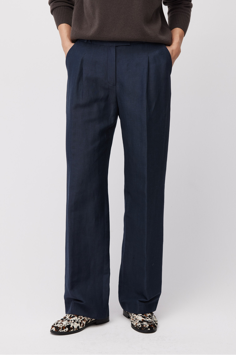 Kalhoty s vysokým pasem ze směsi vlny a lnu. Široká nohavice, sklady, zapínání na zip, háček a vnitřní corozo knoflík. Vnitřní část s ozdobným lemováním. Kapsy a poutka na pásek. Tmavě modrá barva. Pro doplnění kompletu je k dispozici sako ze stejné tkaniny.