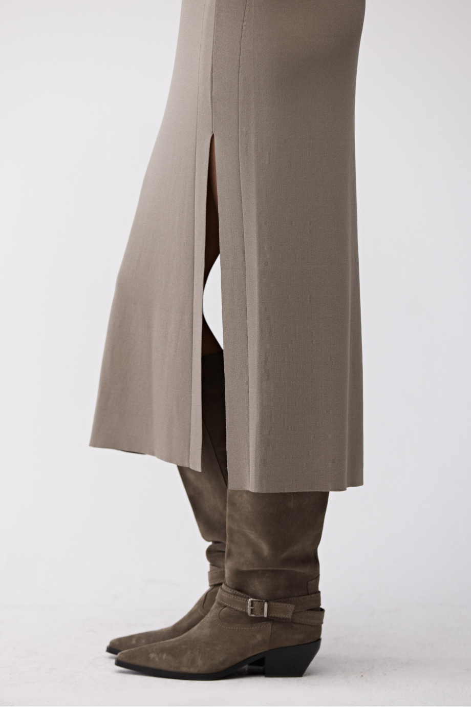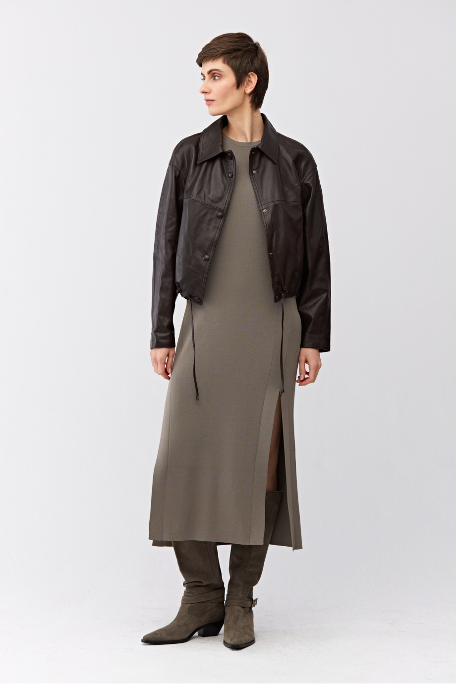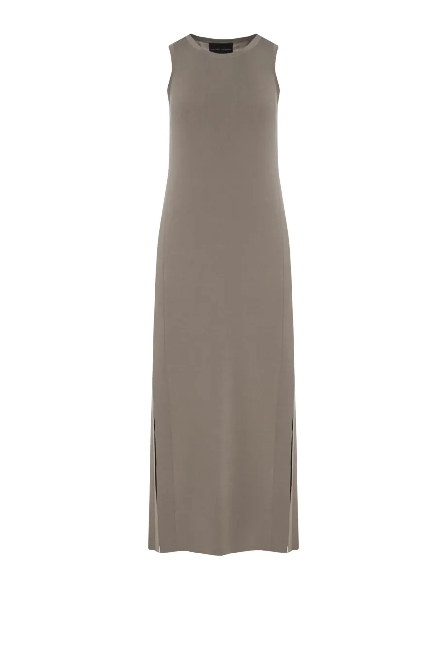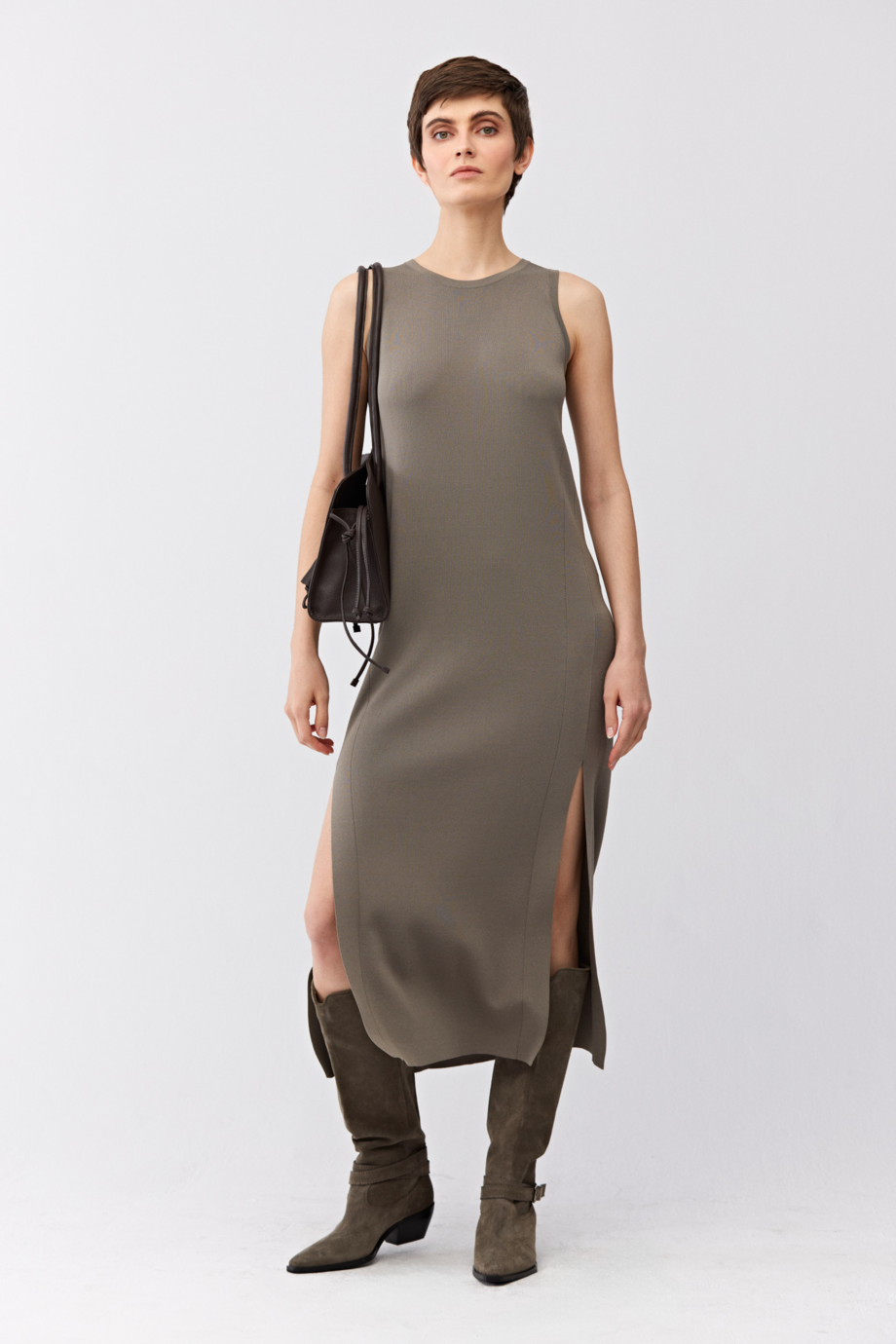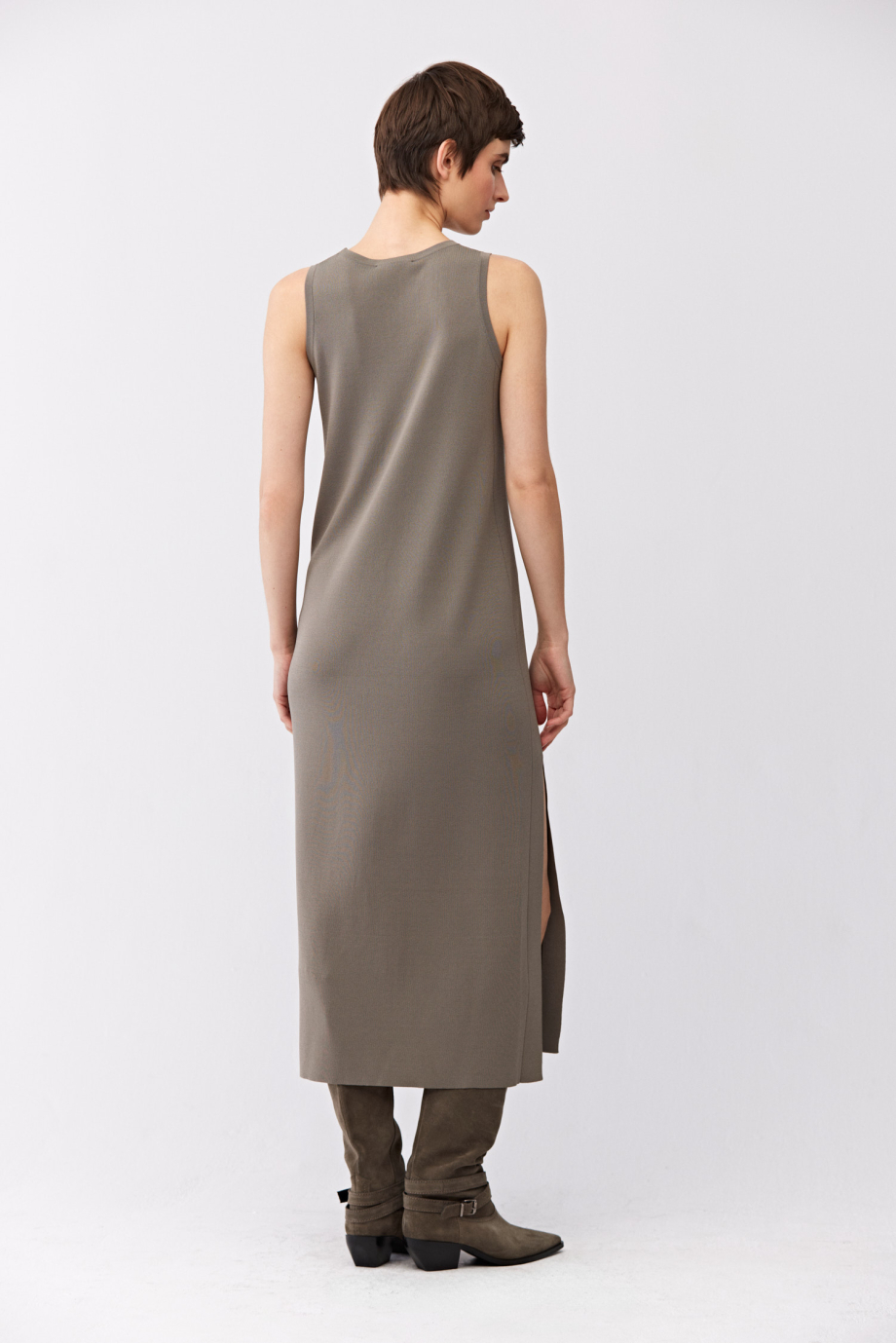 Zelené midi šaty bez rukávů. Měkký, splývavý úplet, vyrobený vazbou rib 1x1 na stroji s jemností 14 GG. Rozparky po stranách.