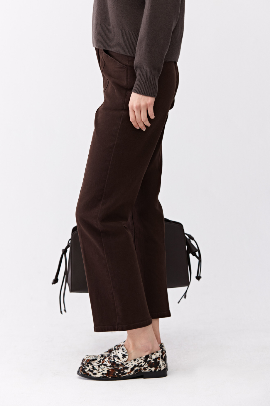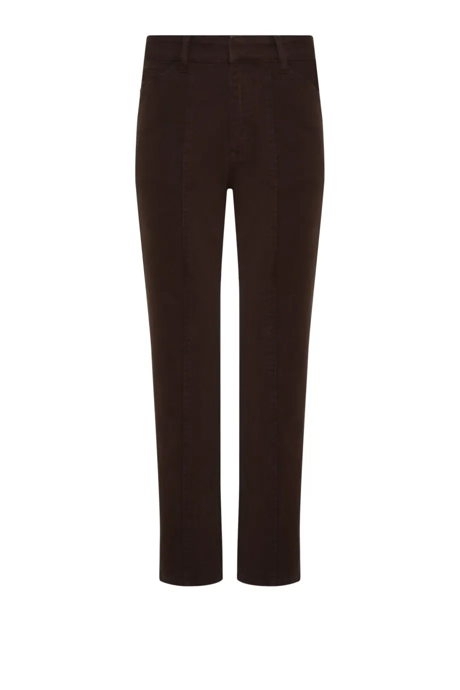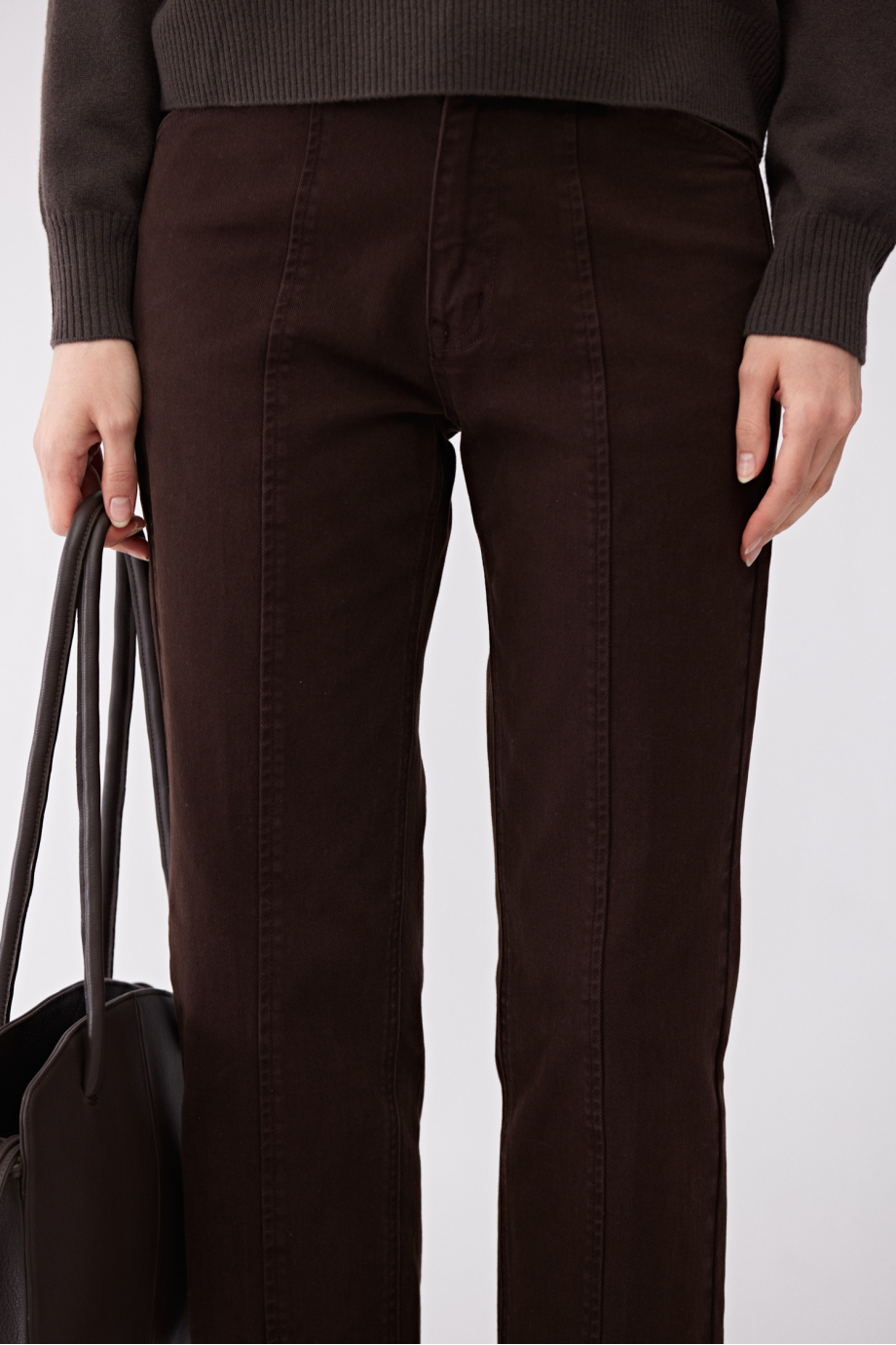 Džíny s rovným střihem a dekorativním prošitím. Vysoký pas. Zapínání na zip a kovový knoflík. Vyrobeny z bavlny s příměsí elastanu – měkké a pohodlné na nošení. Hnědá barva.