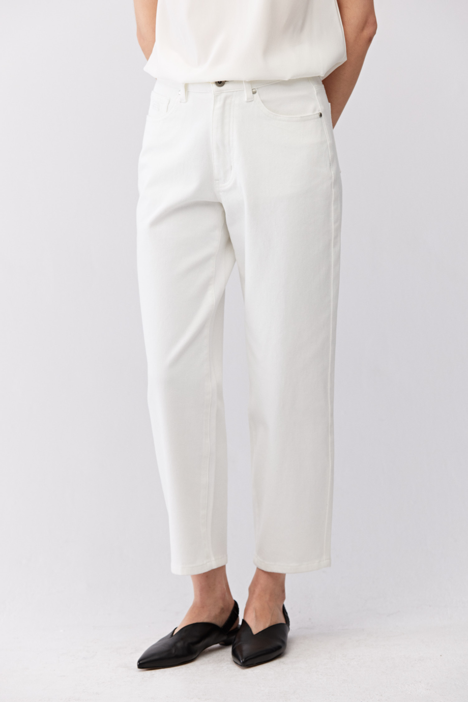 Džíny v barrel střihu. Klasický pěti kapsový design. Vysoký pas. Zapínání na zip a kovový knoflík. Vyrobeny z bavlny s příměsí elastanu – měkké a pohodlné na nošení. Bílá barva.