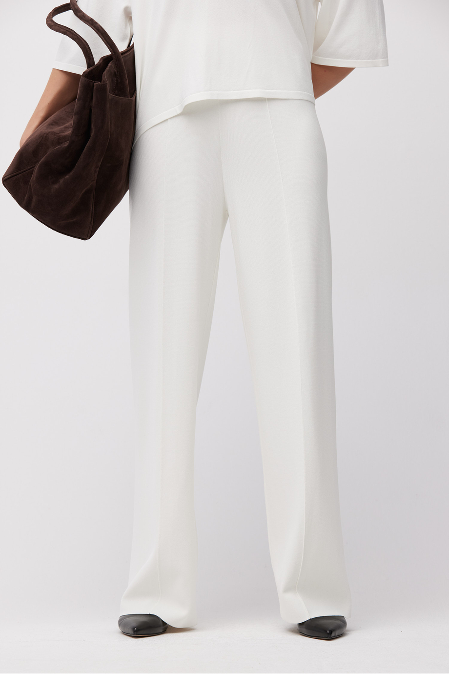Bílé kalhoty se širokou nohavicí. Měkký úplet s jemnou strukturou, vyrobený na pletacím stroji jemnosti 16 GG. Pro doplnění kompletu je k dispozici mikina ze stejného úpletu.